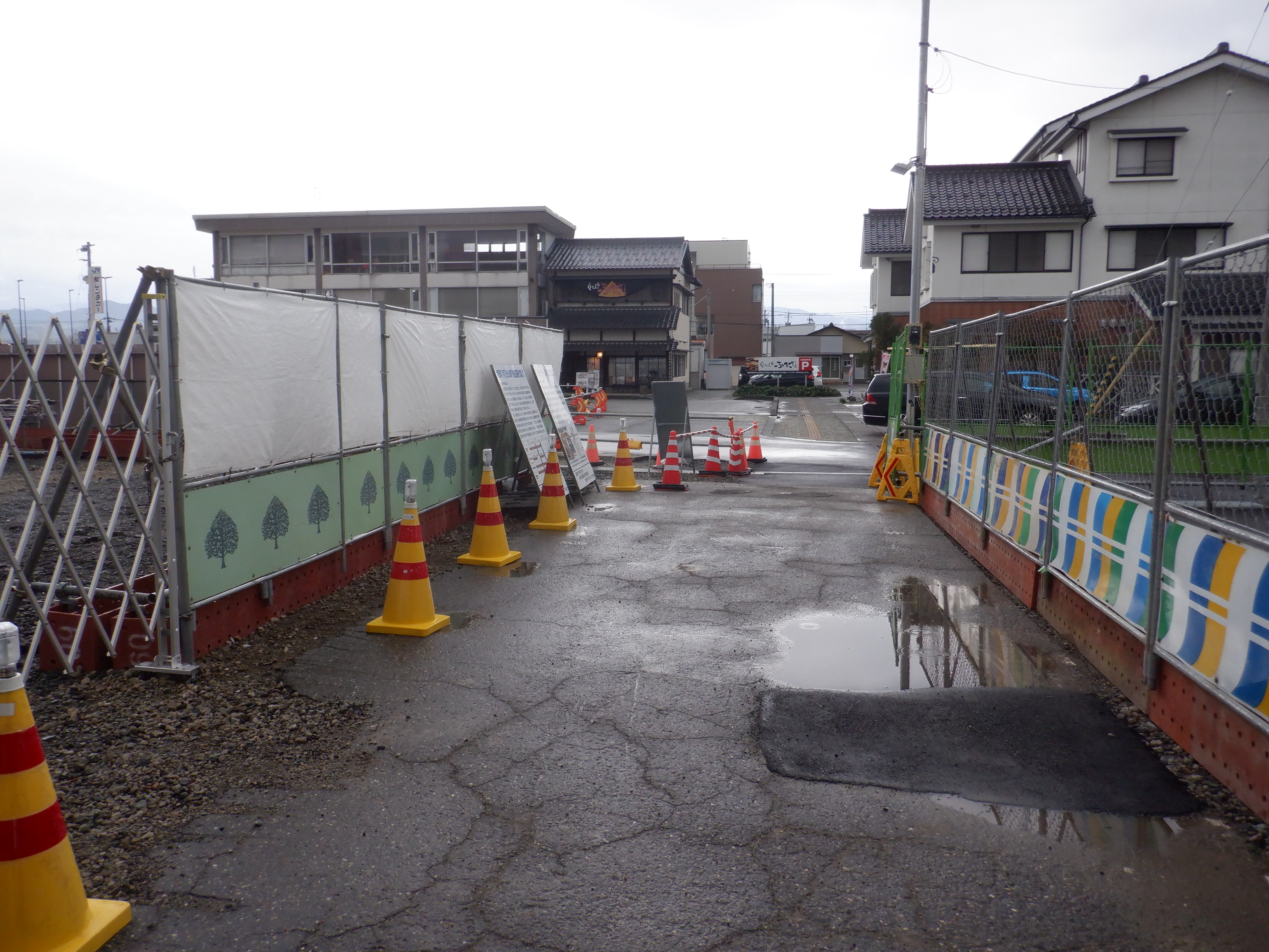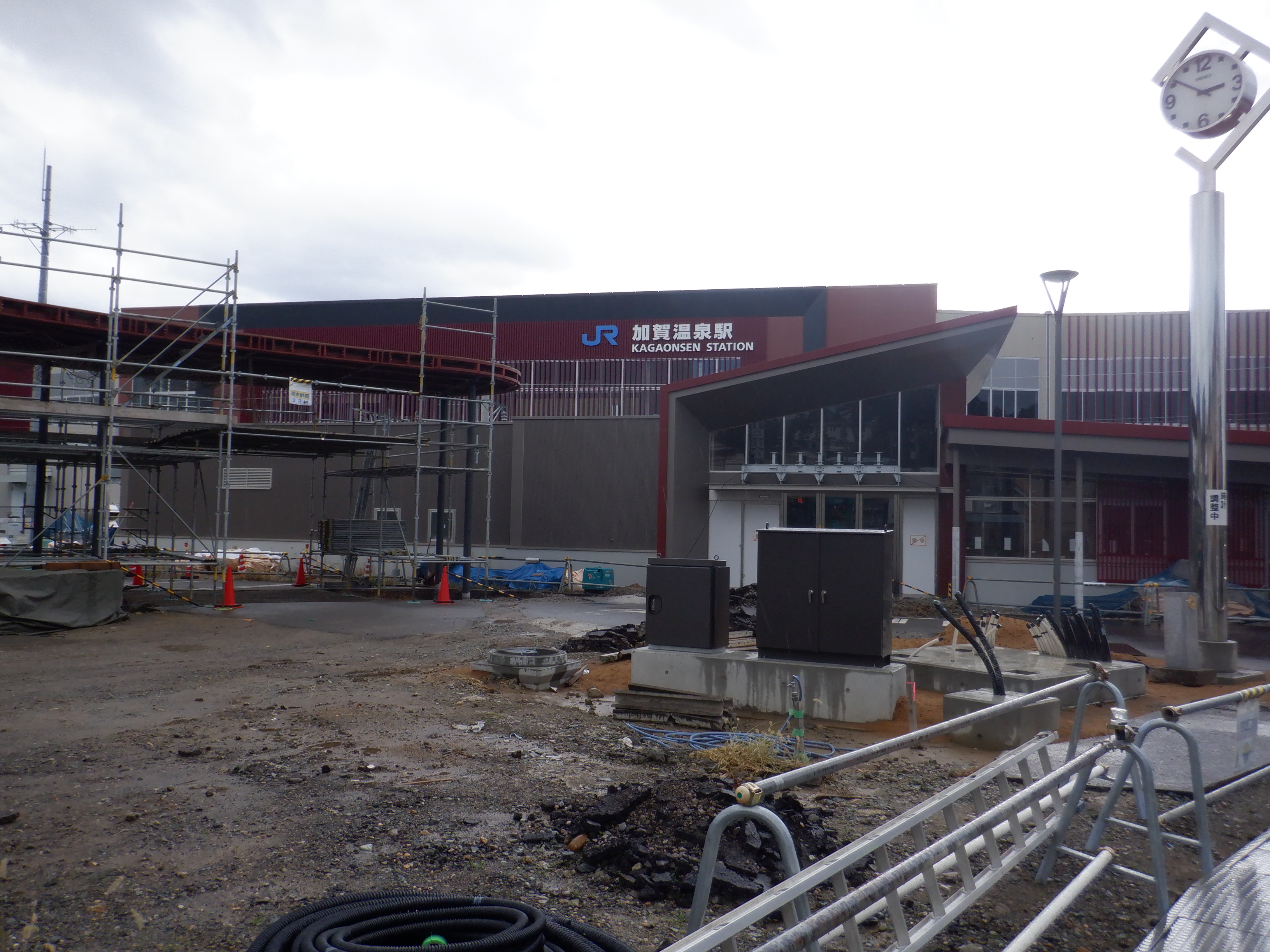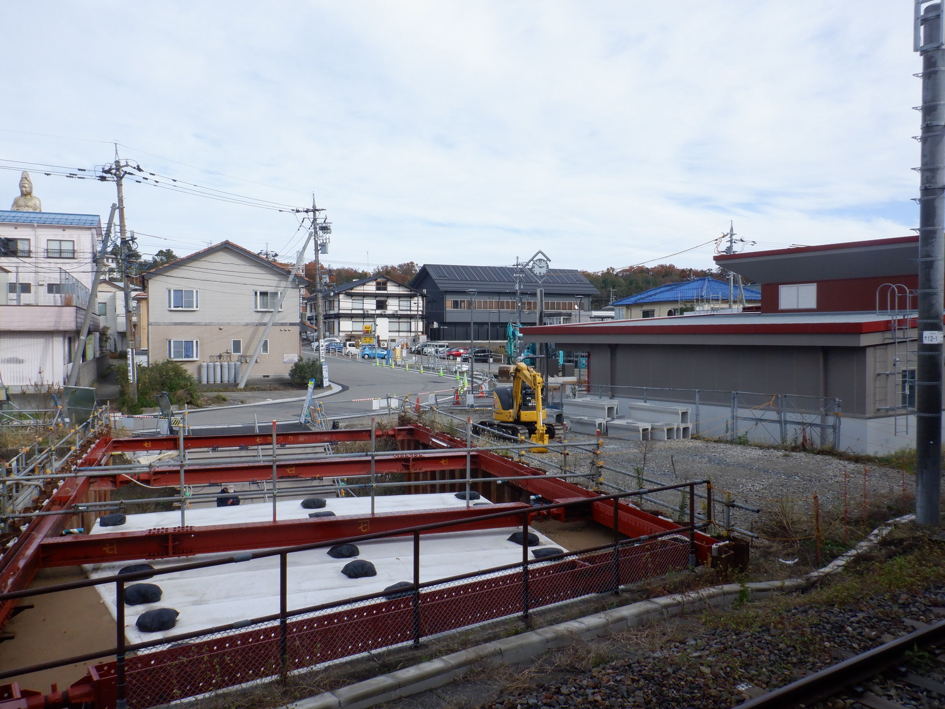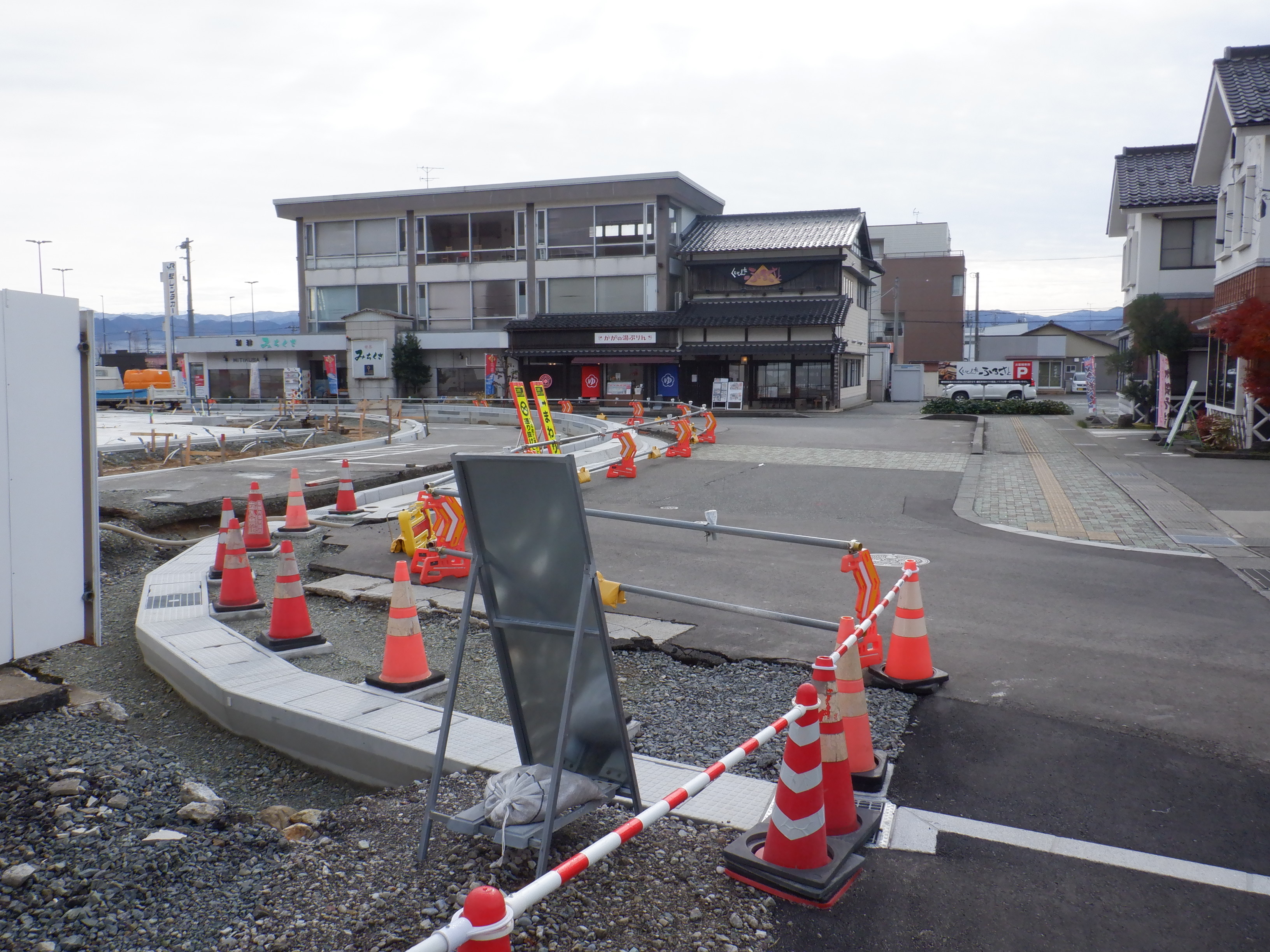 大聖寺駅側。右側にレンタカー屋さん建設中の様子が見えます。