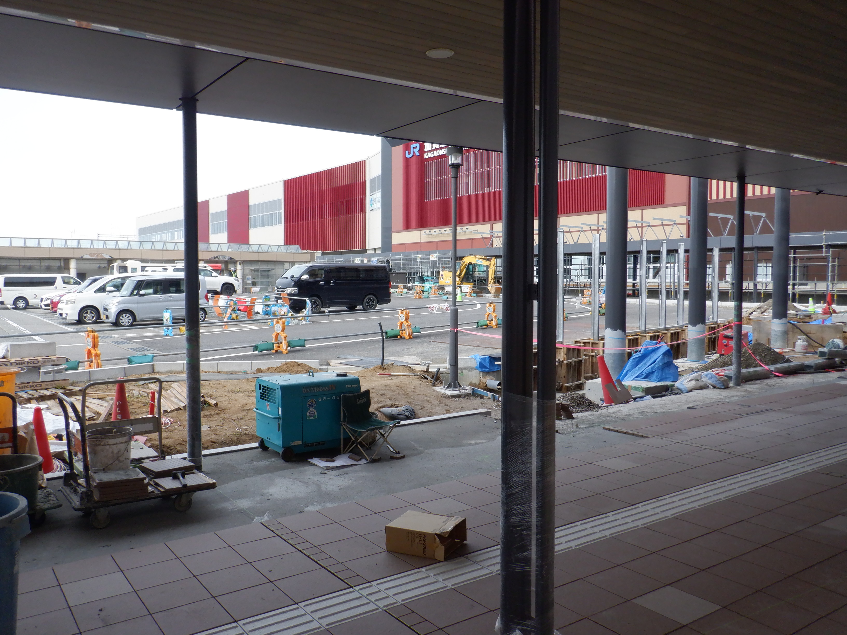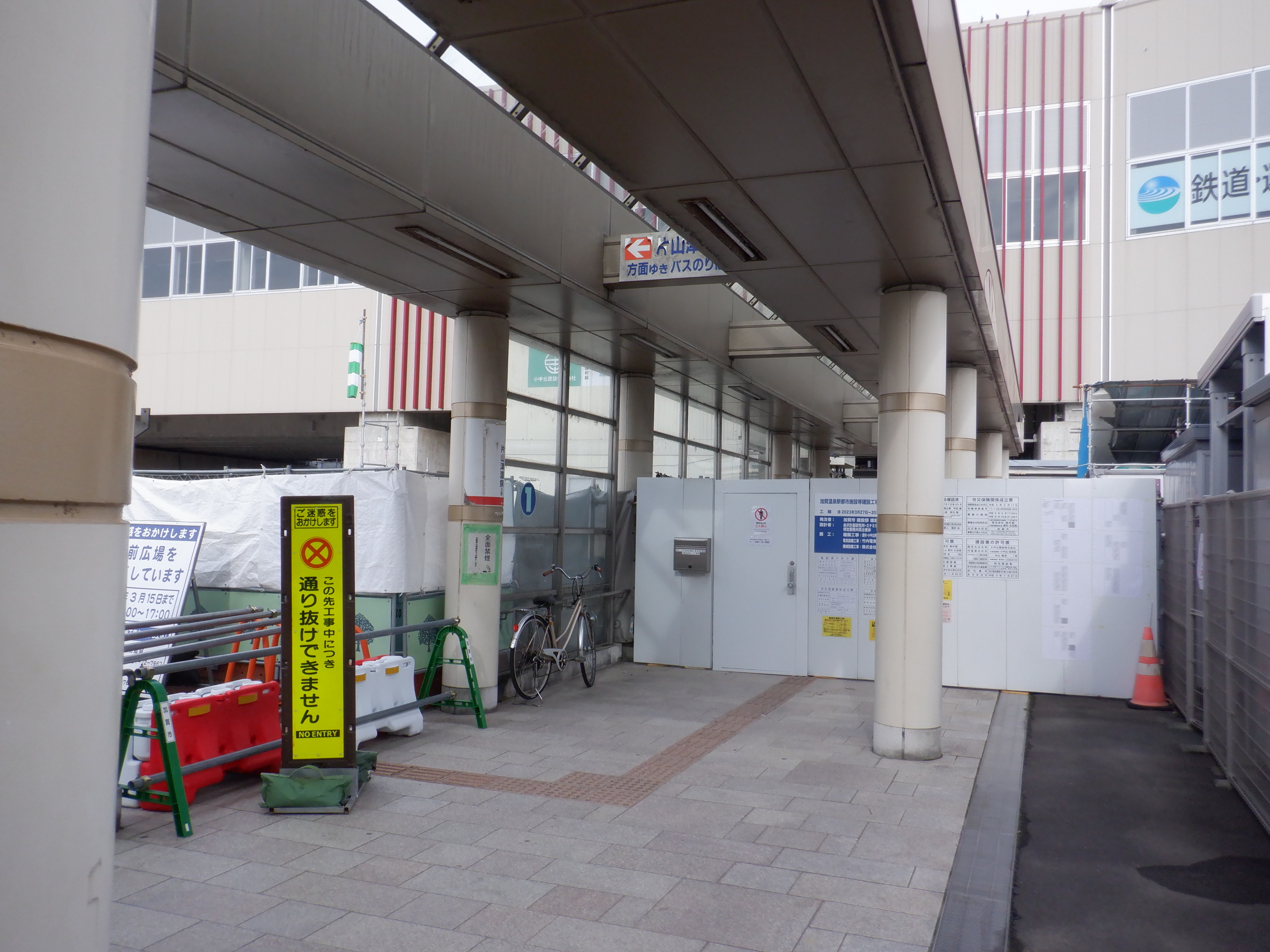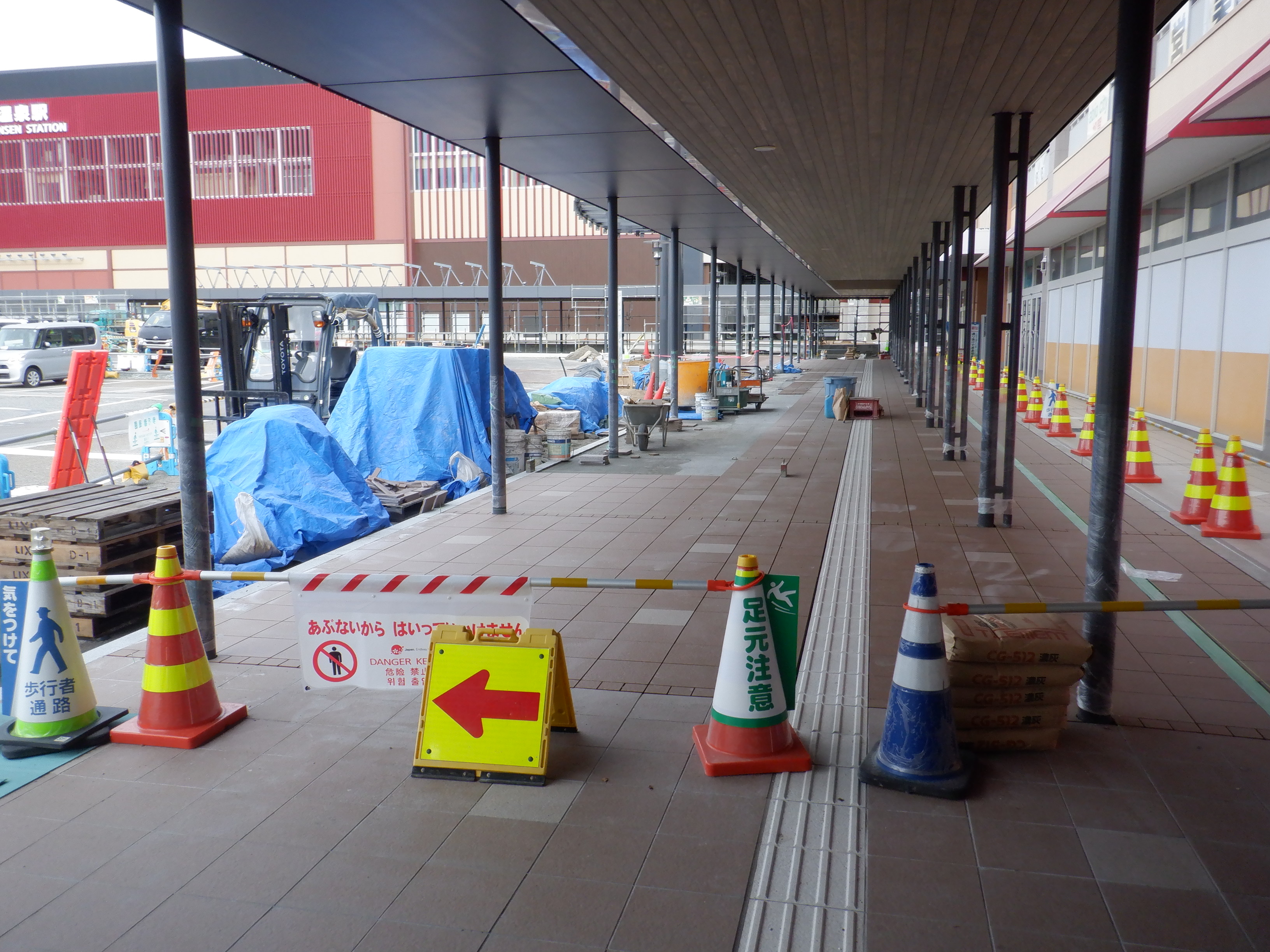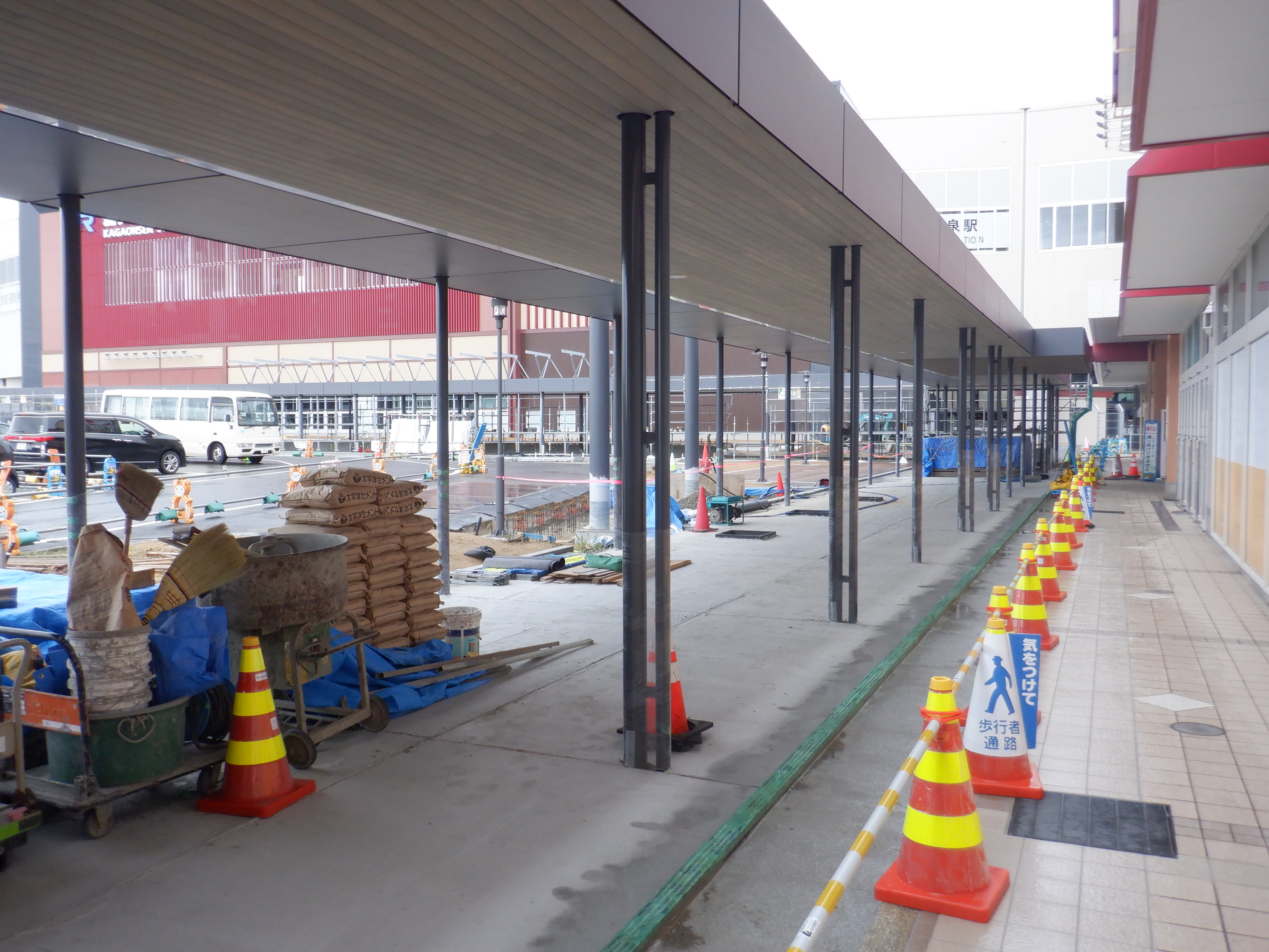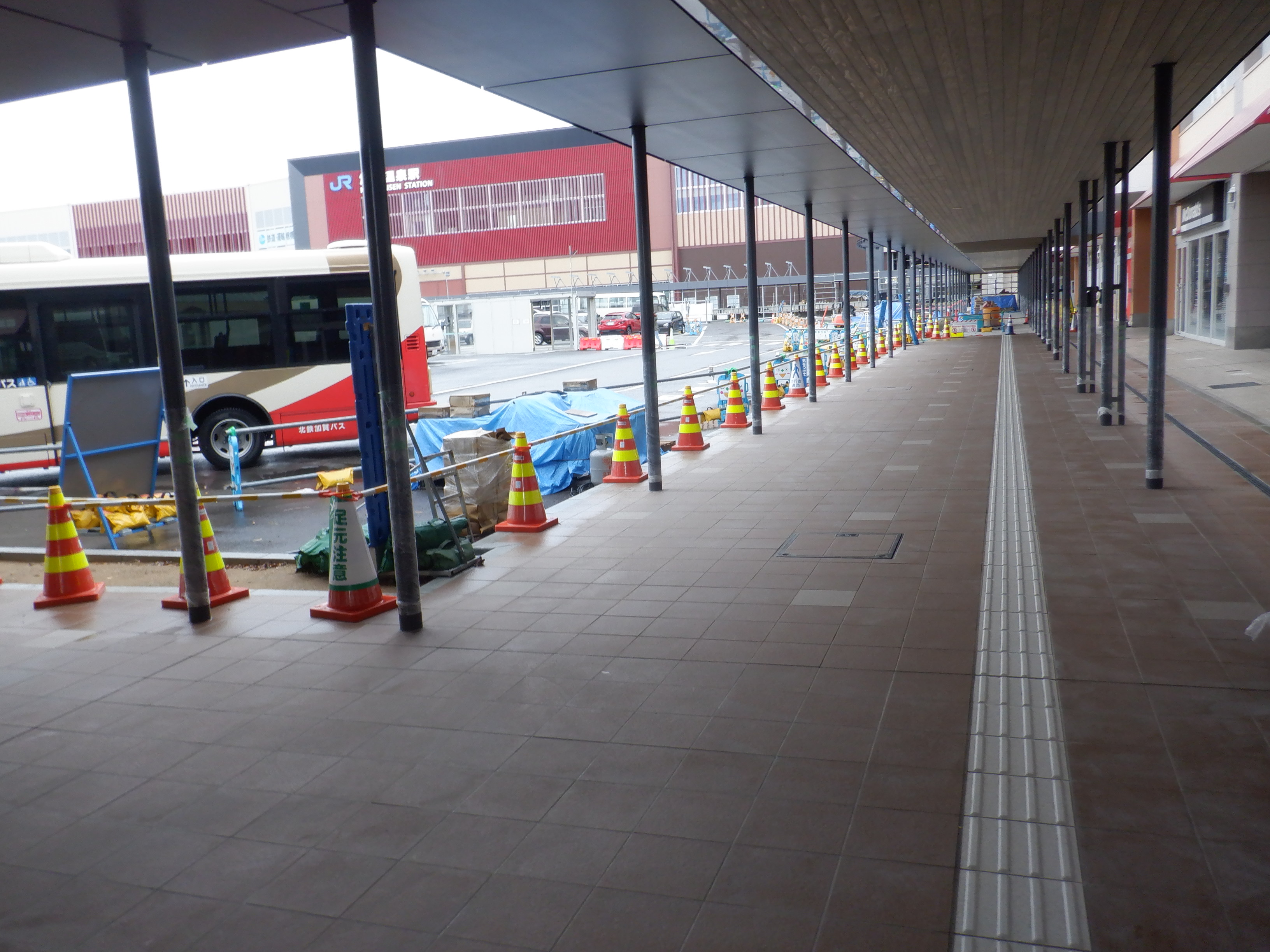 1・2番のりばから見た高架下部都市施設(コンビニ・待合室等)建設中のところと迂回路。