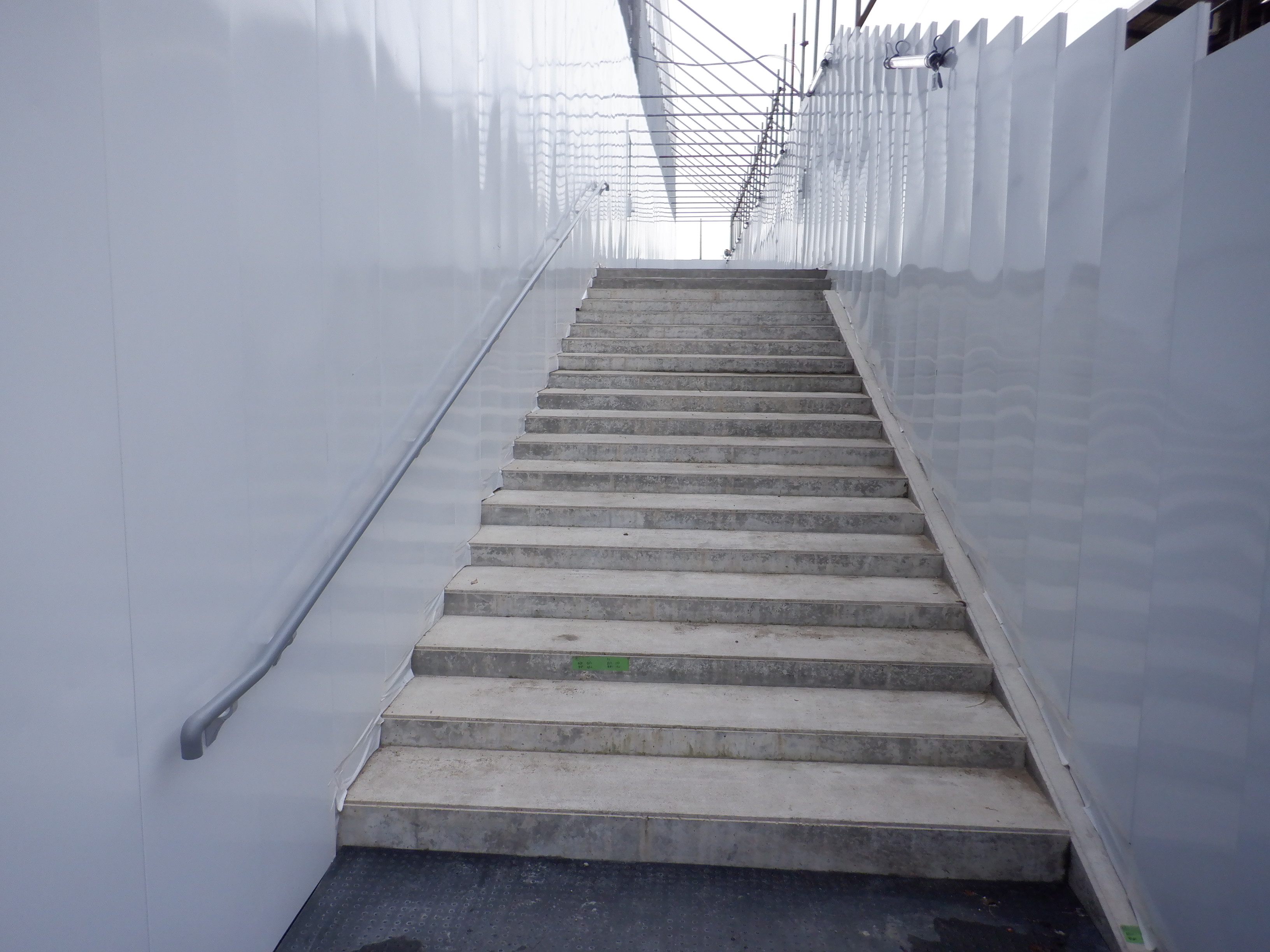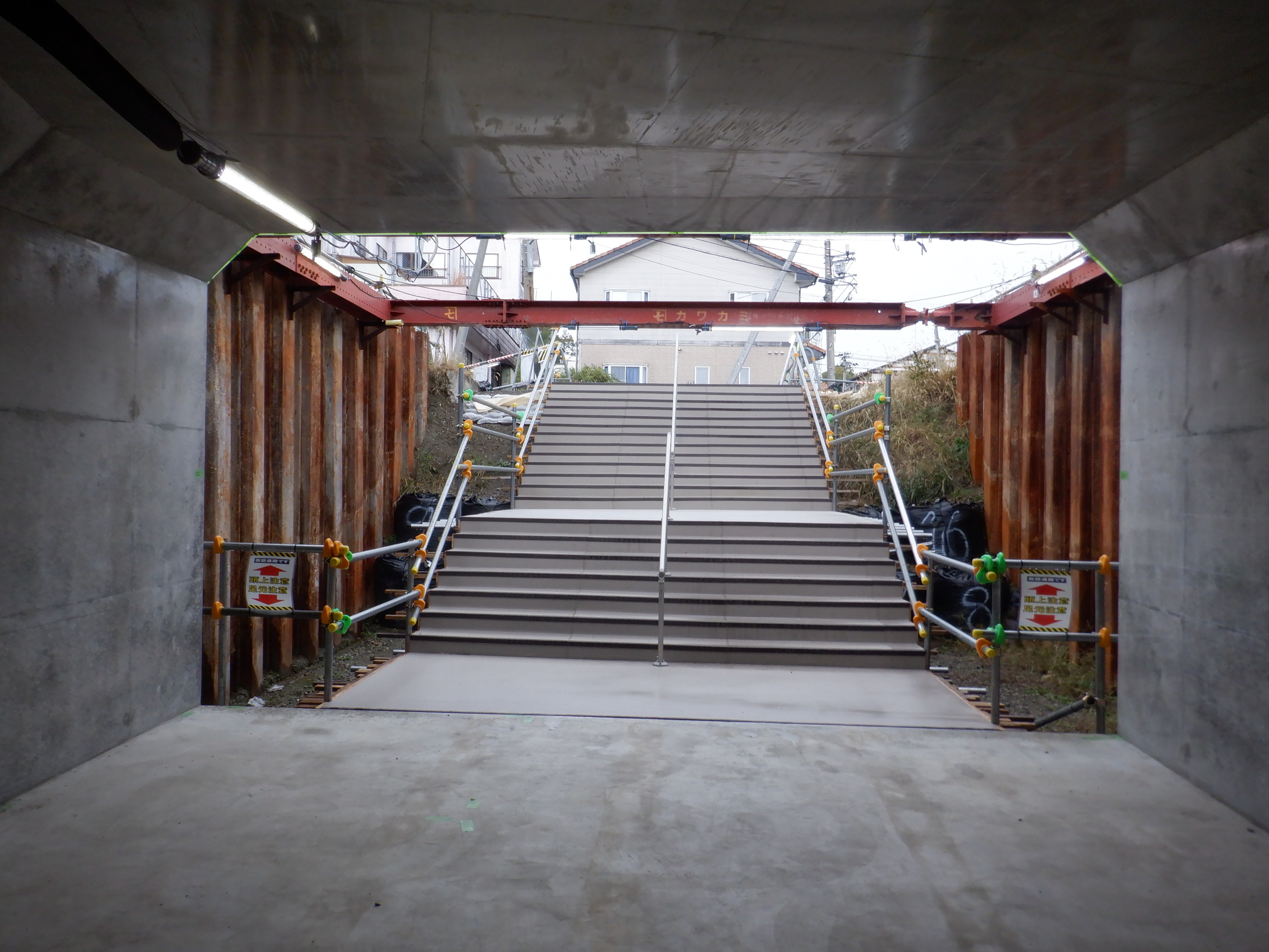 1・2番のりばから見た高架下部都市施設(コンビニ・待合室等)建設中のところの地下道からの入口付近。施設に向かって階段が作られているのが分かります。
