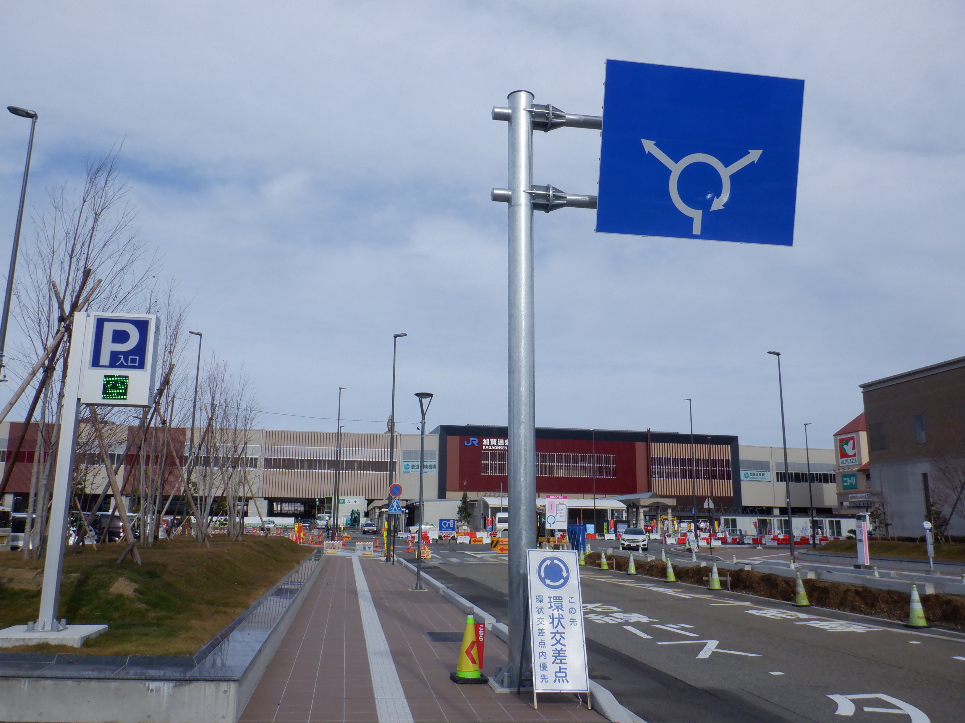 仮設駅舎の駅前の環状交差点。