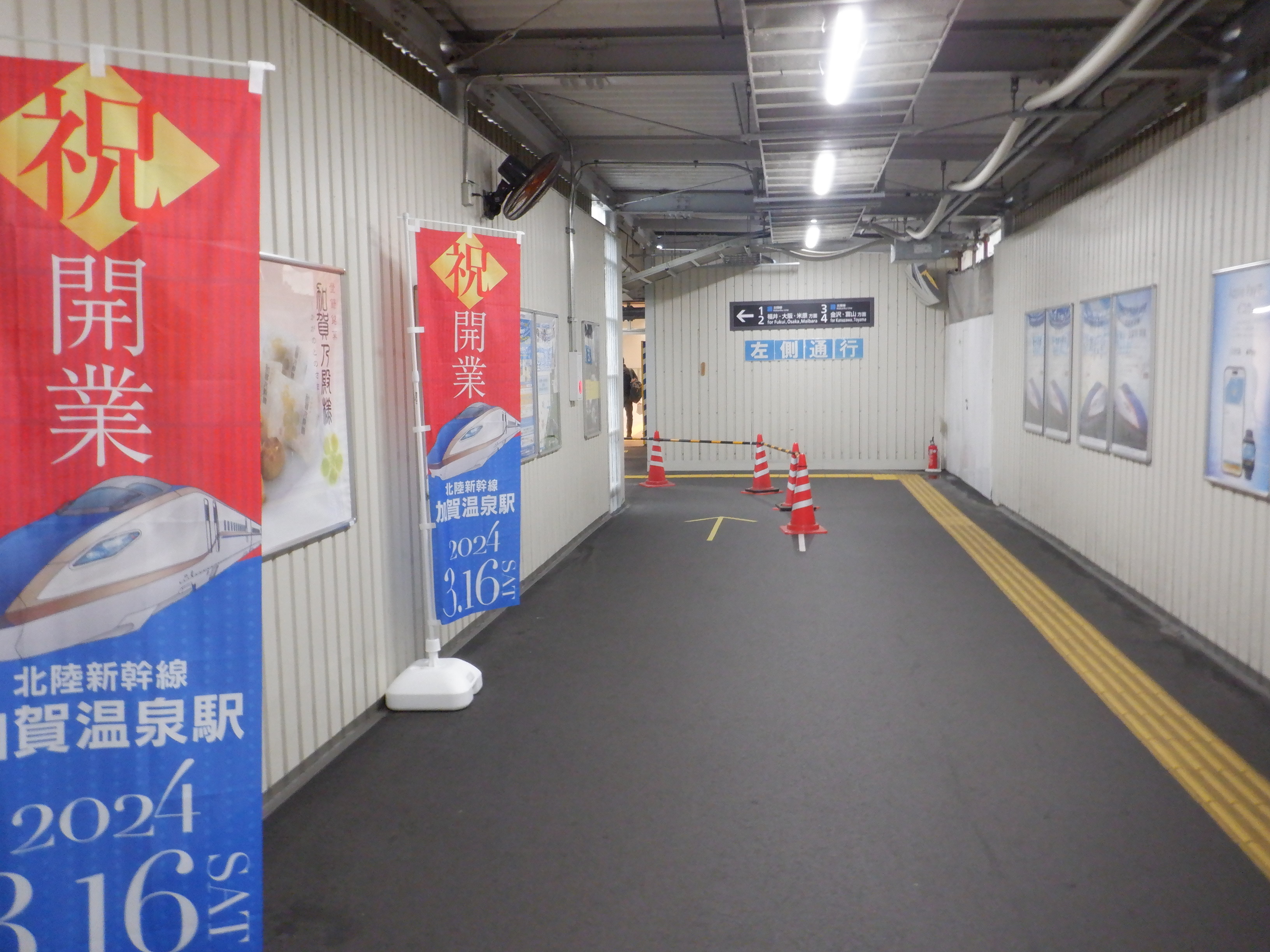 仮設通路のIRいしかわ鉄道県内全線開業のポスター。