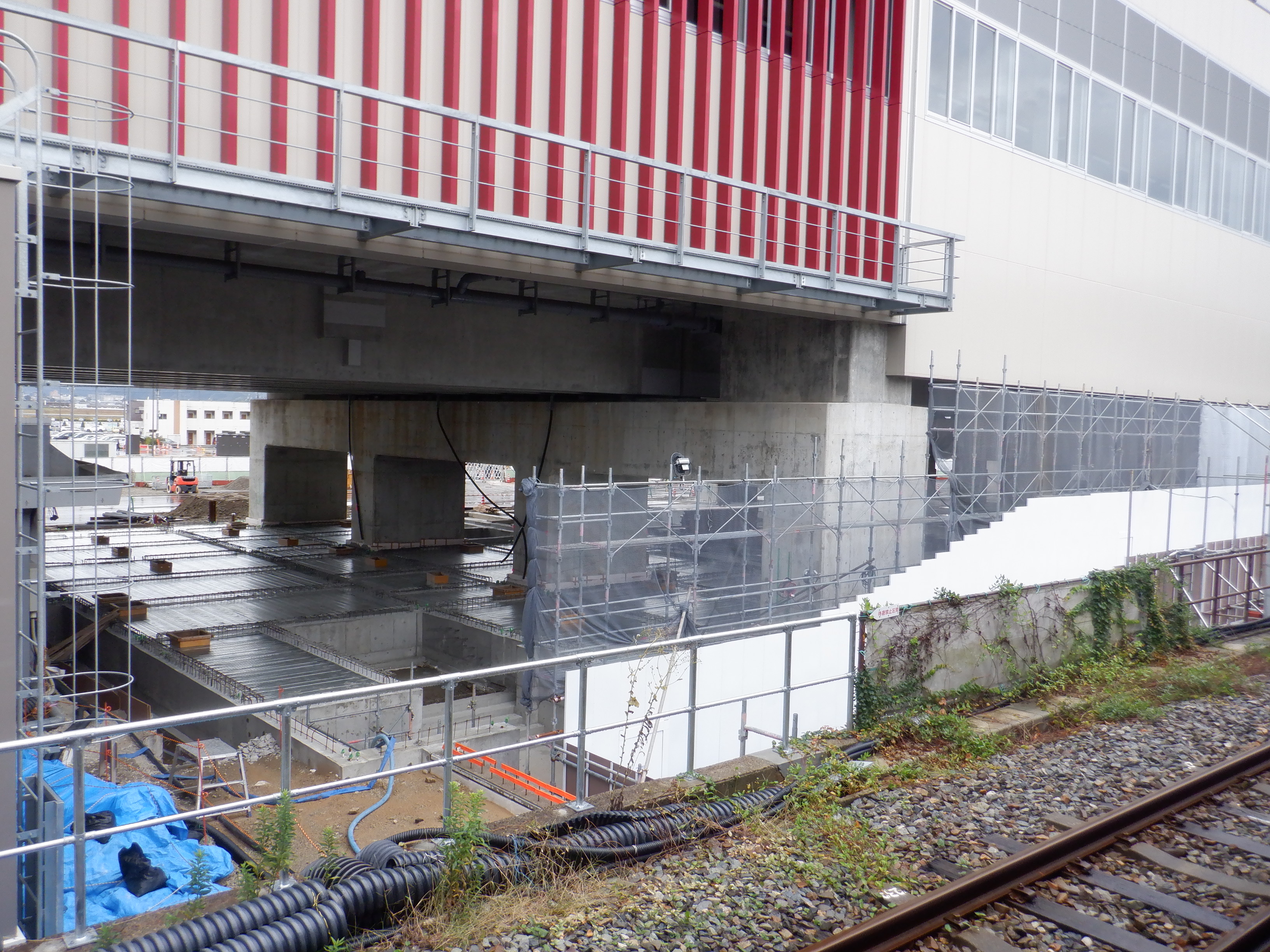 地下道入口、在来線改札口となるところがきれいになっていました。また、高架下部都市施設の建設も進んできました。