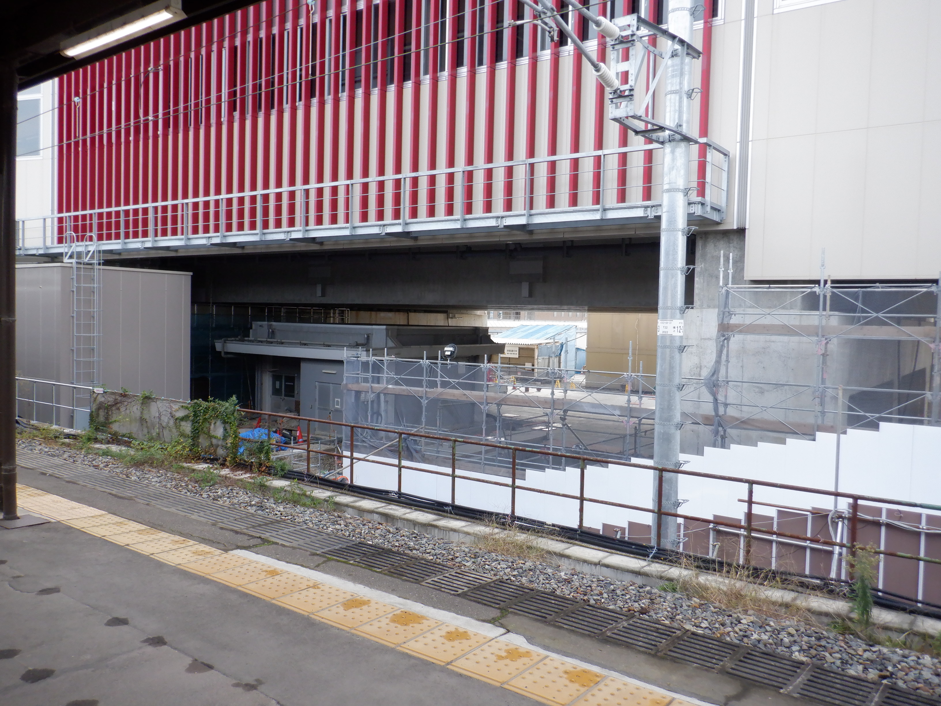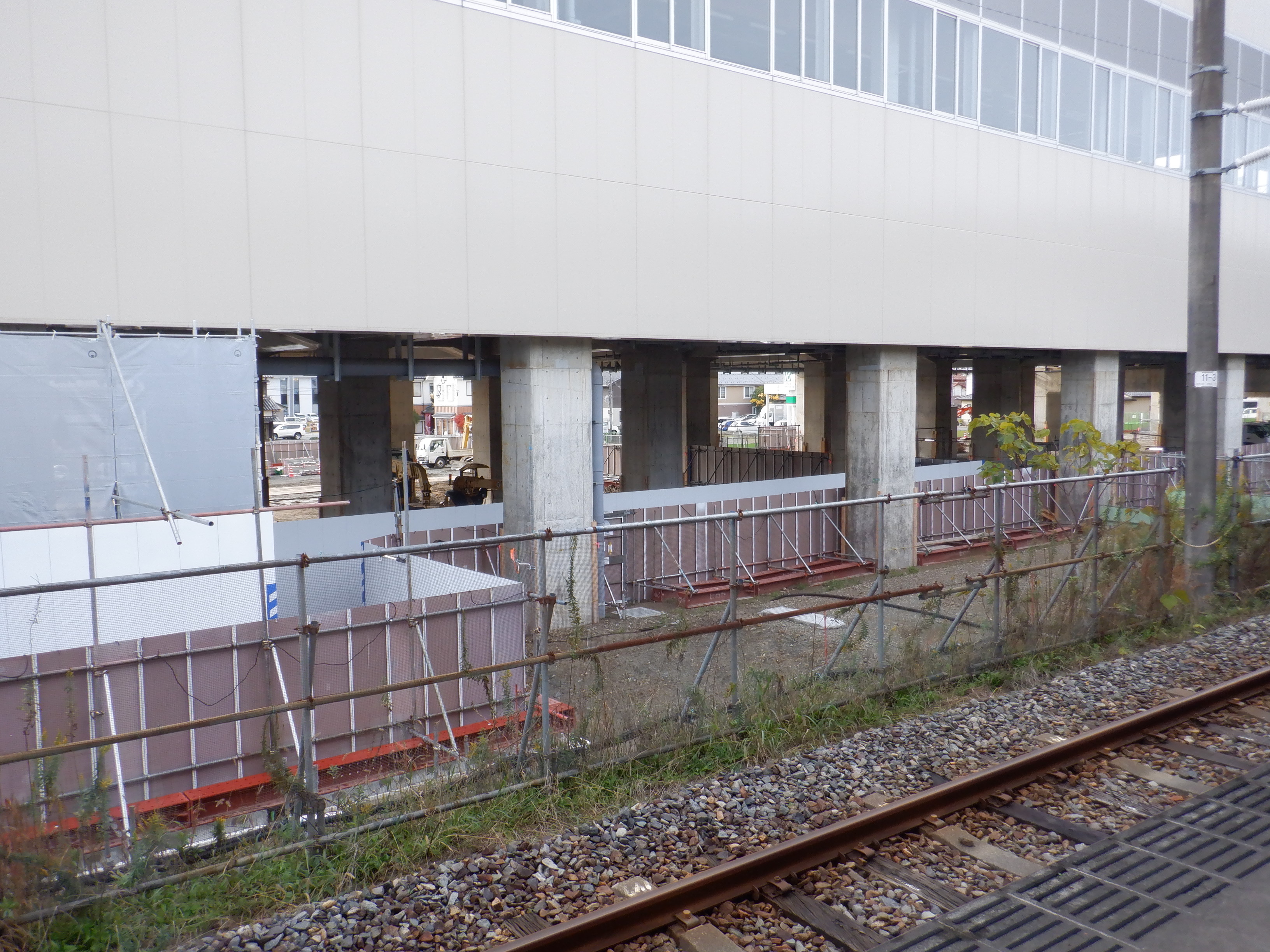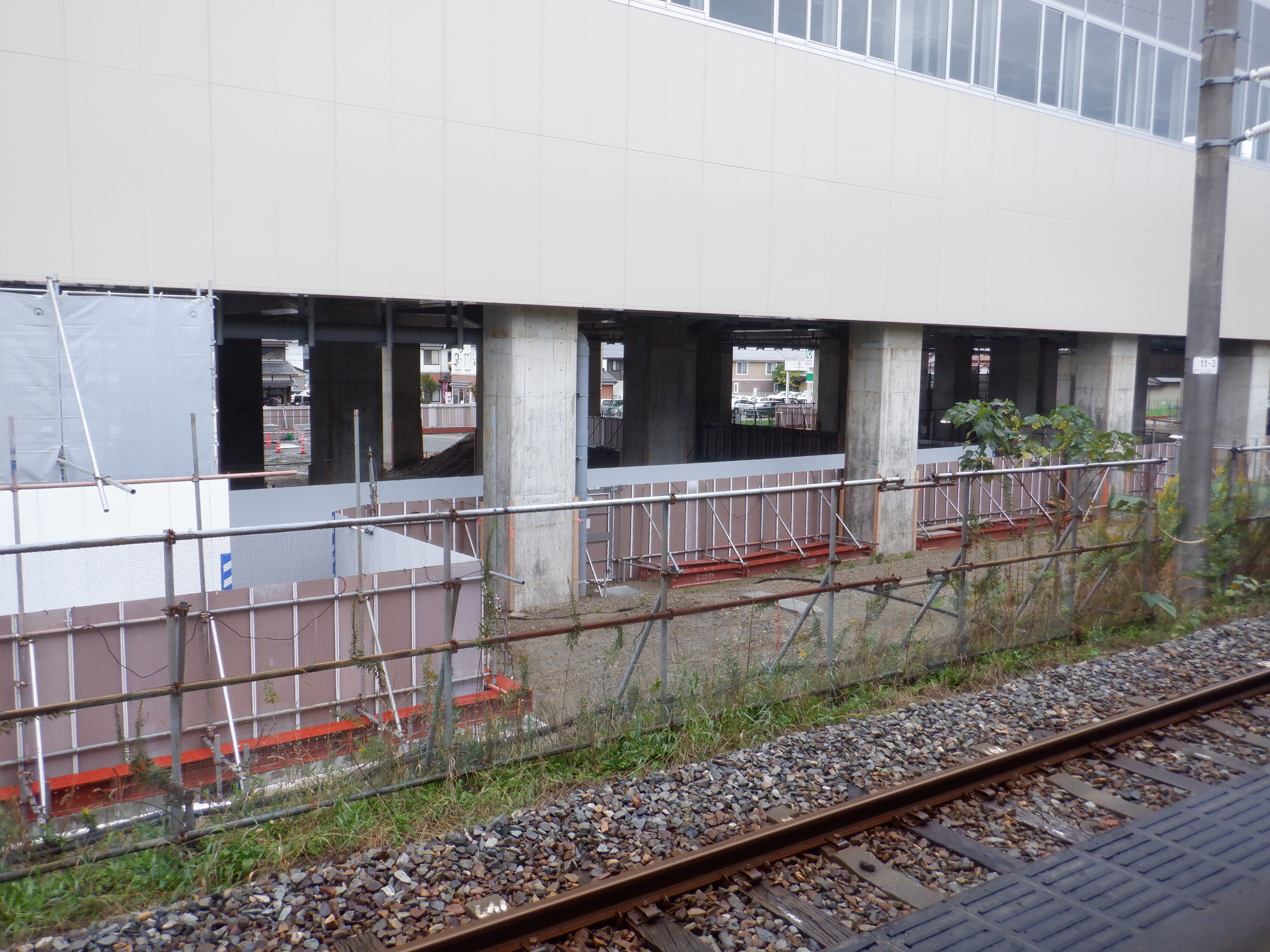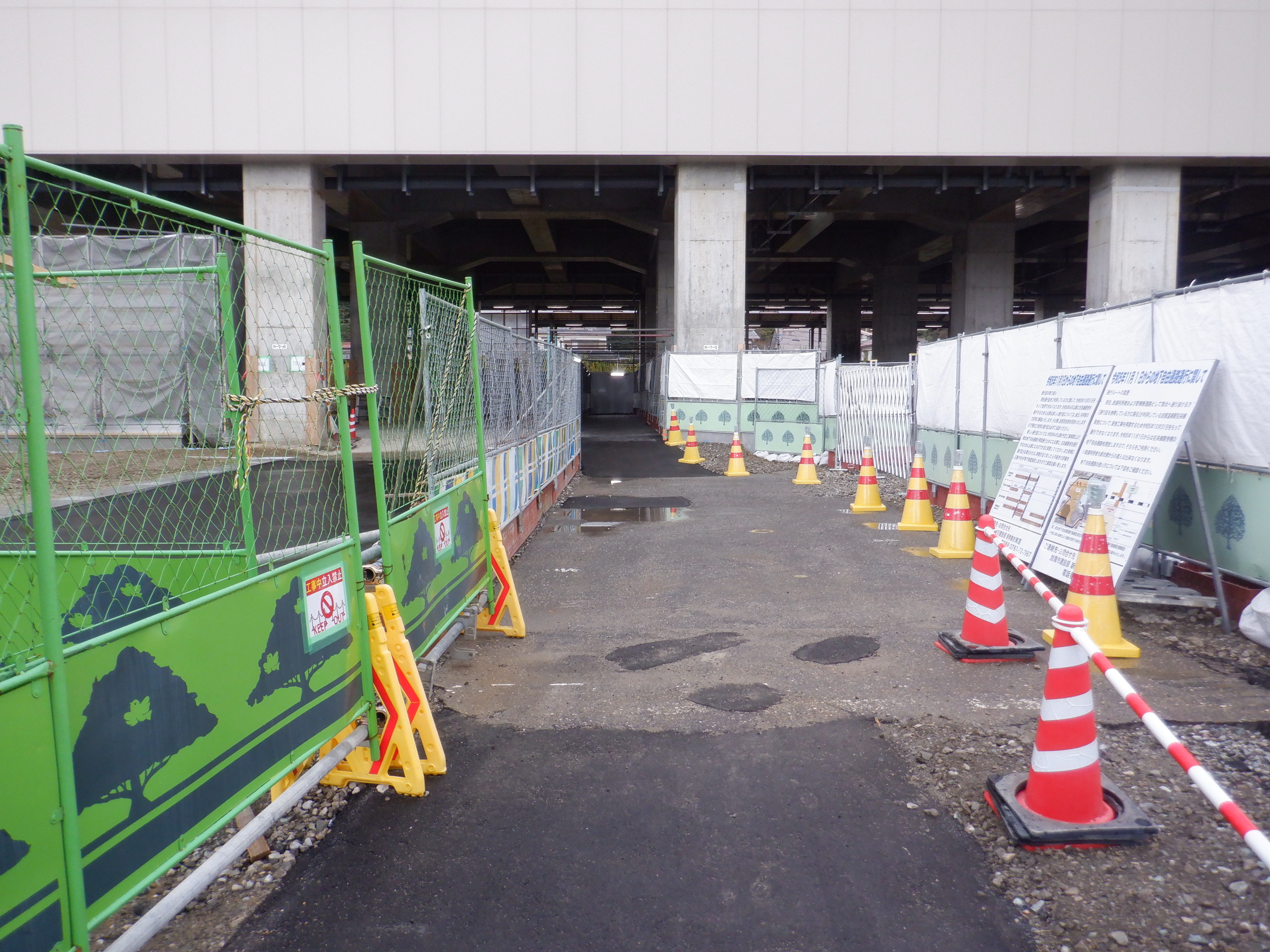 1・2番のりばから見た高架下部都市施設(コンビニ・待合室等)建設中のところと仮設通路。