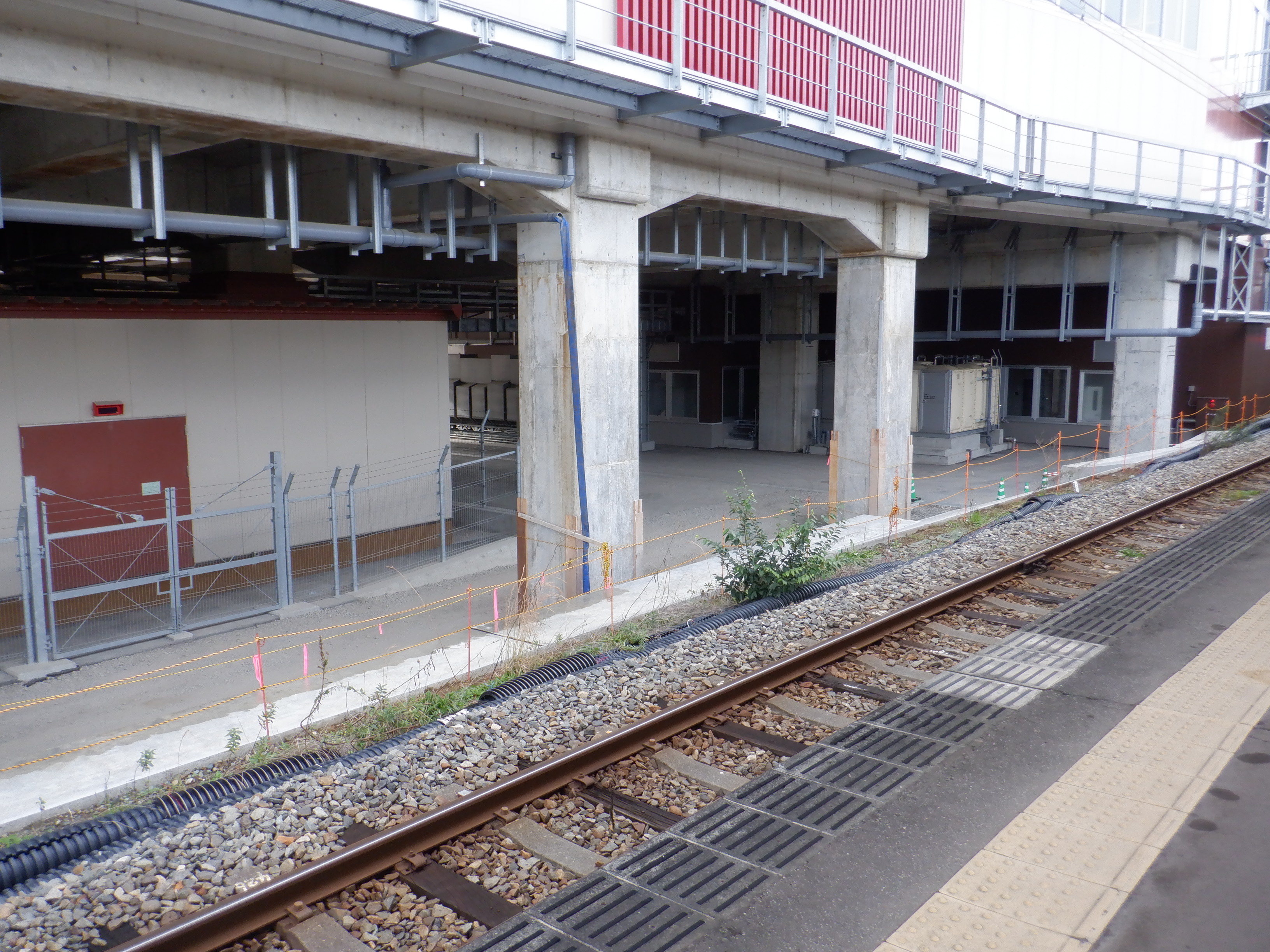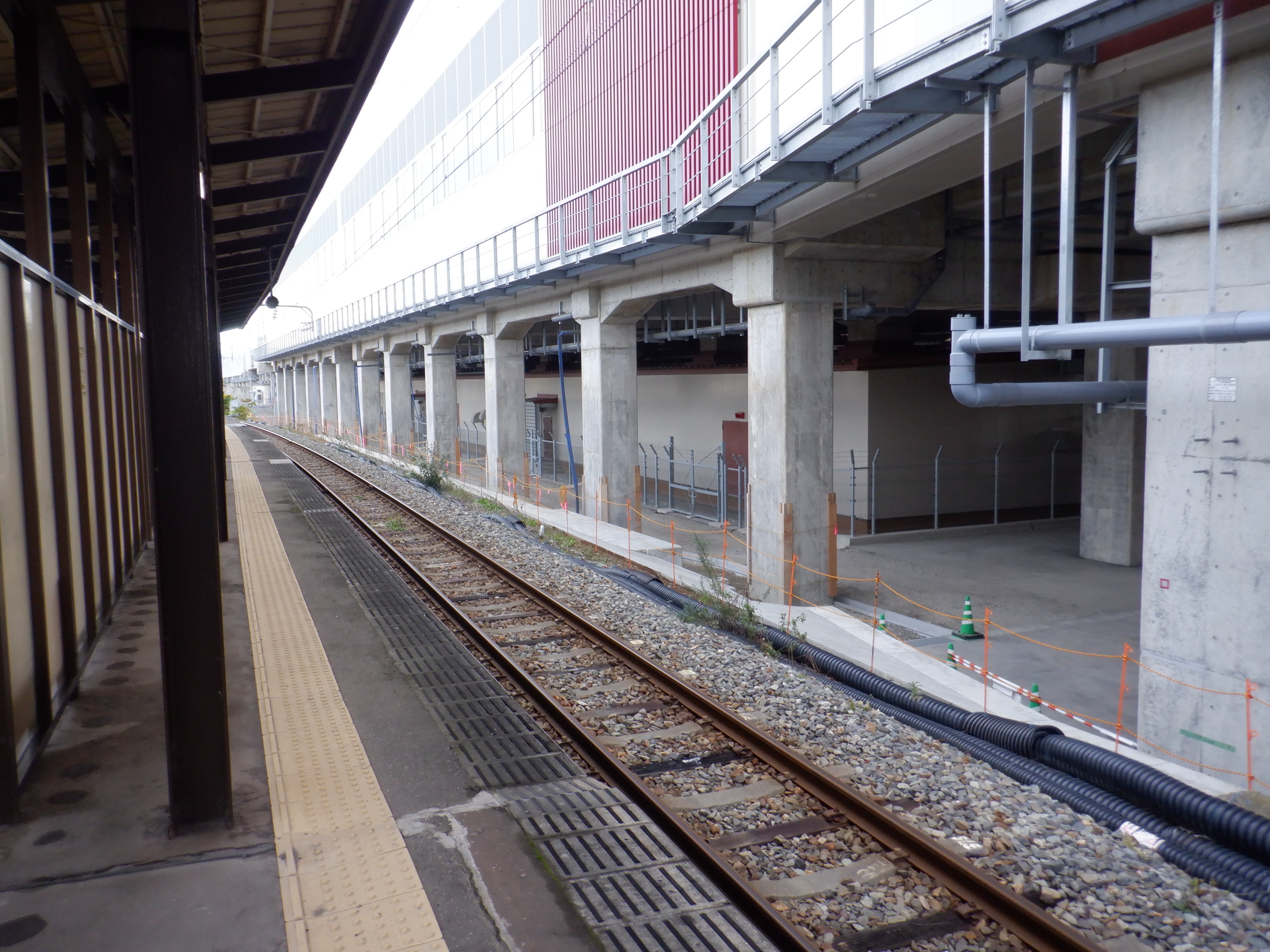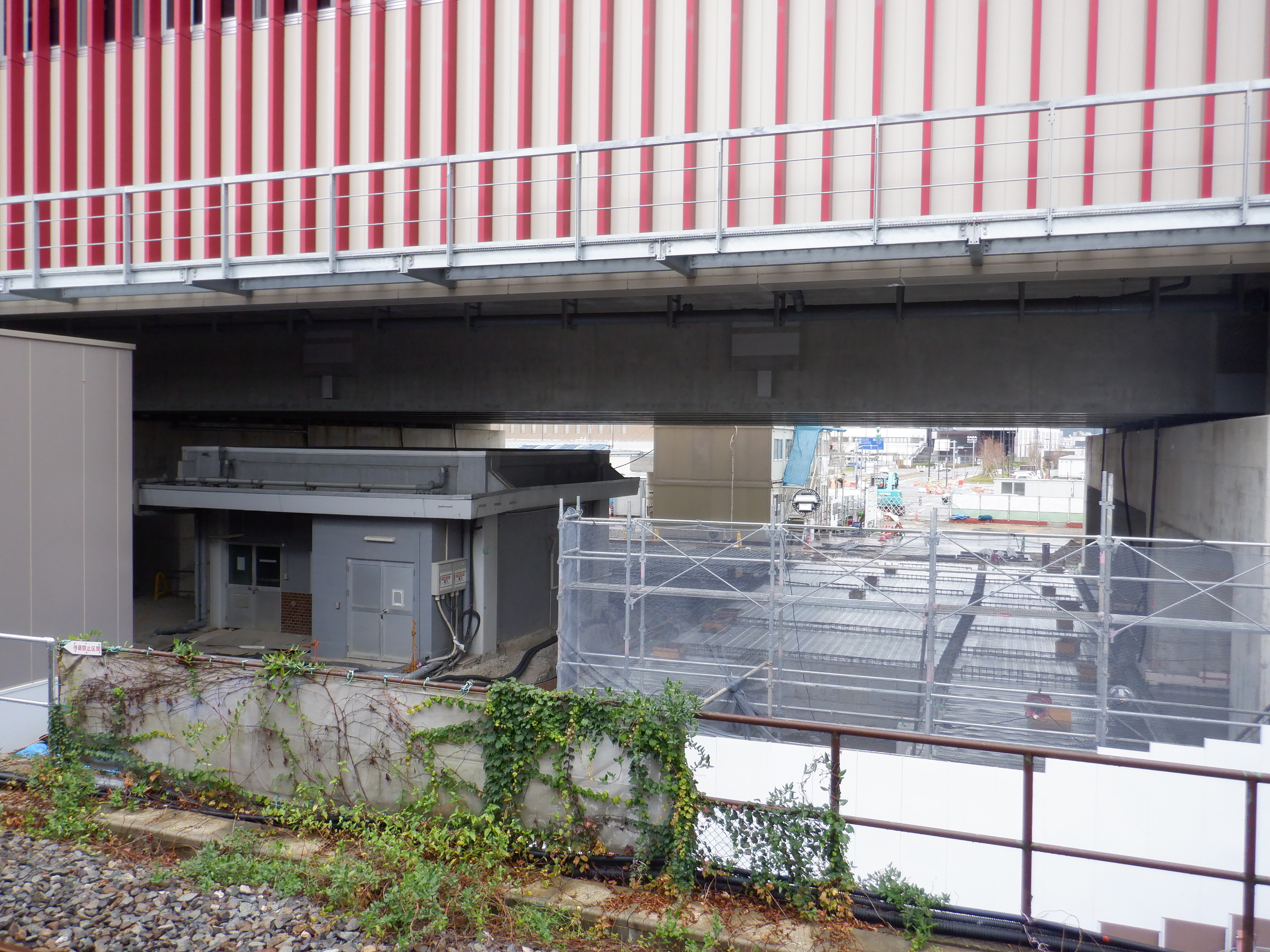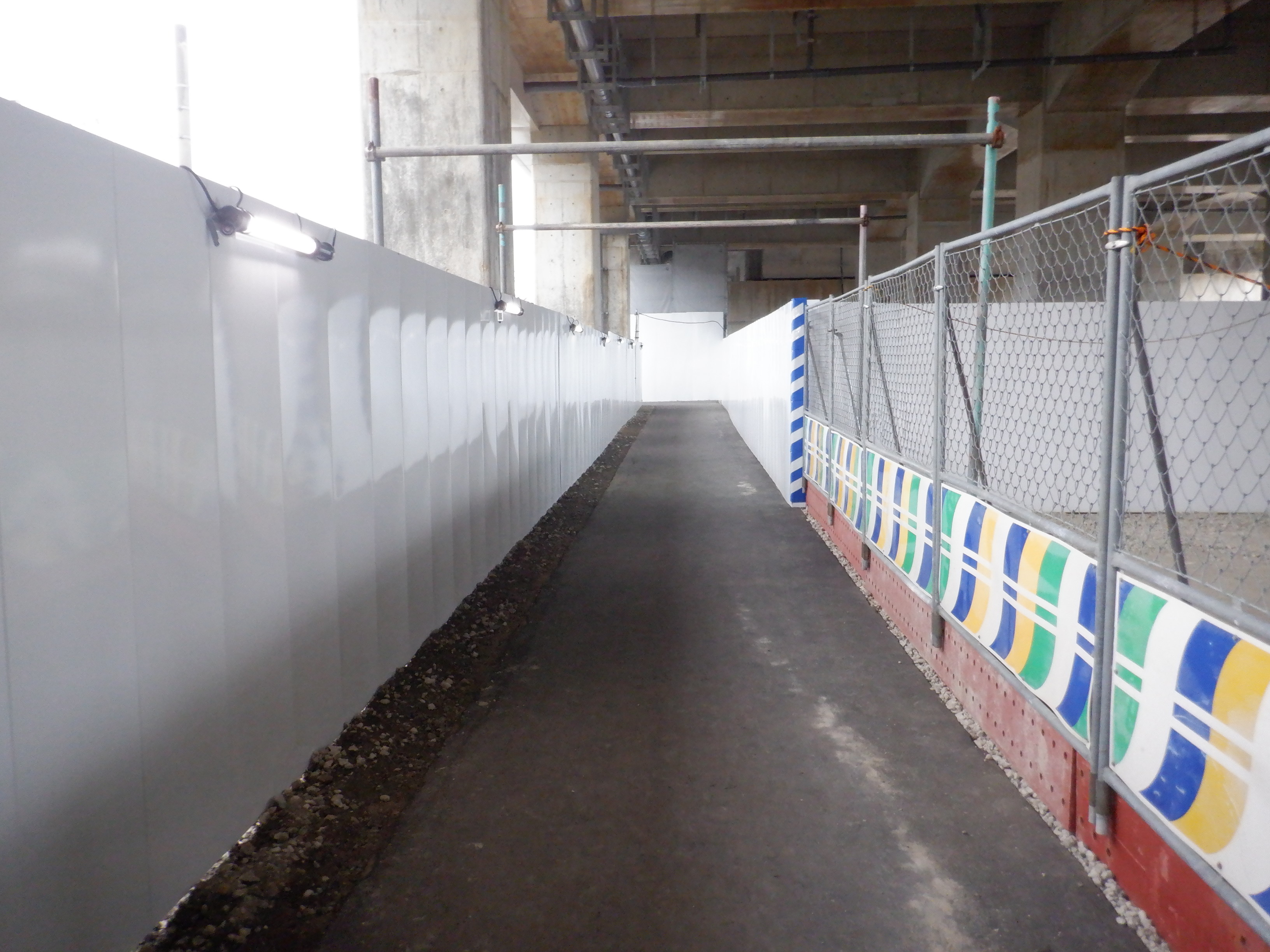 1・2番のりばから見た高架下部都市施設(コンビニ・待合室等)建設中のところと仮設通路。