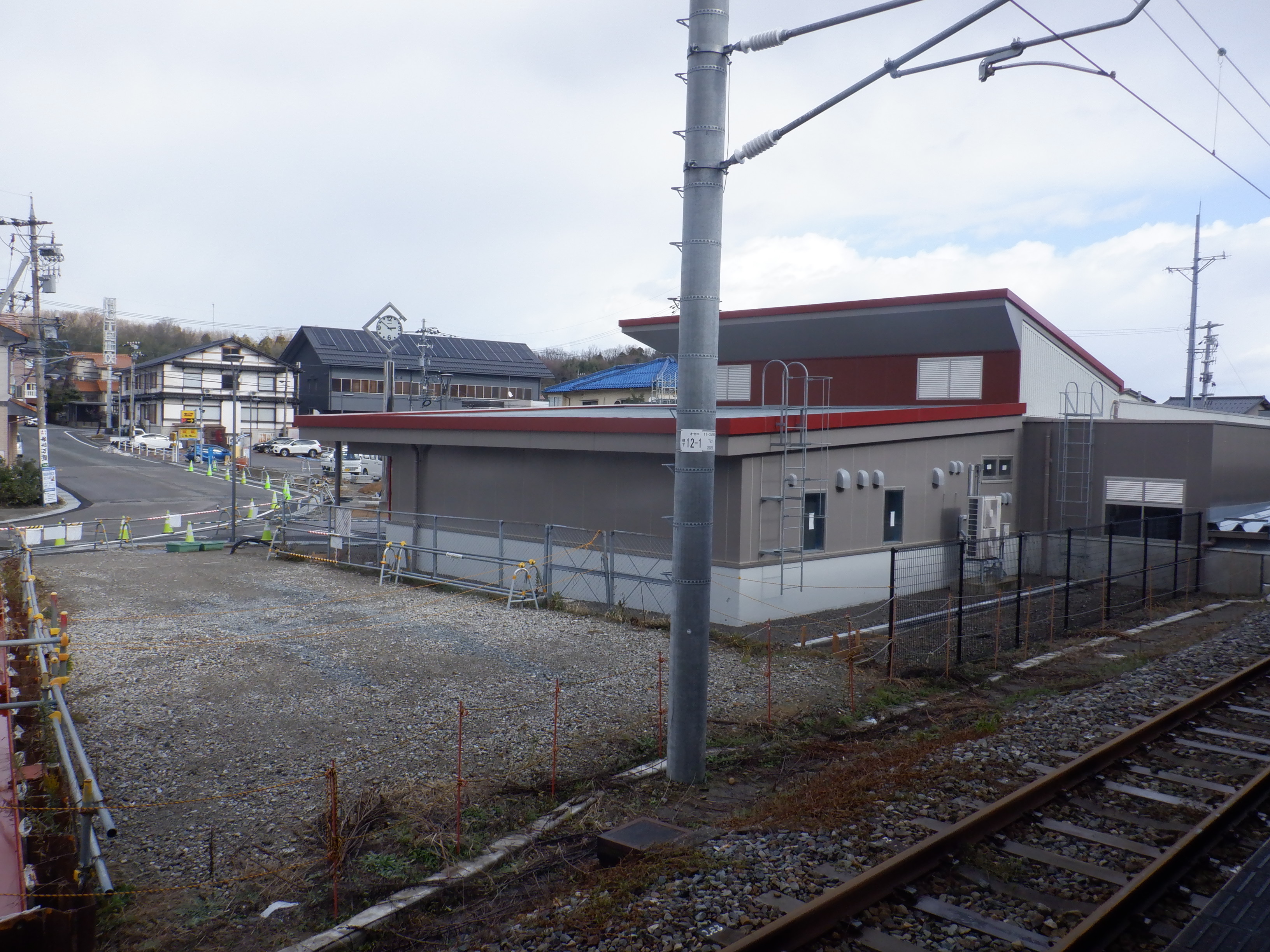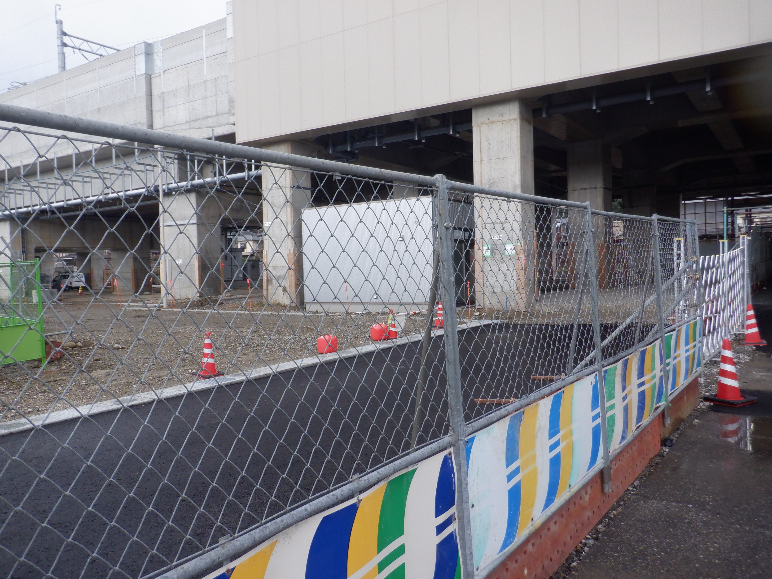 1・2番のりばから見た高架下部都市施設(コンビニ・待合室等)建設中の様子。また、架線柱の「オセコ」(電略+コ)の表示。