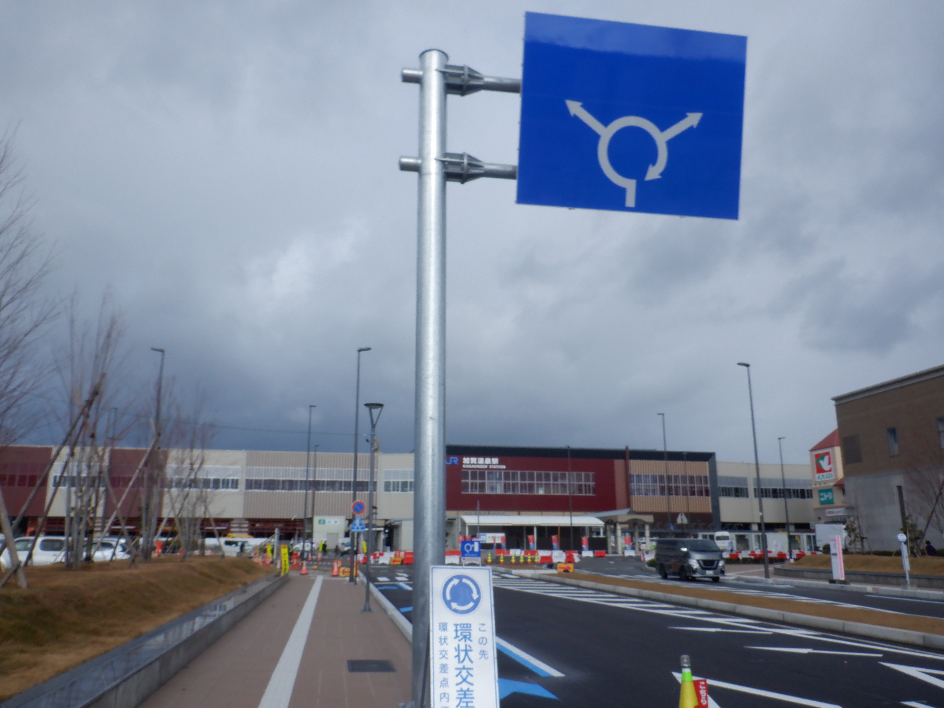 正面の環状交差点とその青看板。