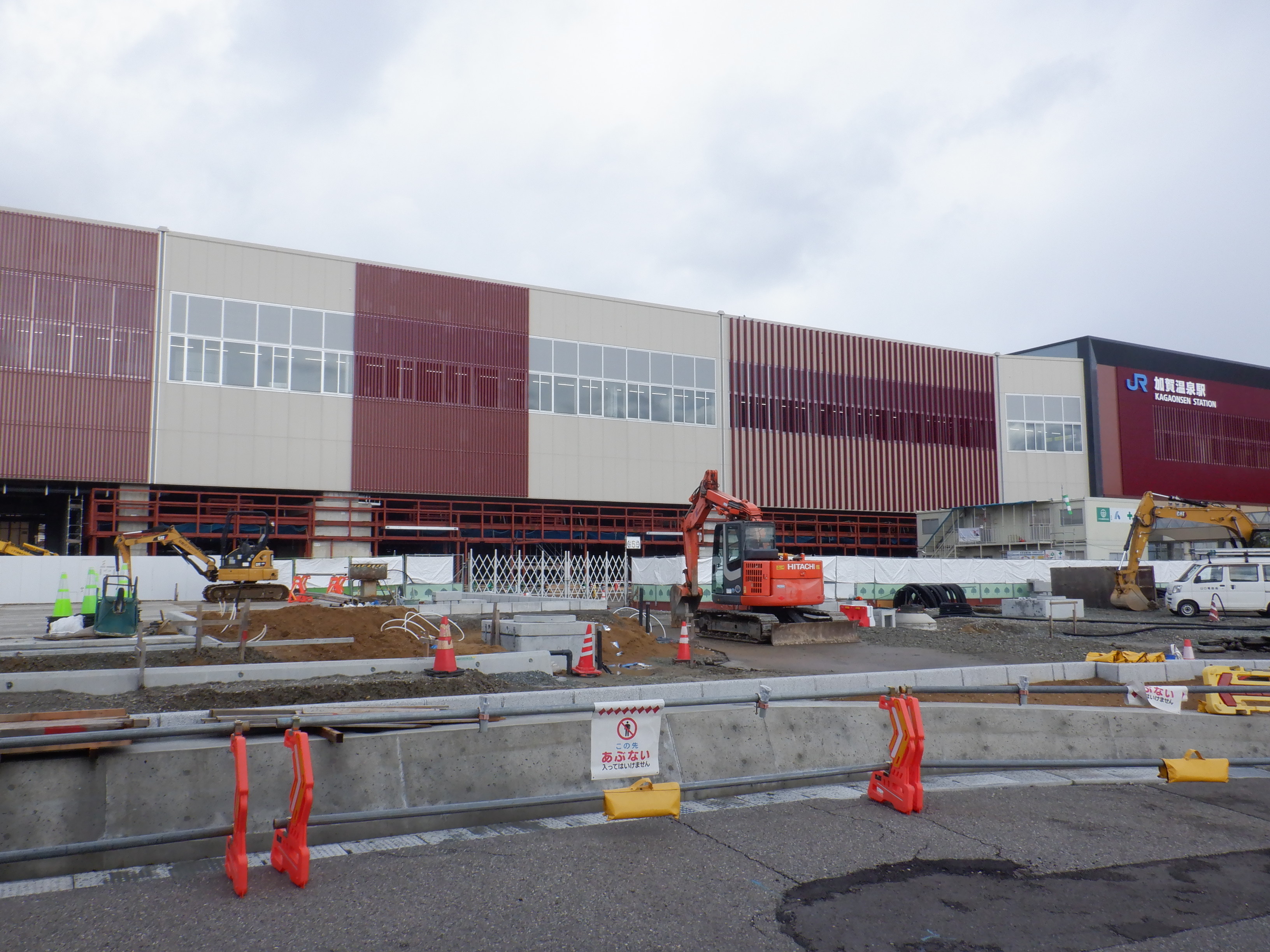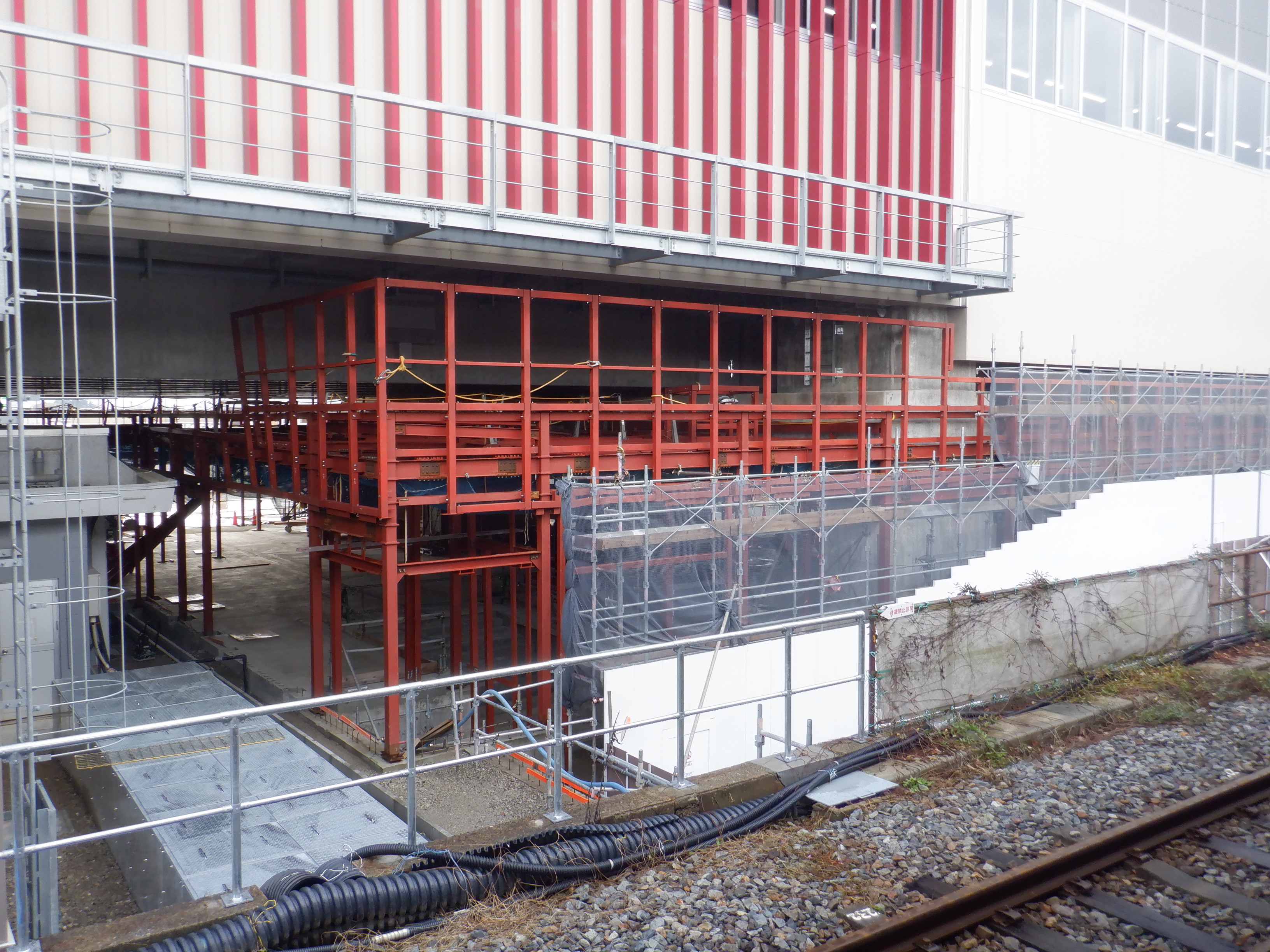 3・4番のりばから見た仮設地下道出入口と在来線駅舎となるもの。