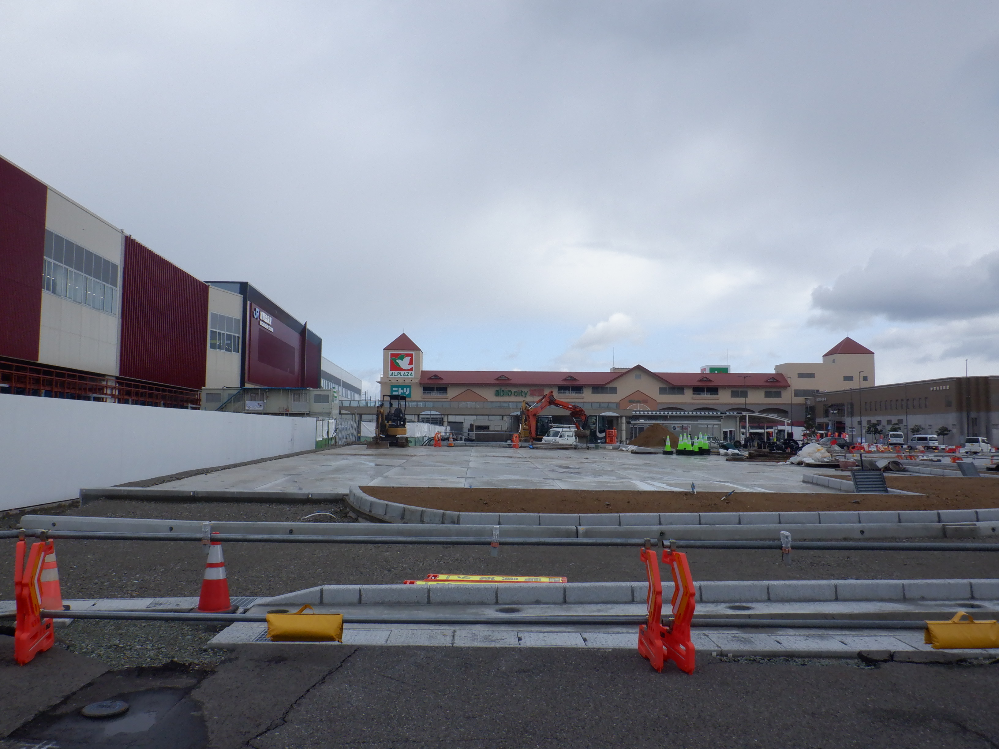仮設駅舎の前から見たアルプラザとアビオシティホール接続部分の様子。