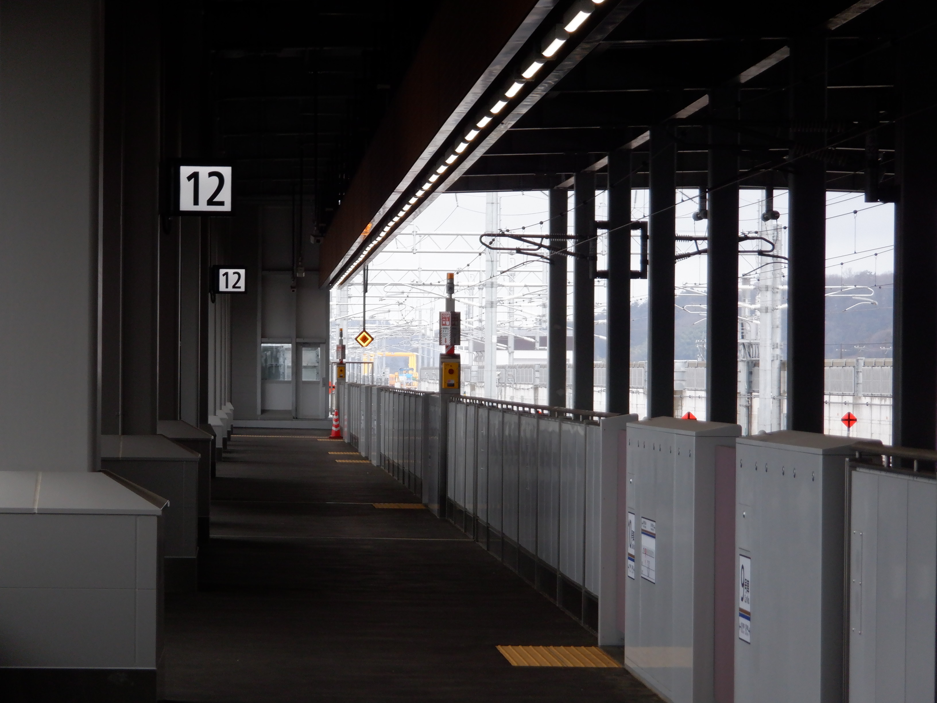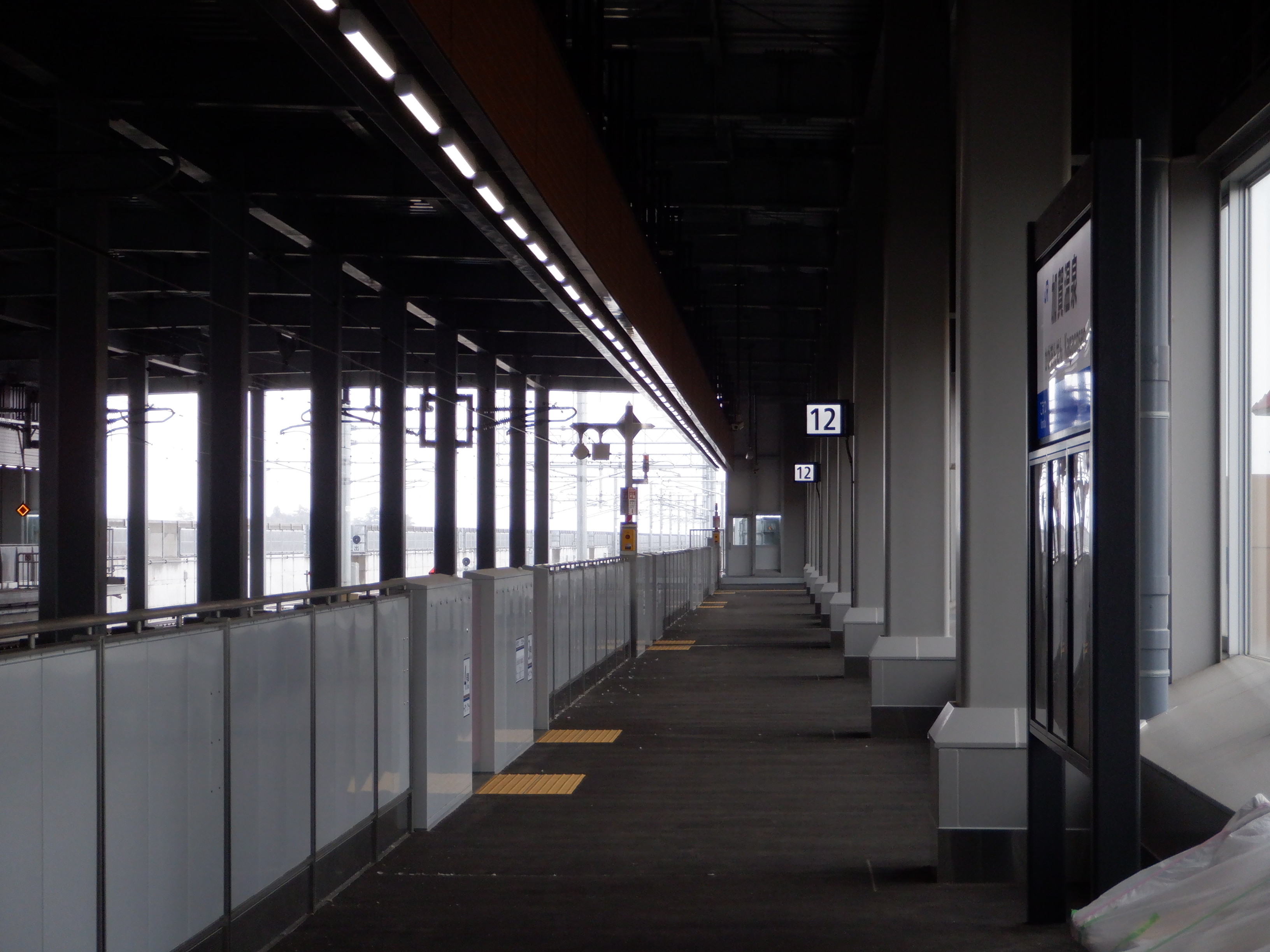 12番のりばの駅名標とその付近から見上げたところ、駅名標の裏面。