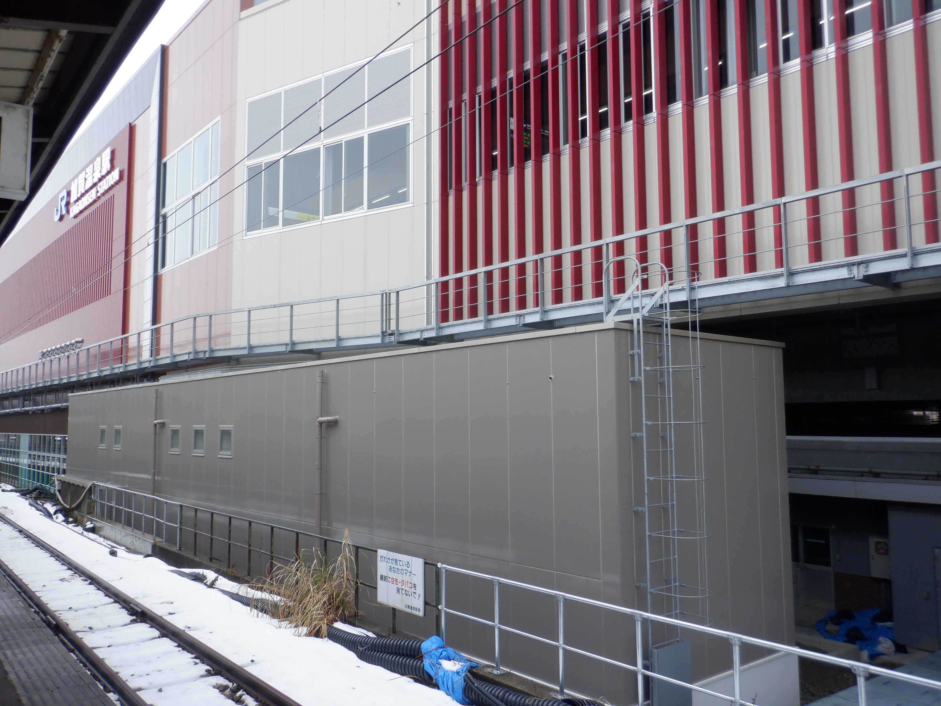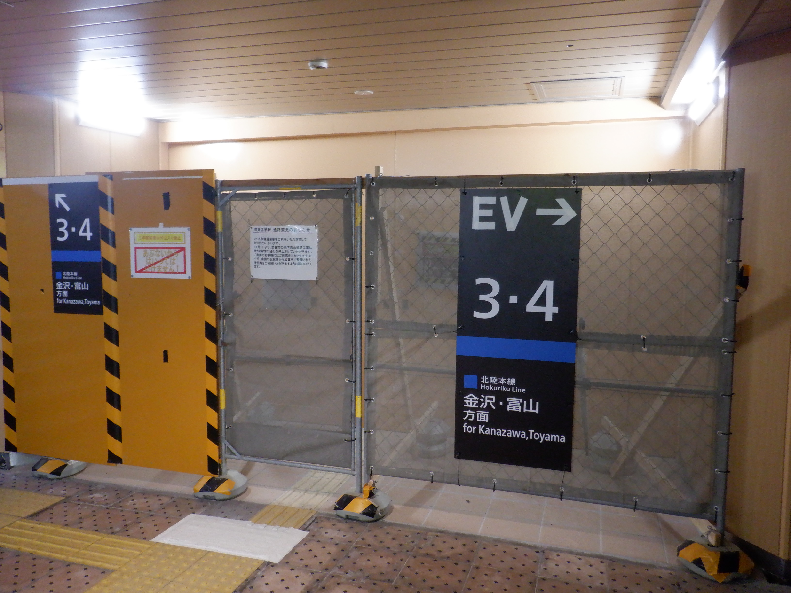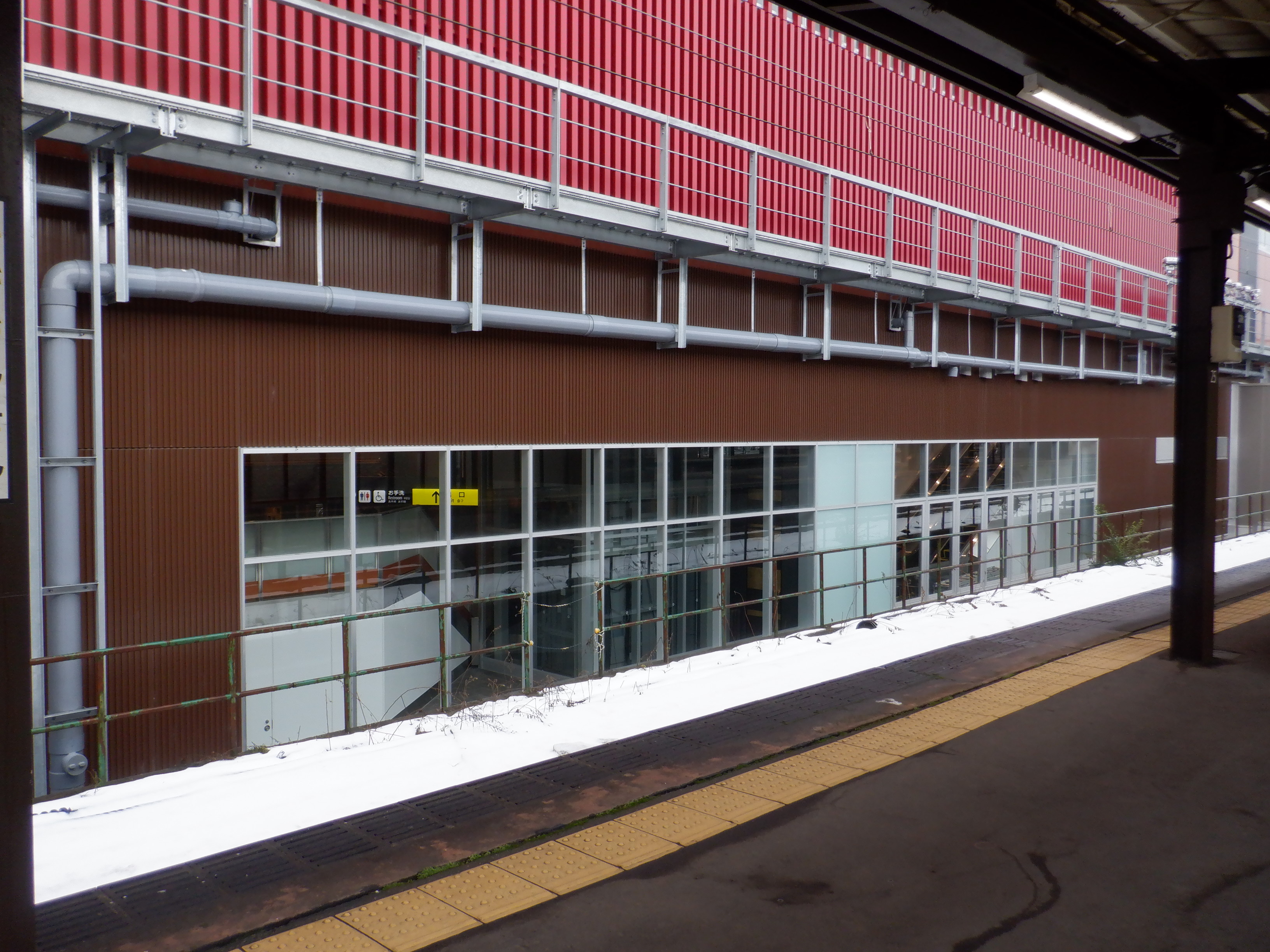 3・4番のりばから見た在来線駅舎と迂回通路出入口。