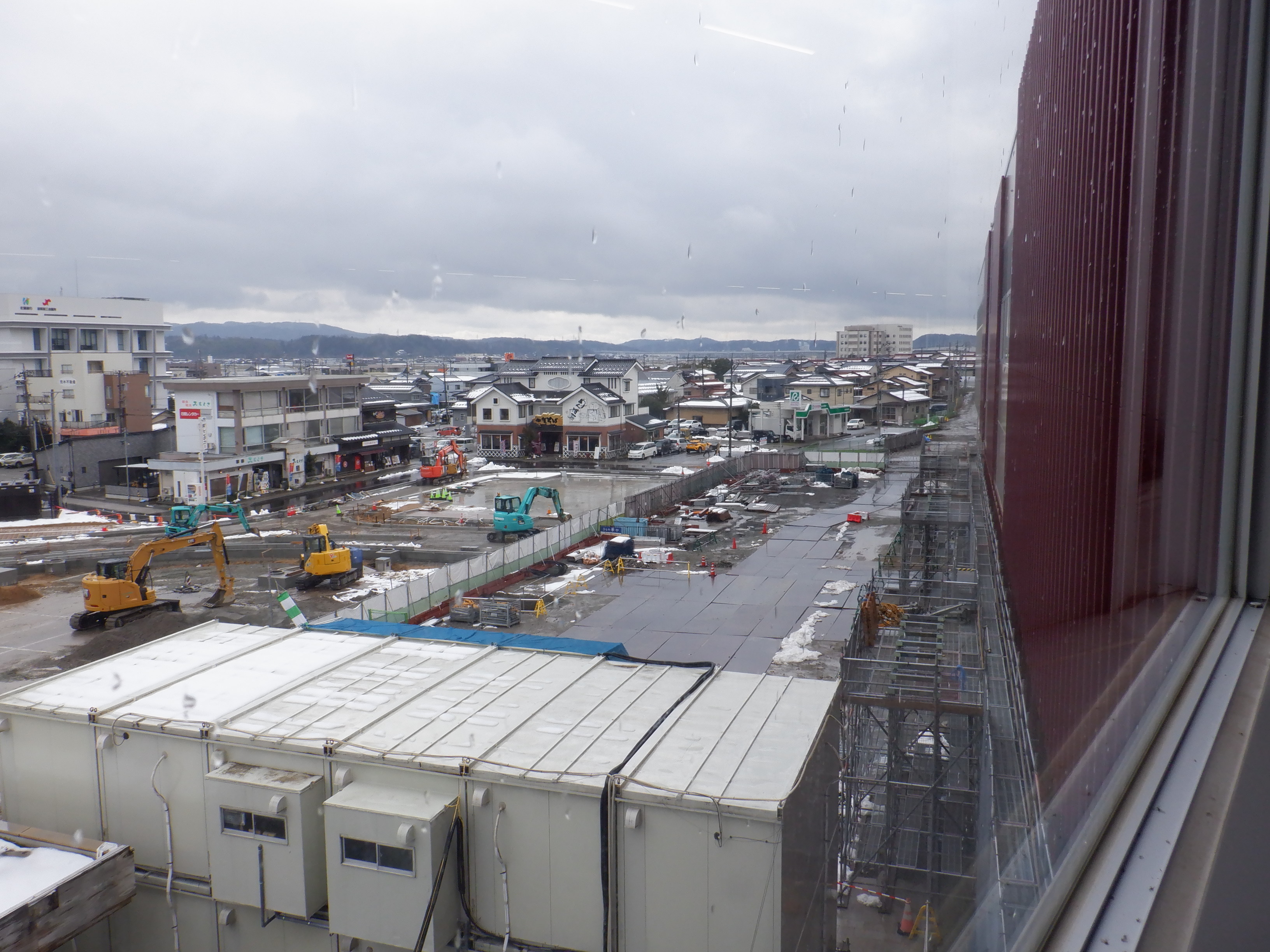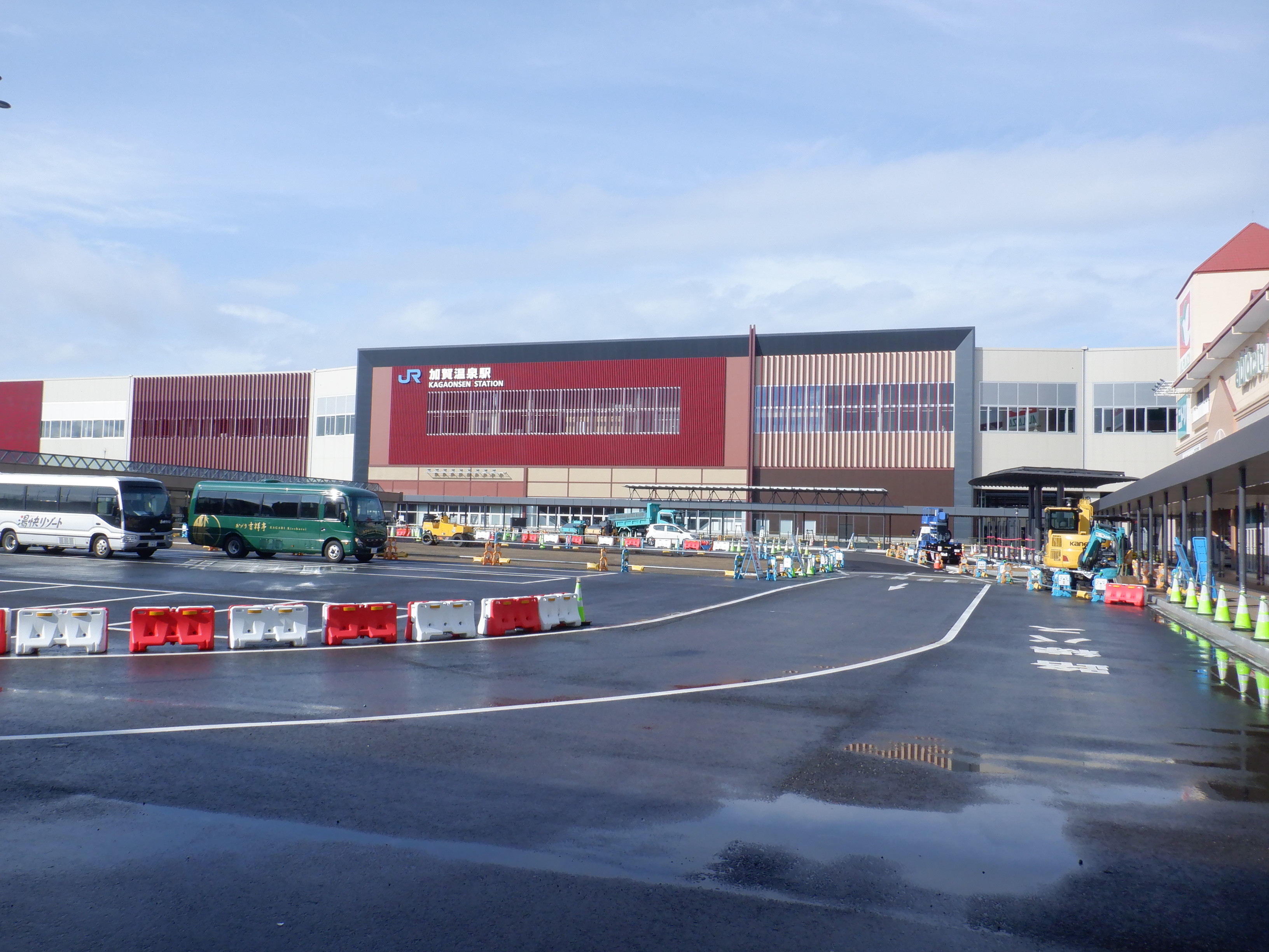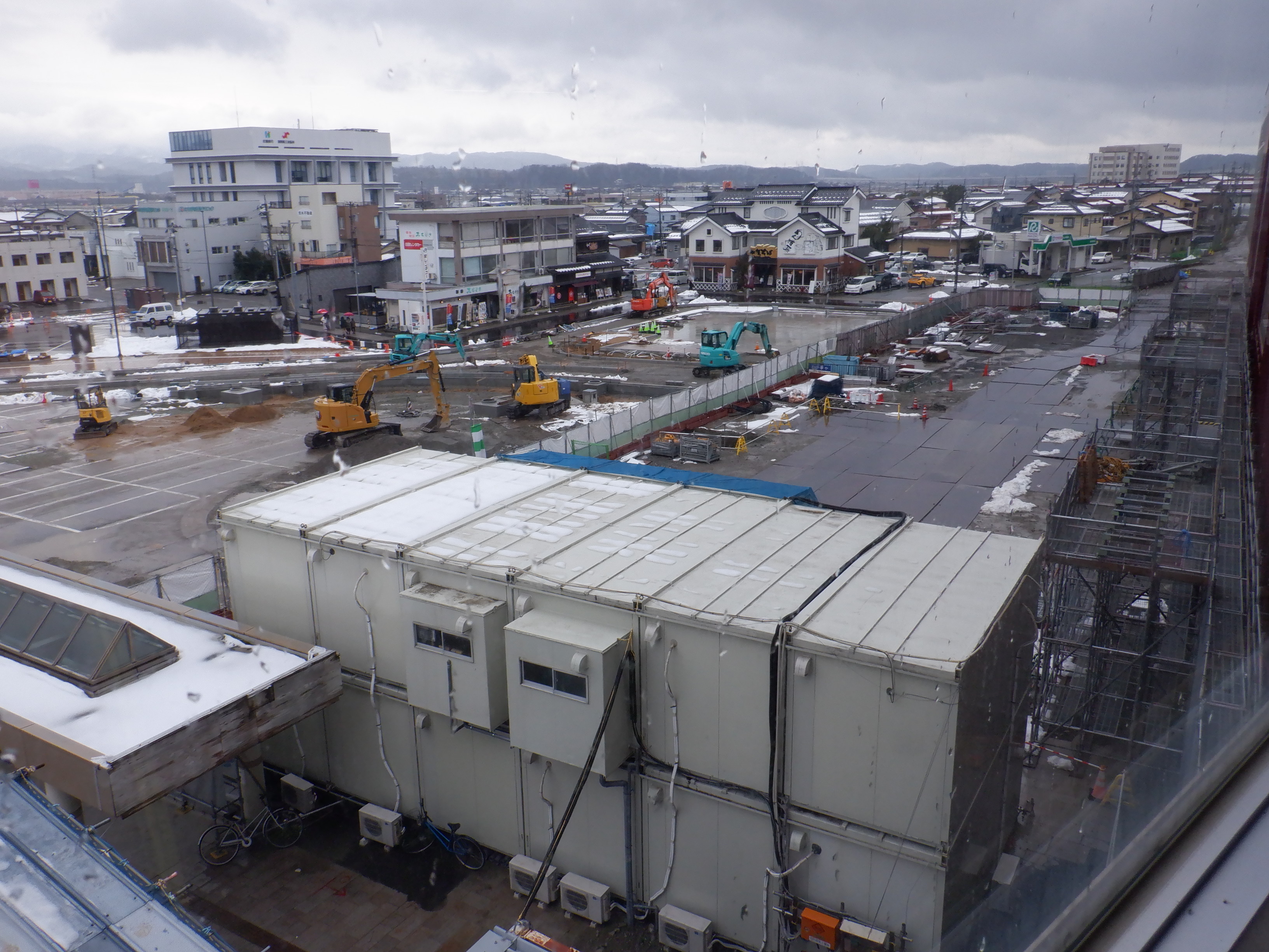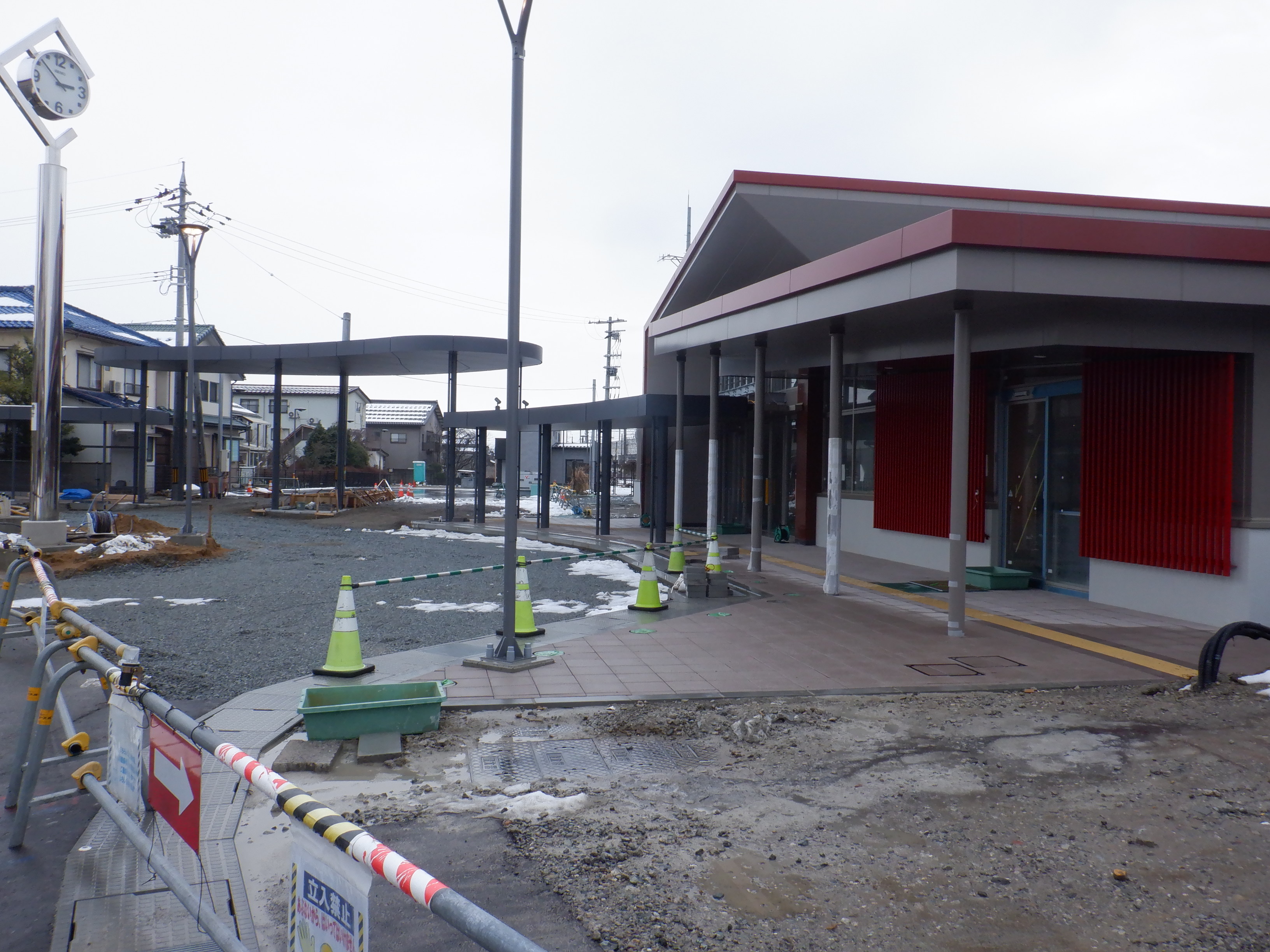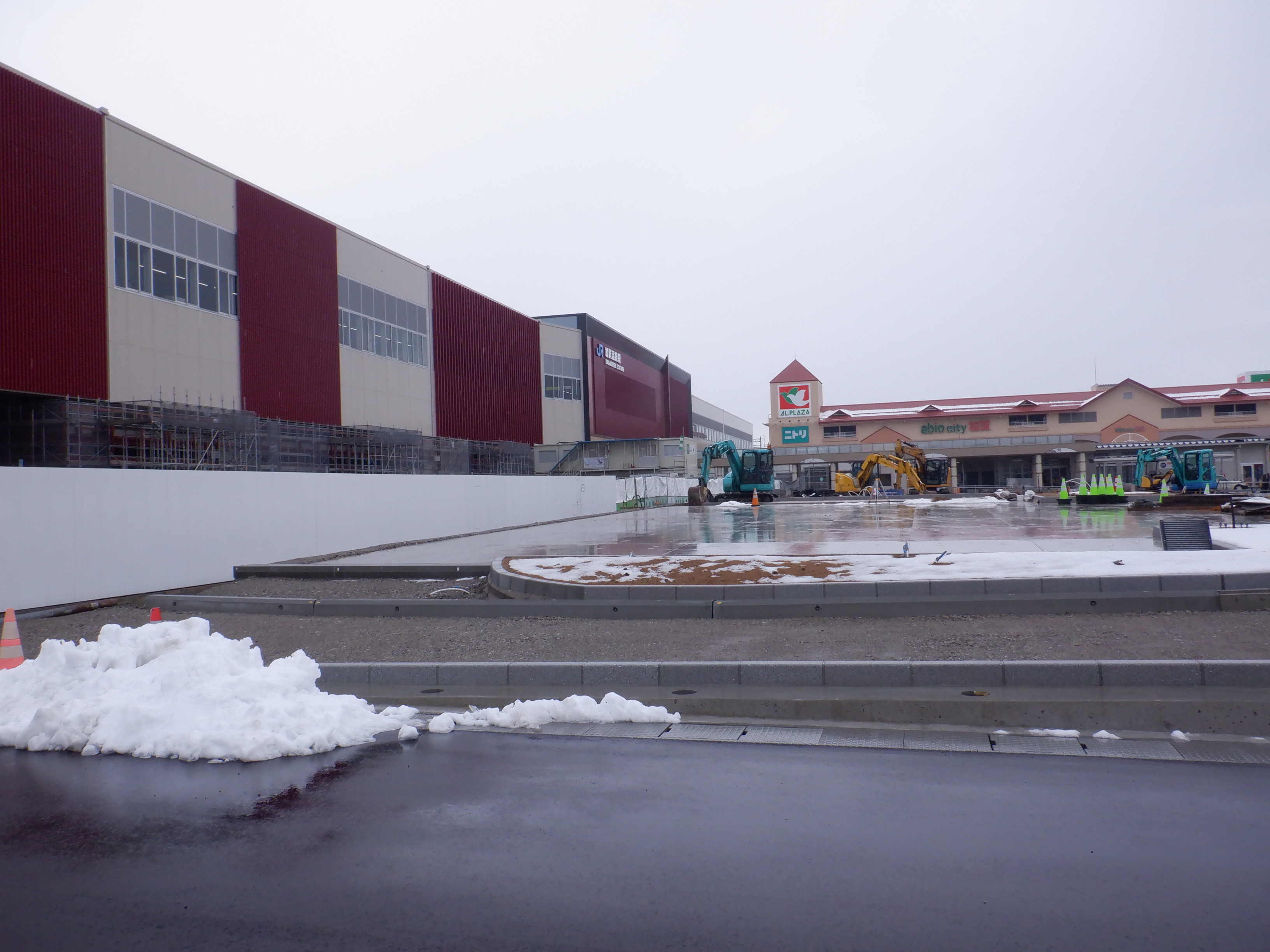 アルプラザ側から見た仮設駅舎等。