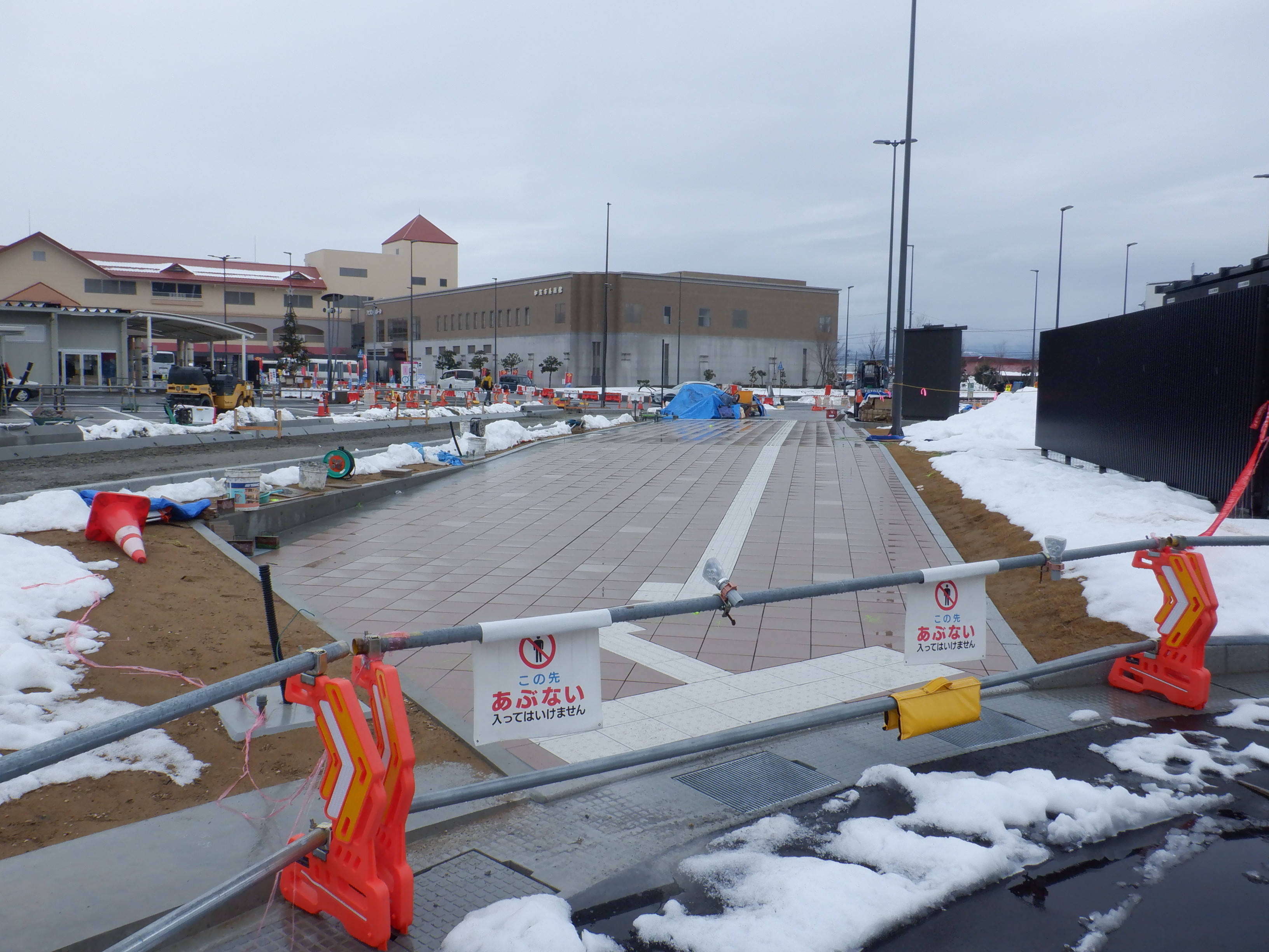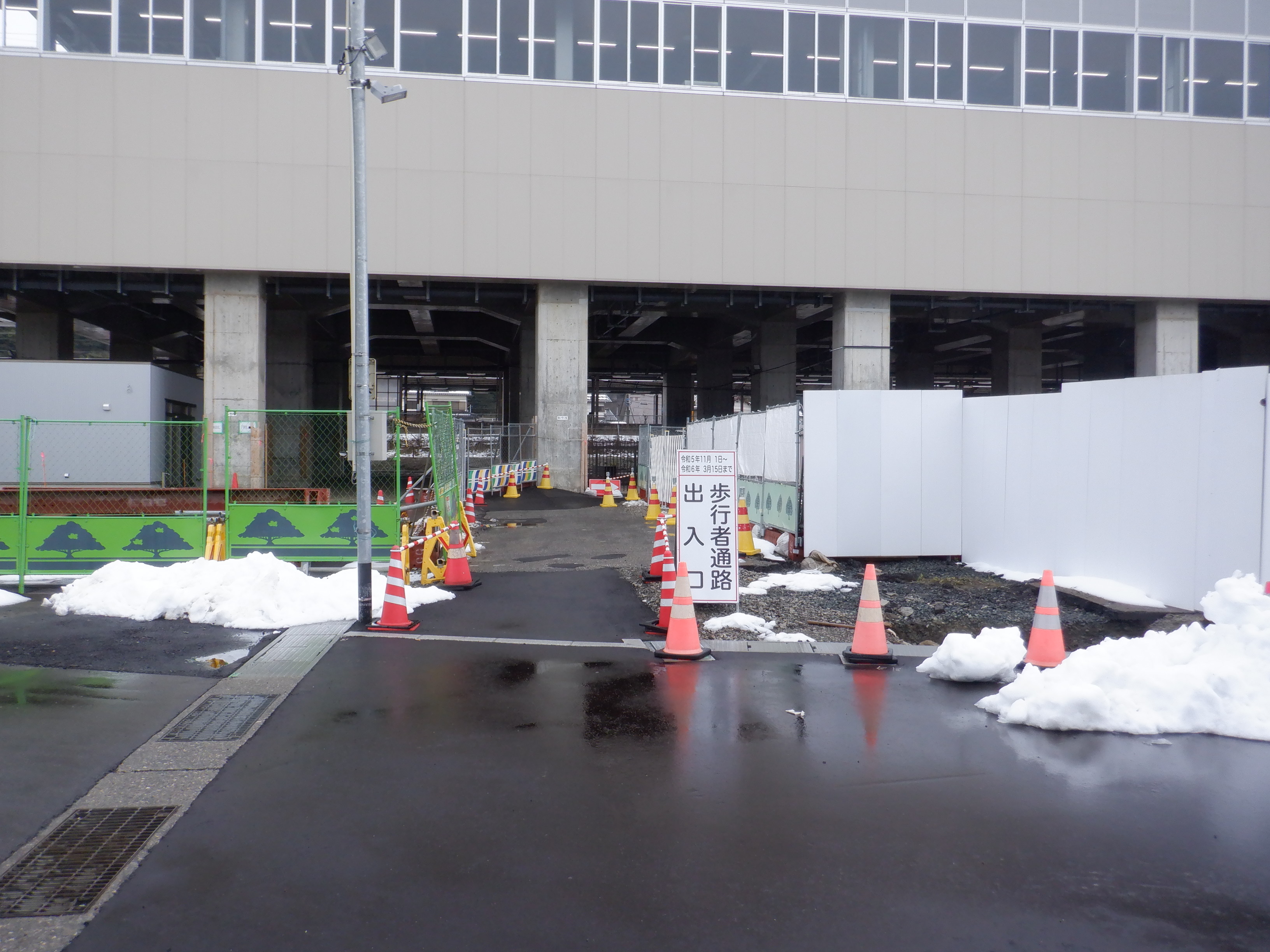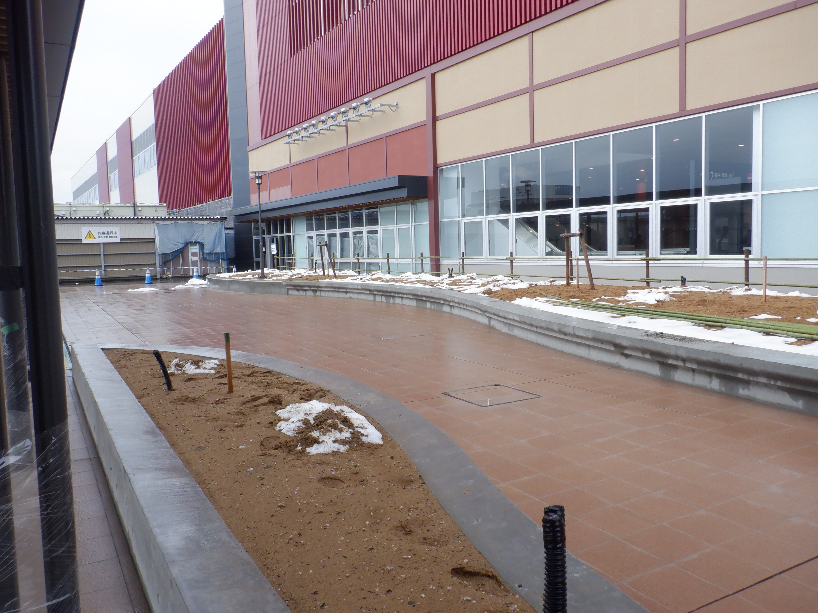 仮設駅舎とアルプラザの間。今回は歩道の下ではなく歩道の上が通路となりました。