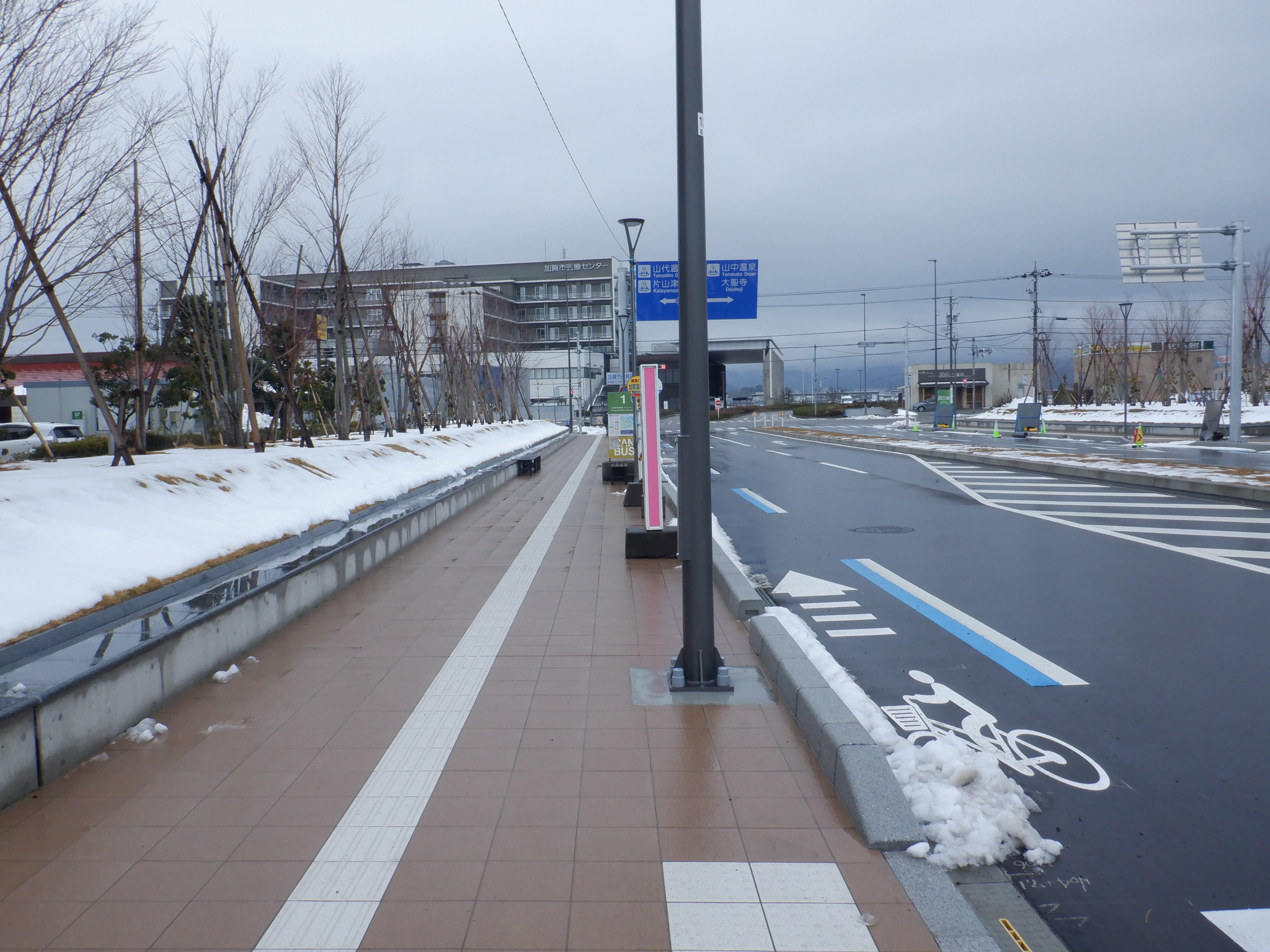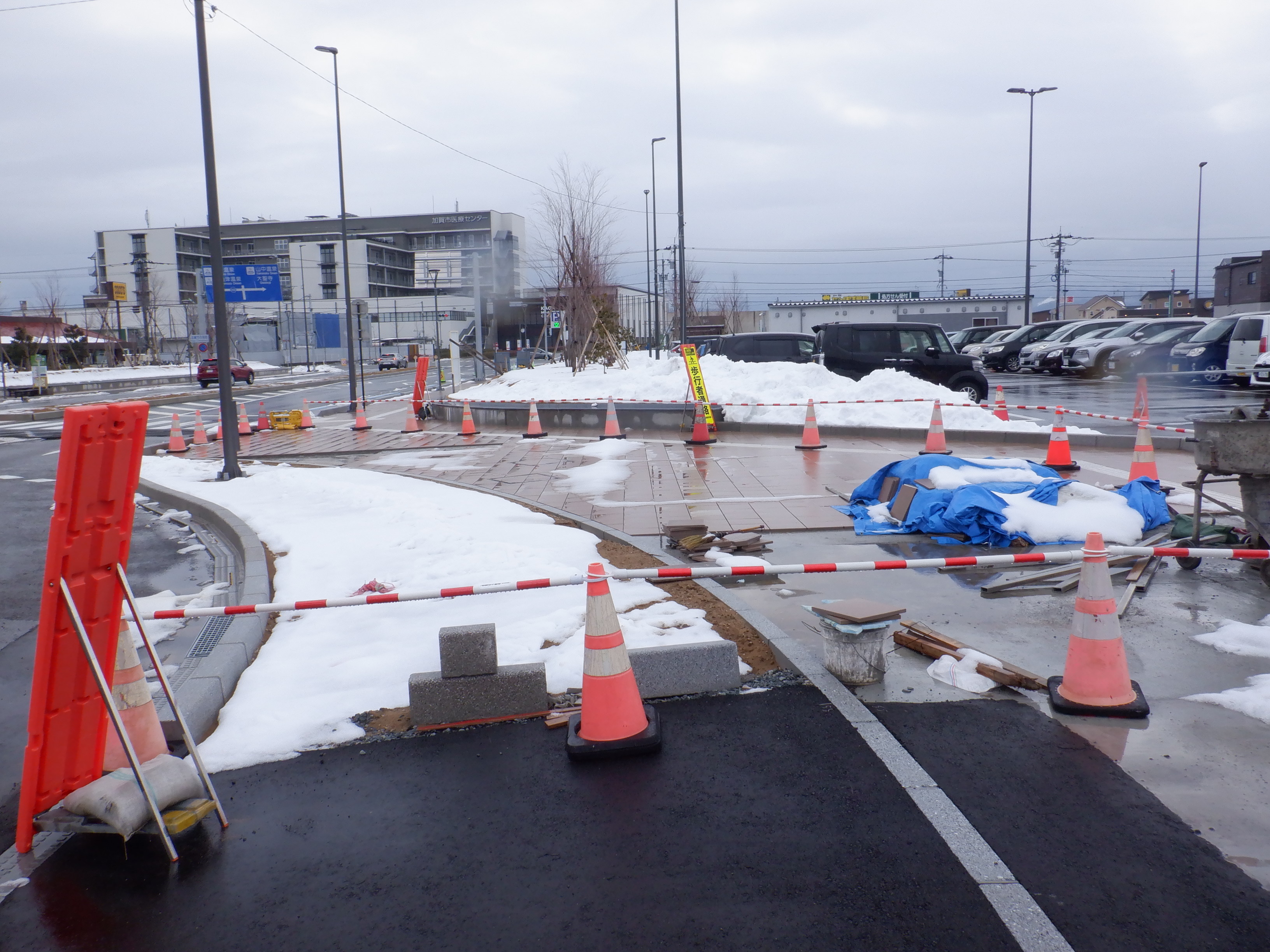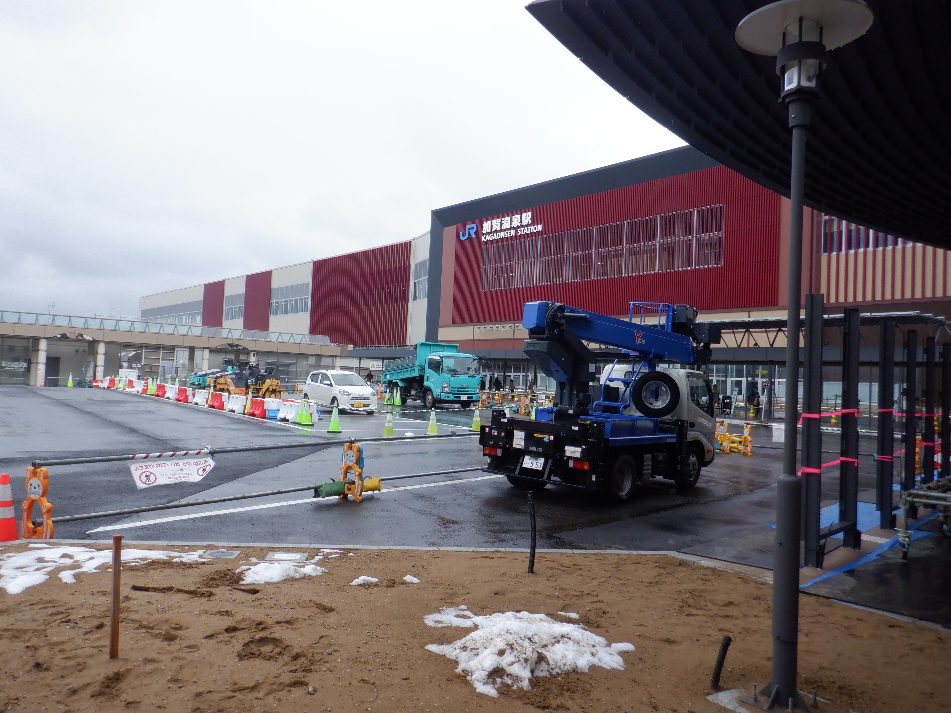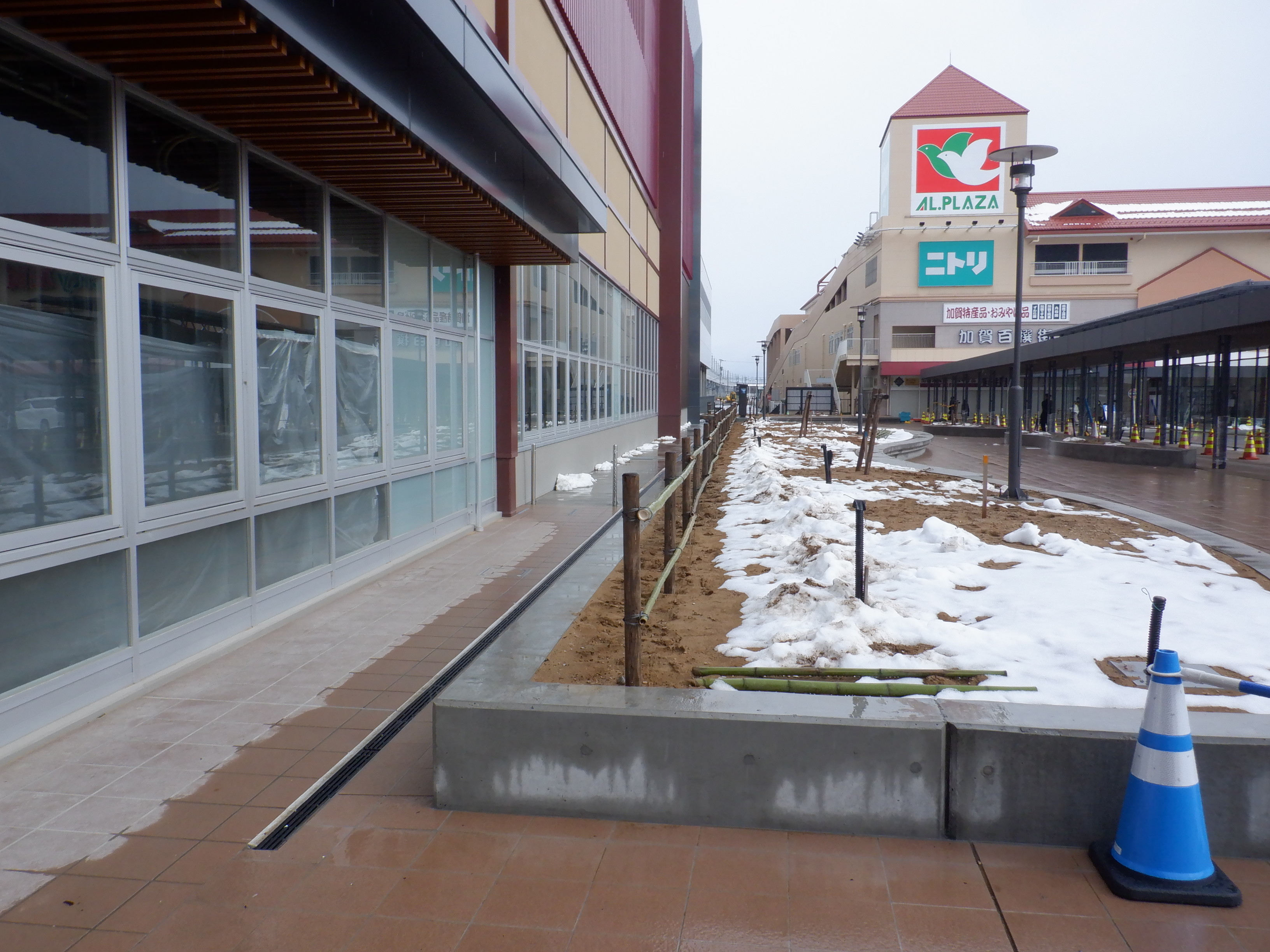 仮設駅舎とアルプラザの間。今回は歩道の下ではなく歩道の上が通路となりました。