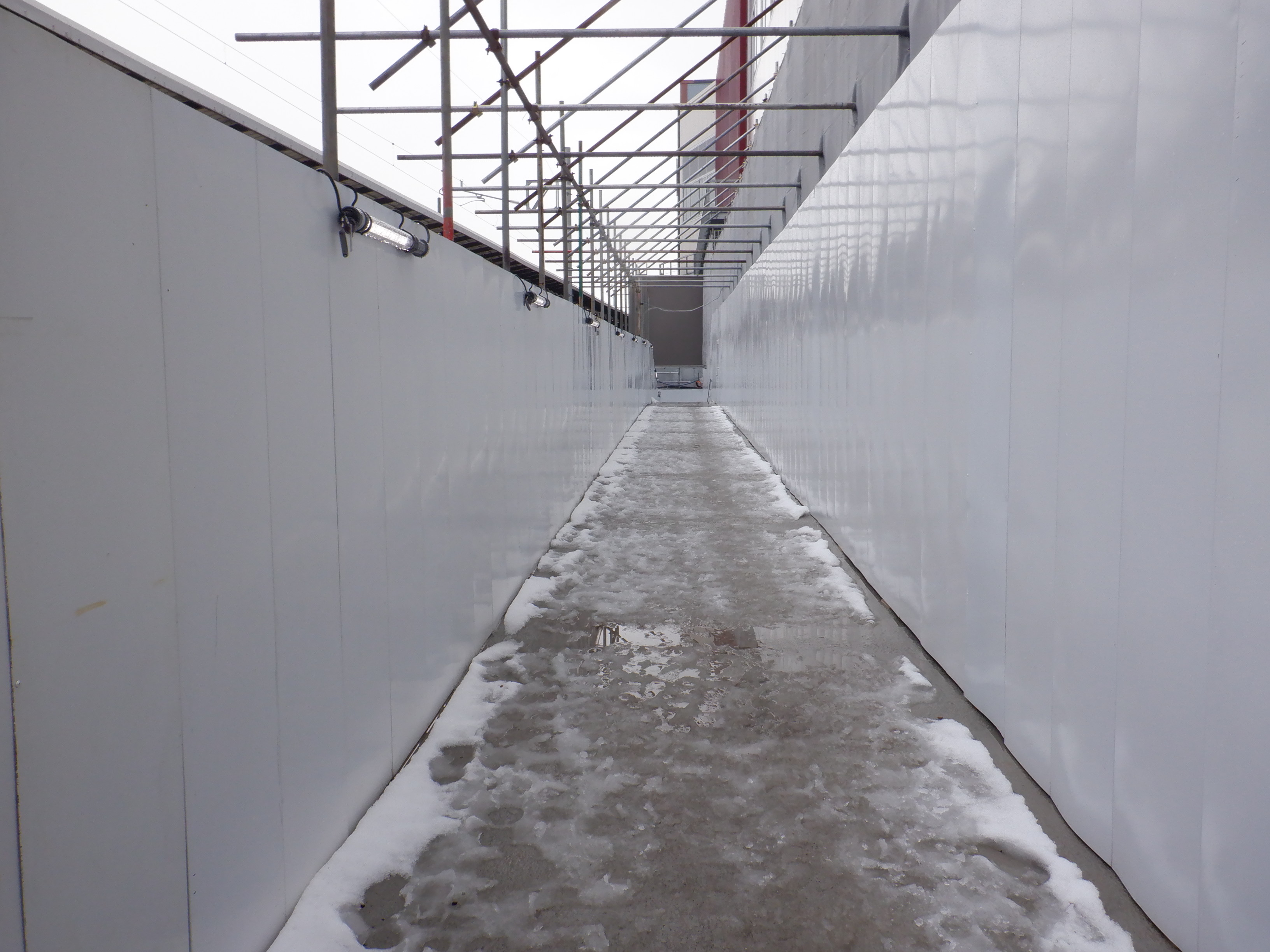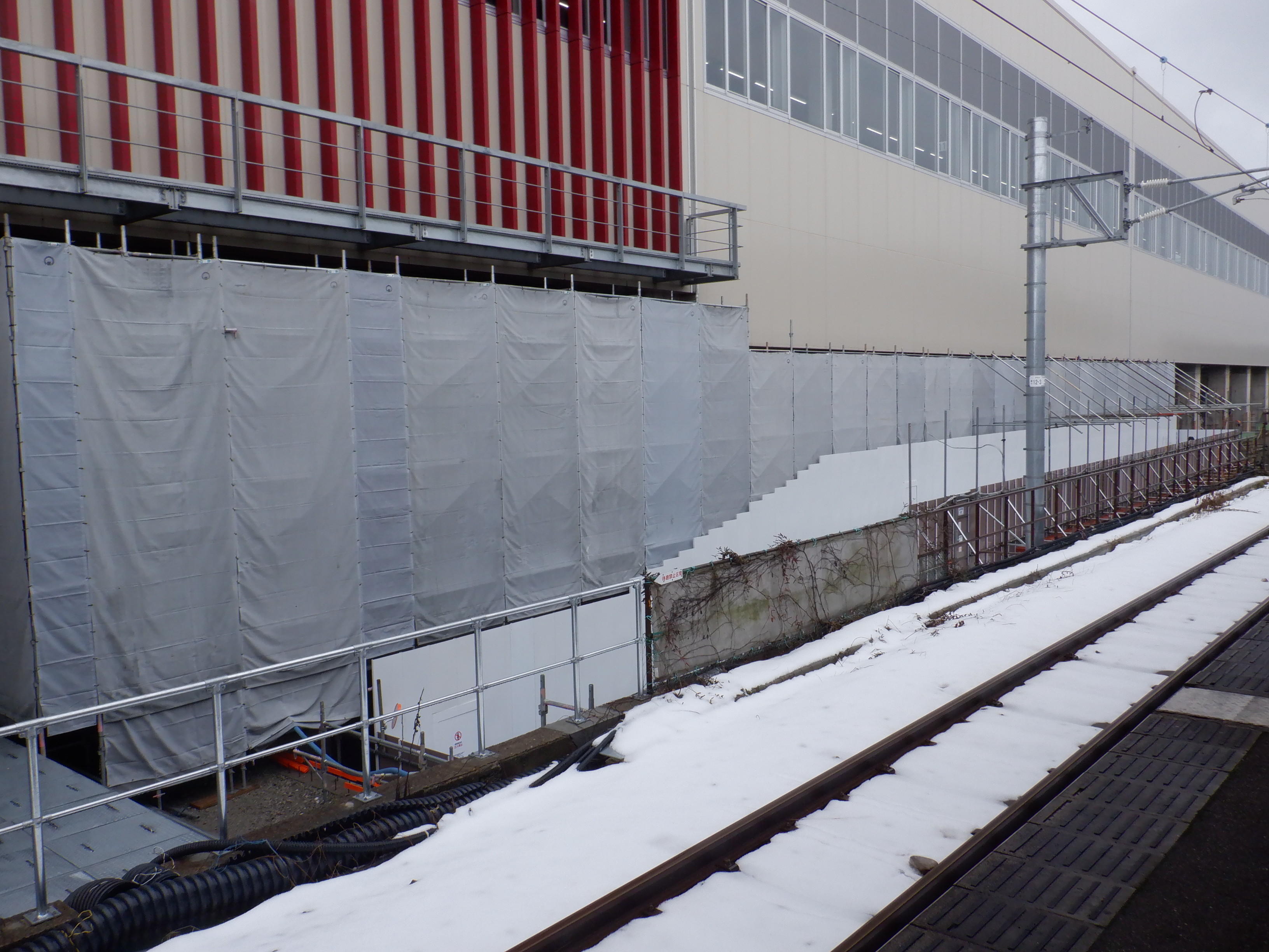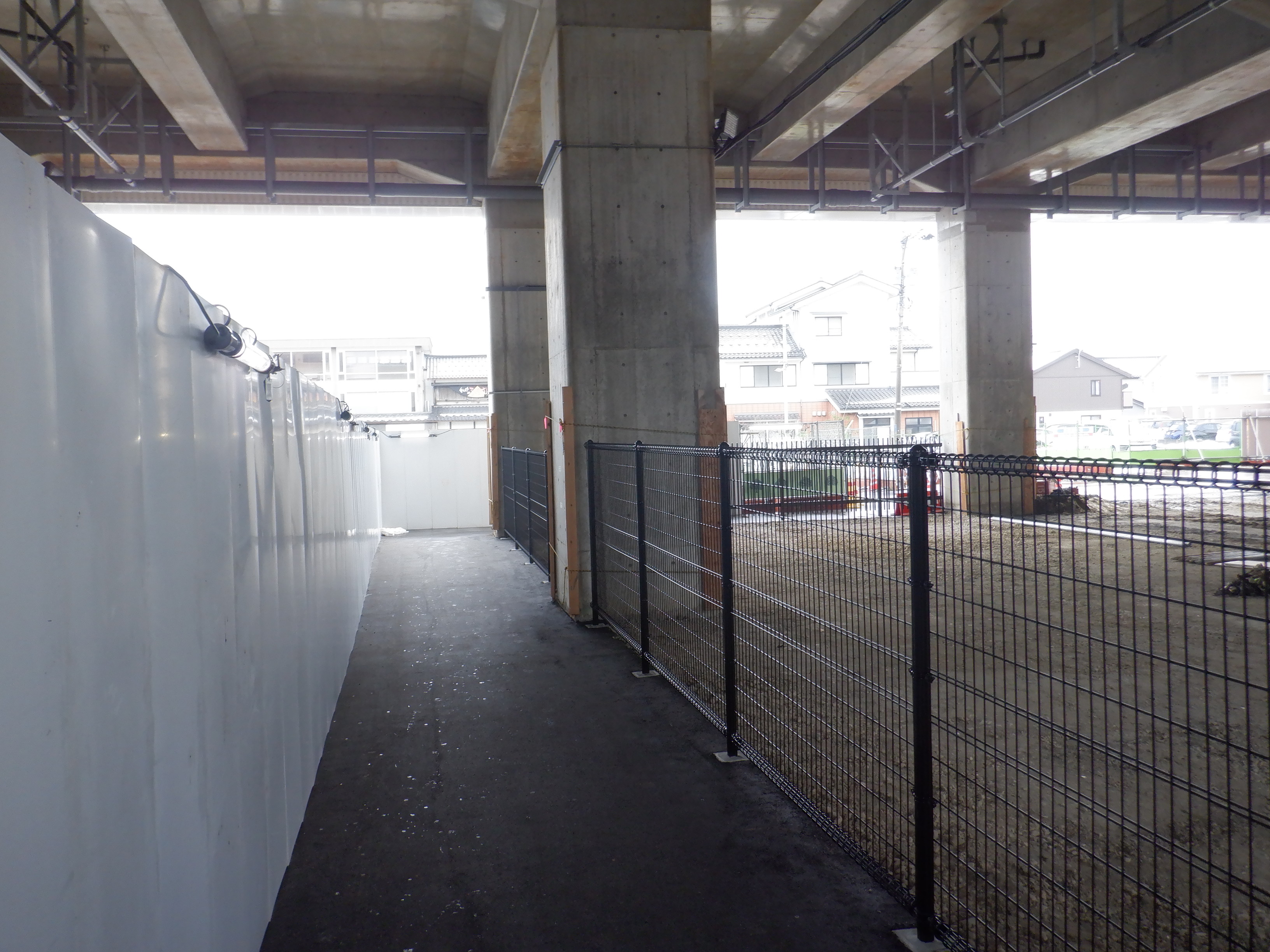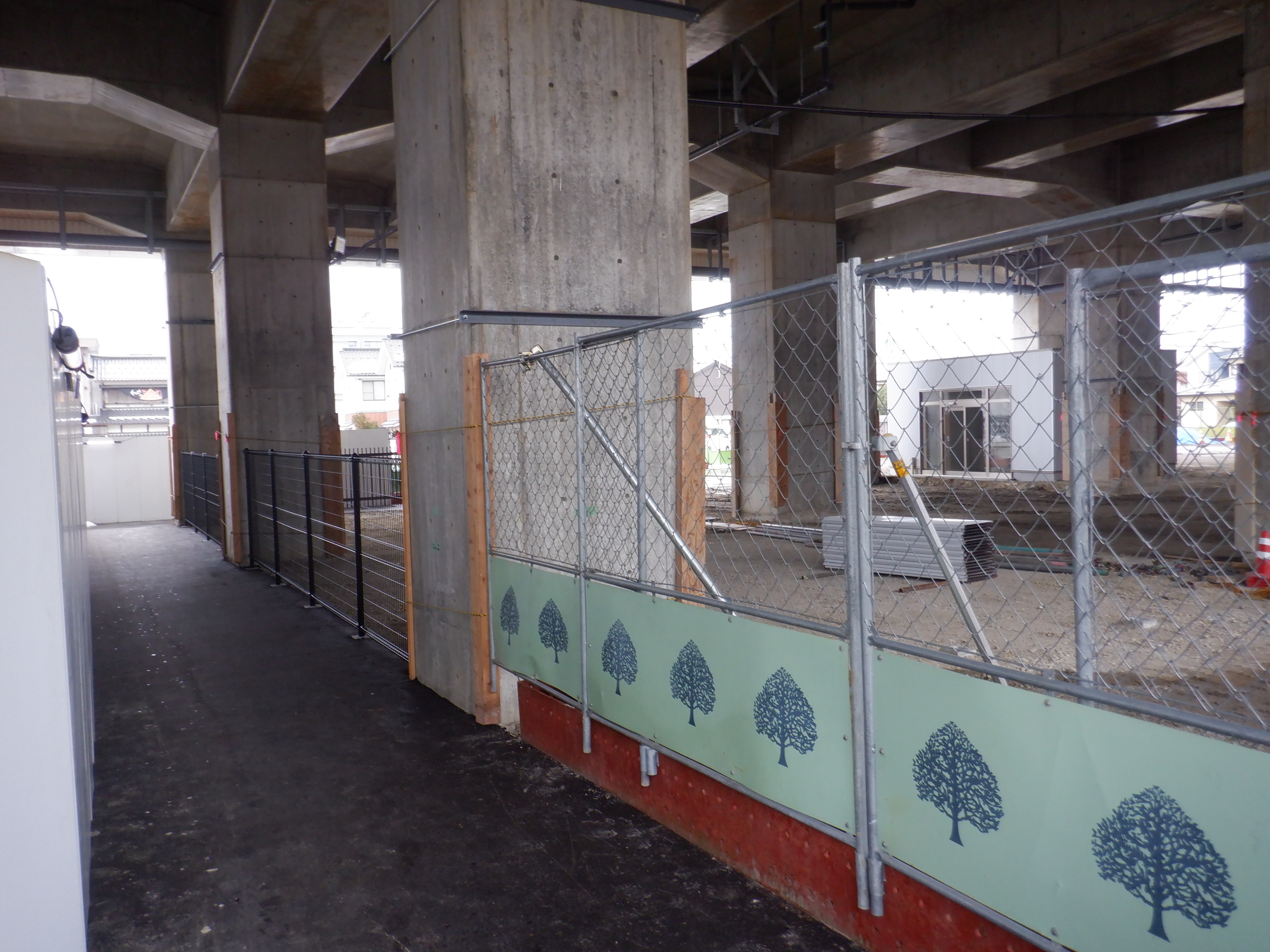 北口への迂回通路から見た高架下部都市施設(コンビニ・待合室等)建設中の様子。
