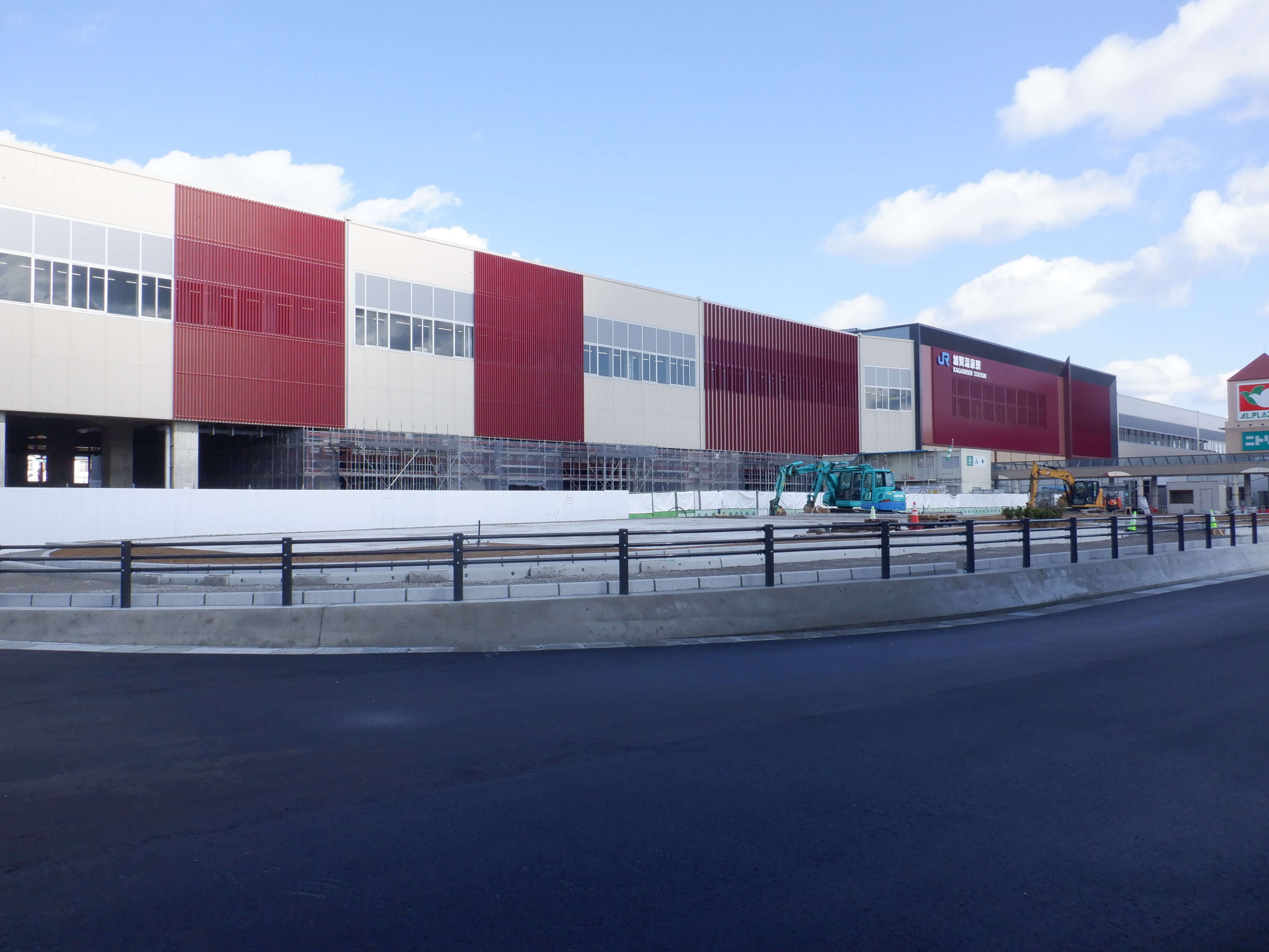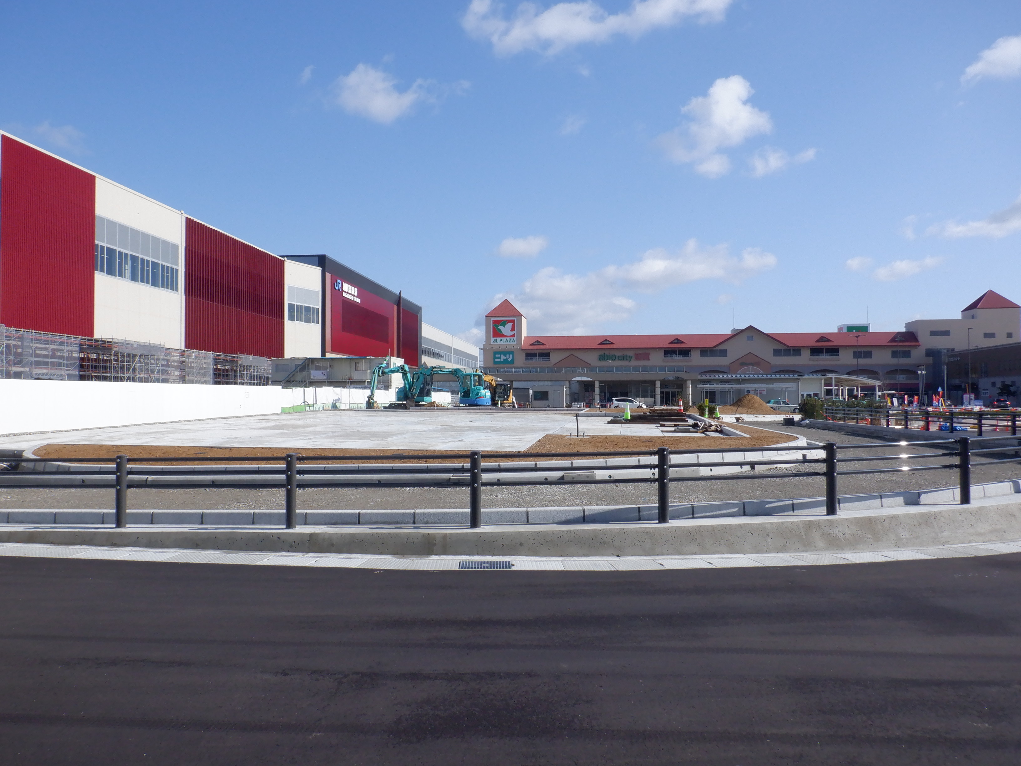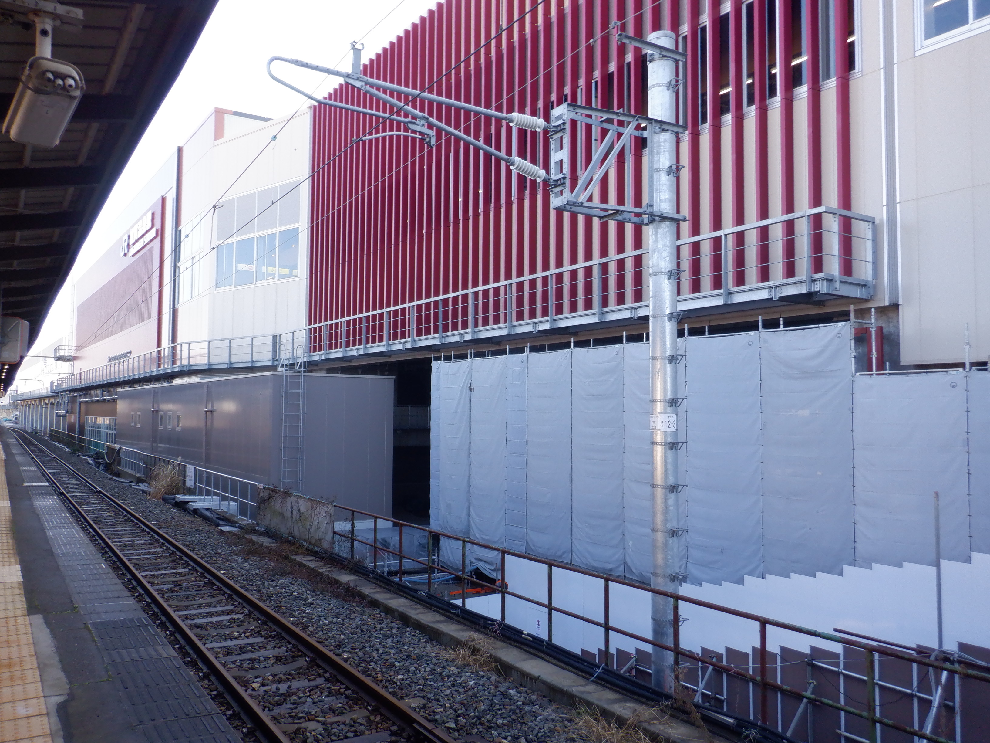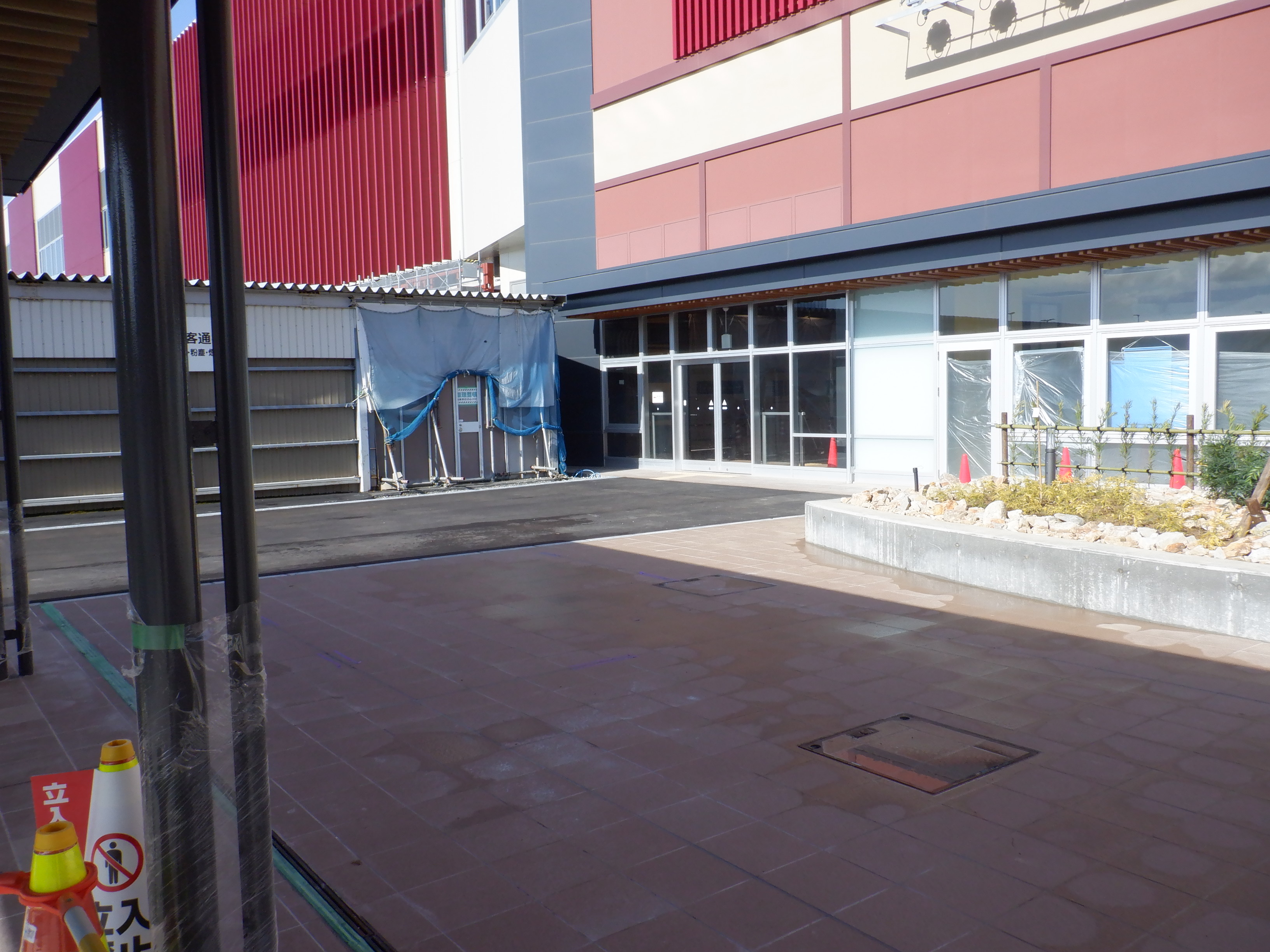 ホームの看板類は特に変化はありませんが、近距離券売機が撤去されるなど変化が出てきました。仮設駅舎とアルプラザの間の通路の整備が進んでいます。