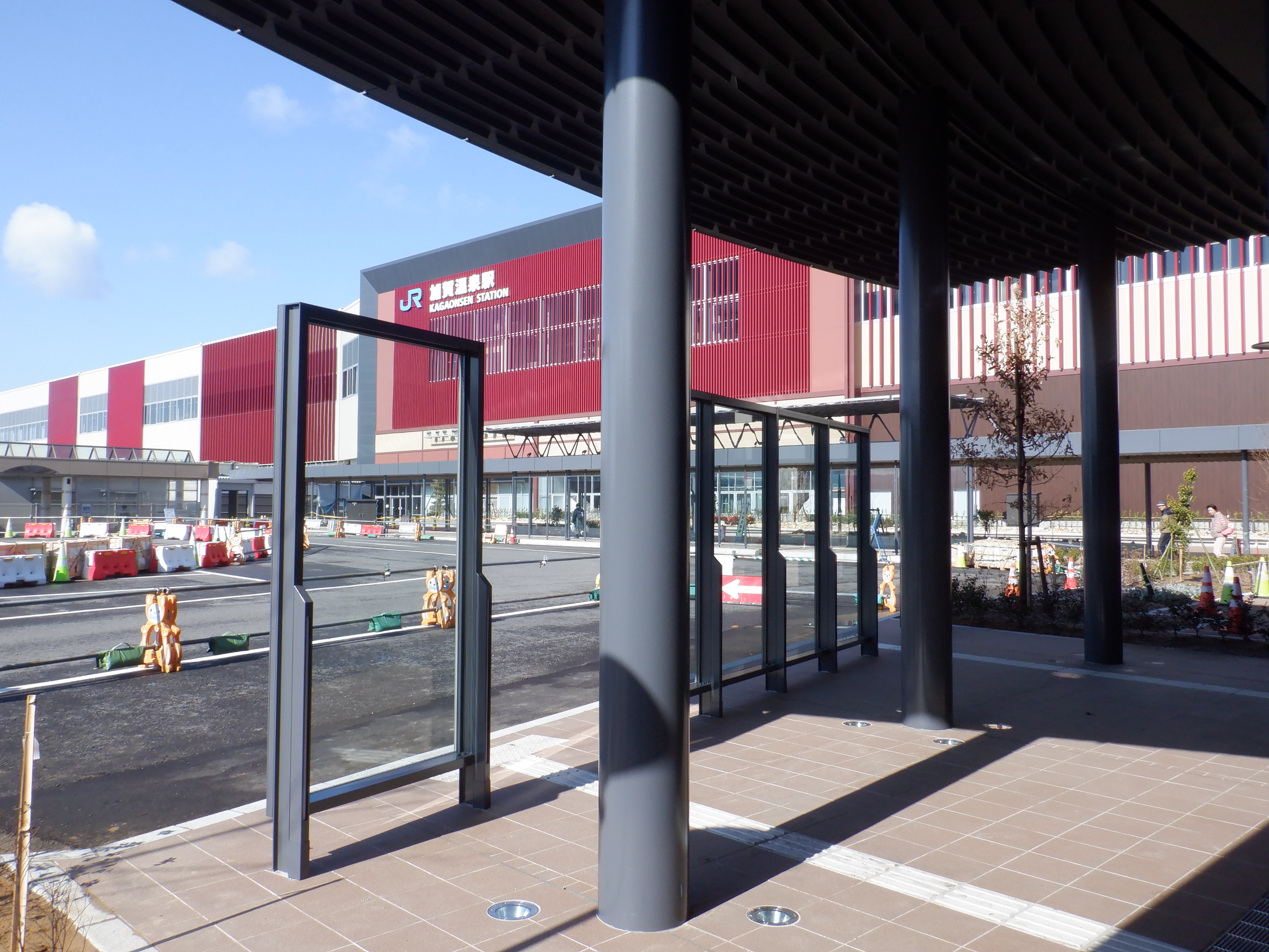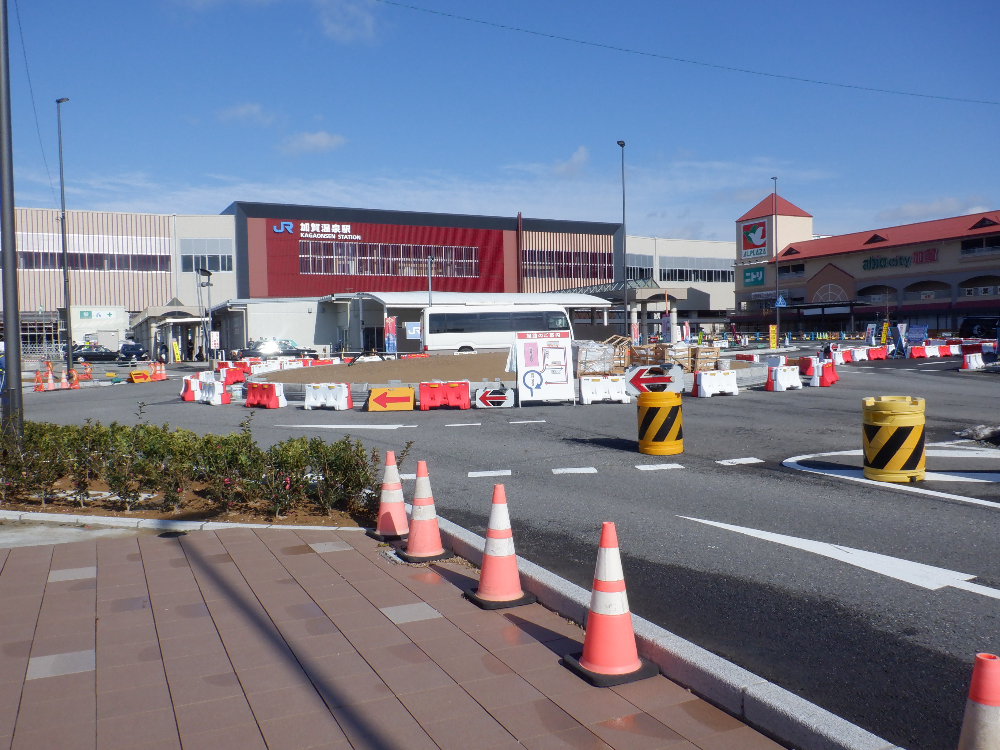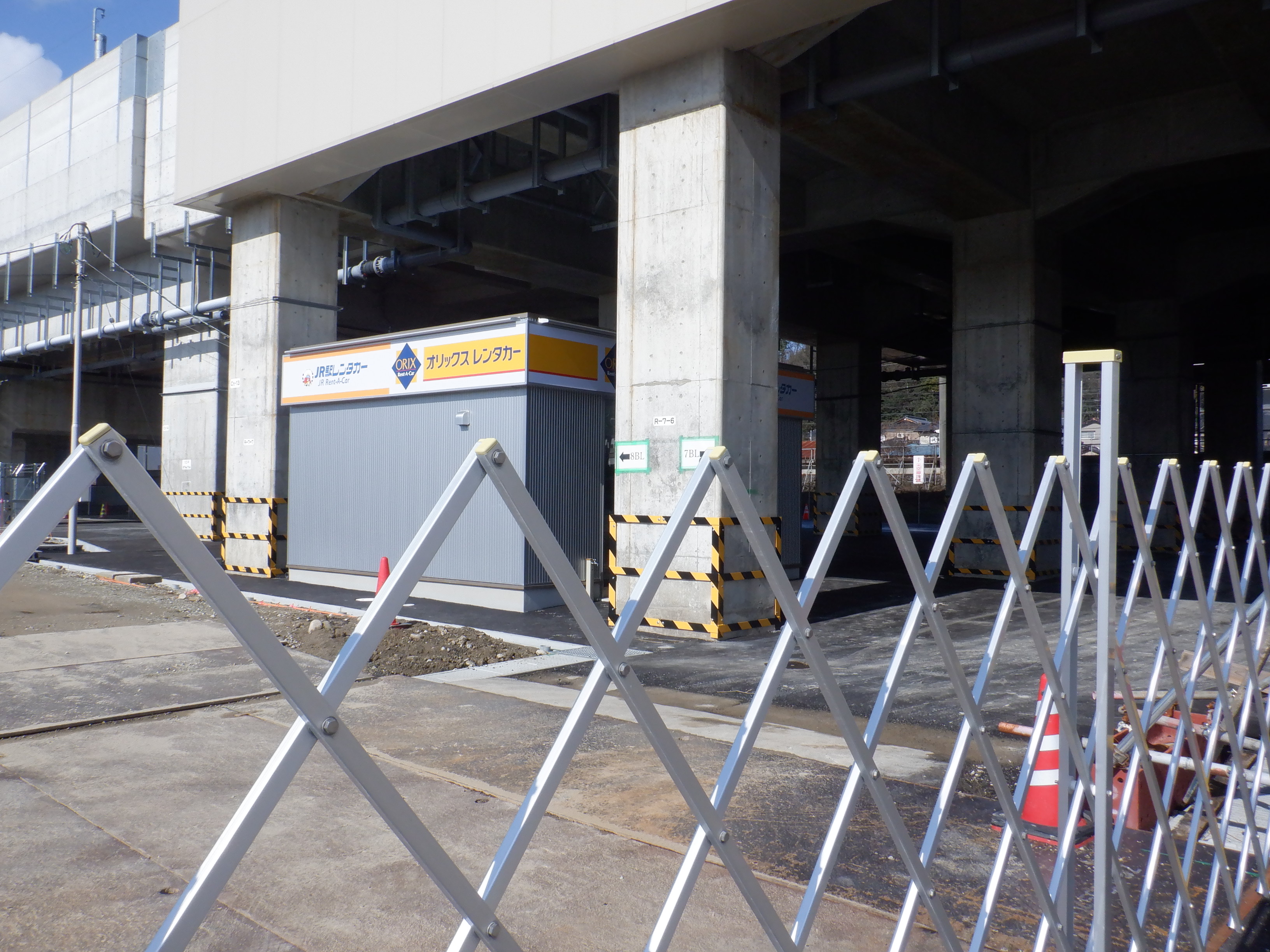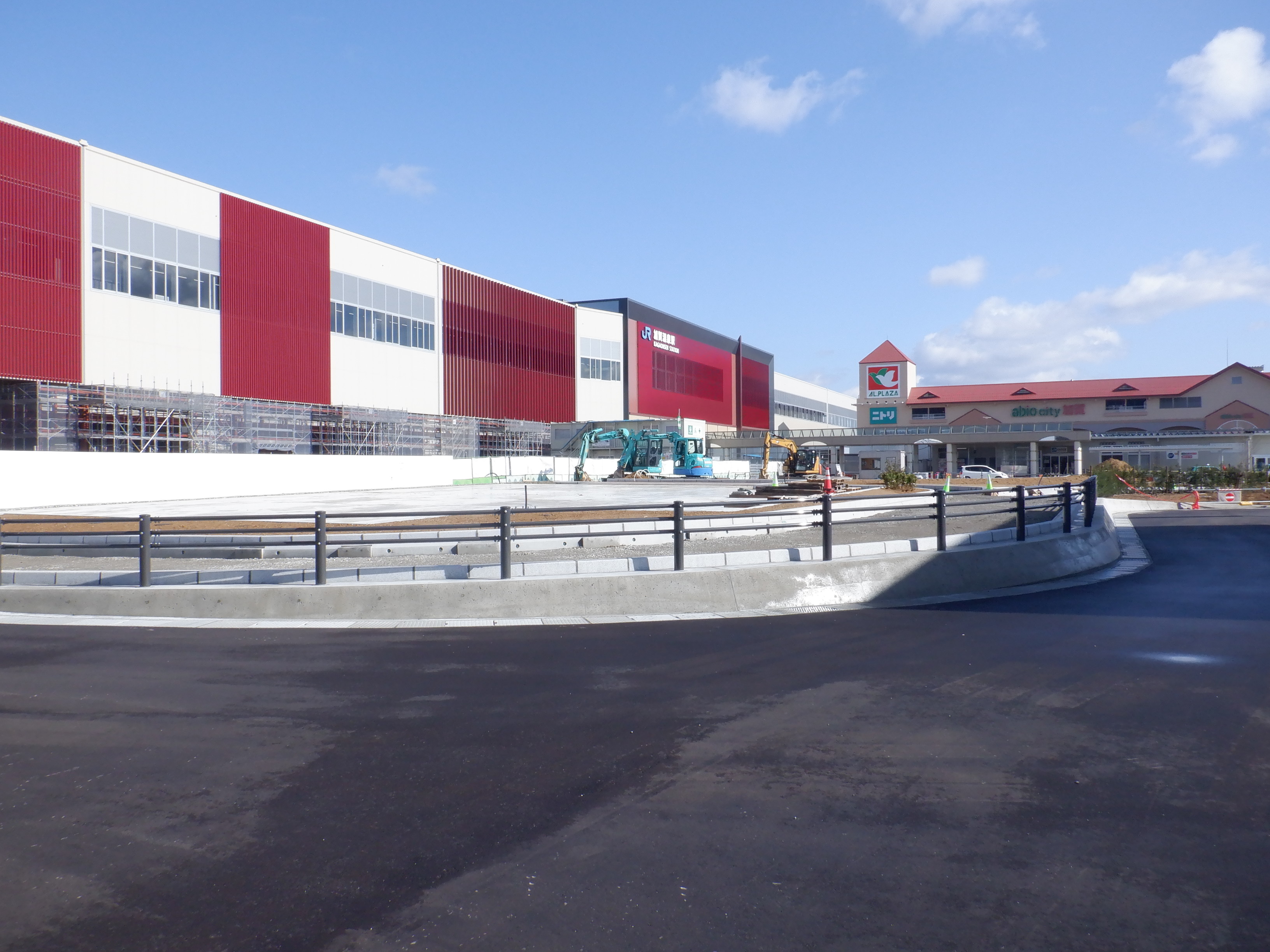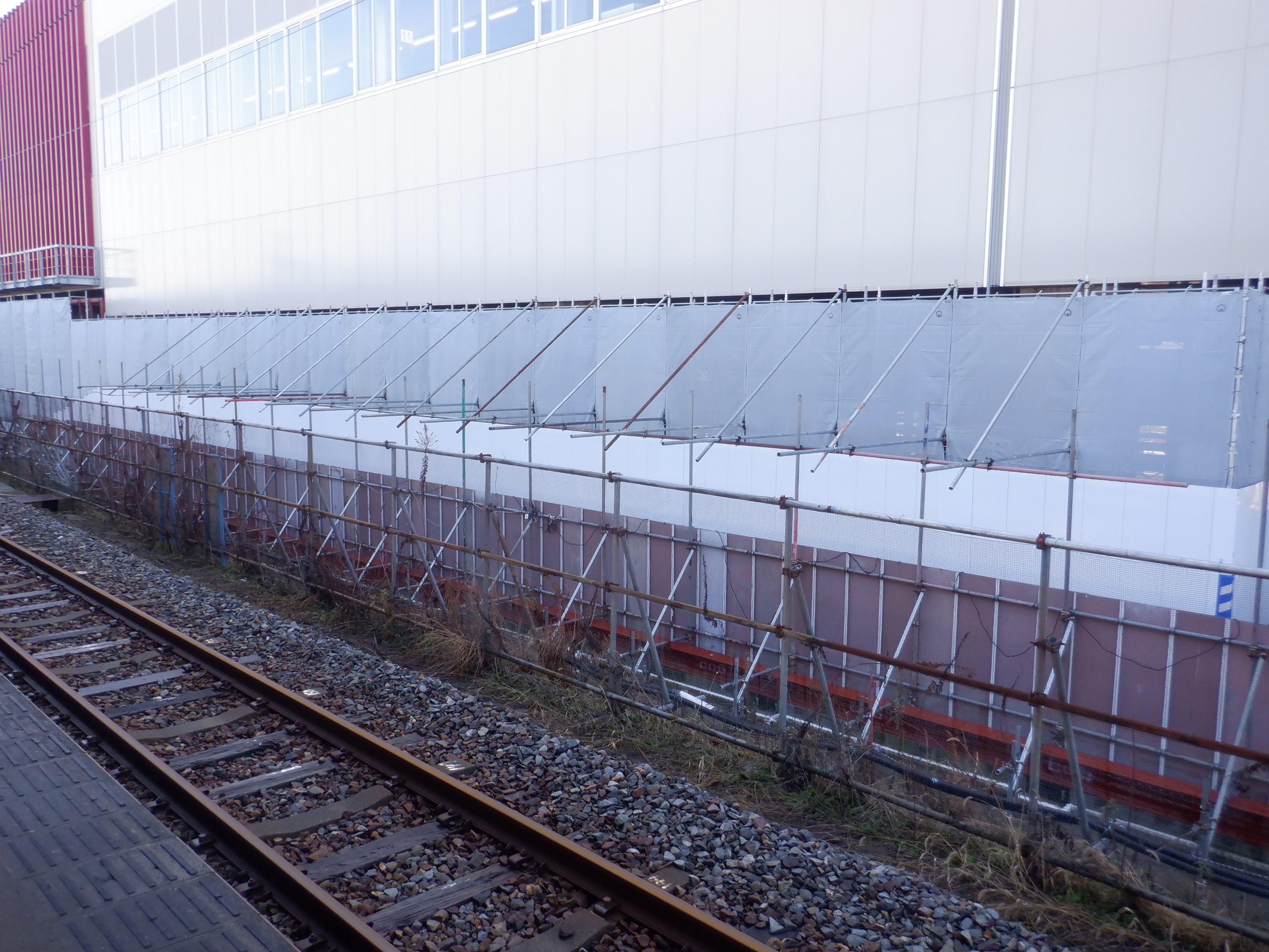 ホームの看板類は特に変化はありませんが、近距離券売機が撤去されるなど変化が出てきました。仮設駅舎とアルプラザの間の通路の整備が進んでいます。