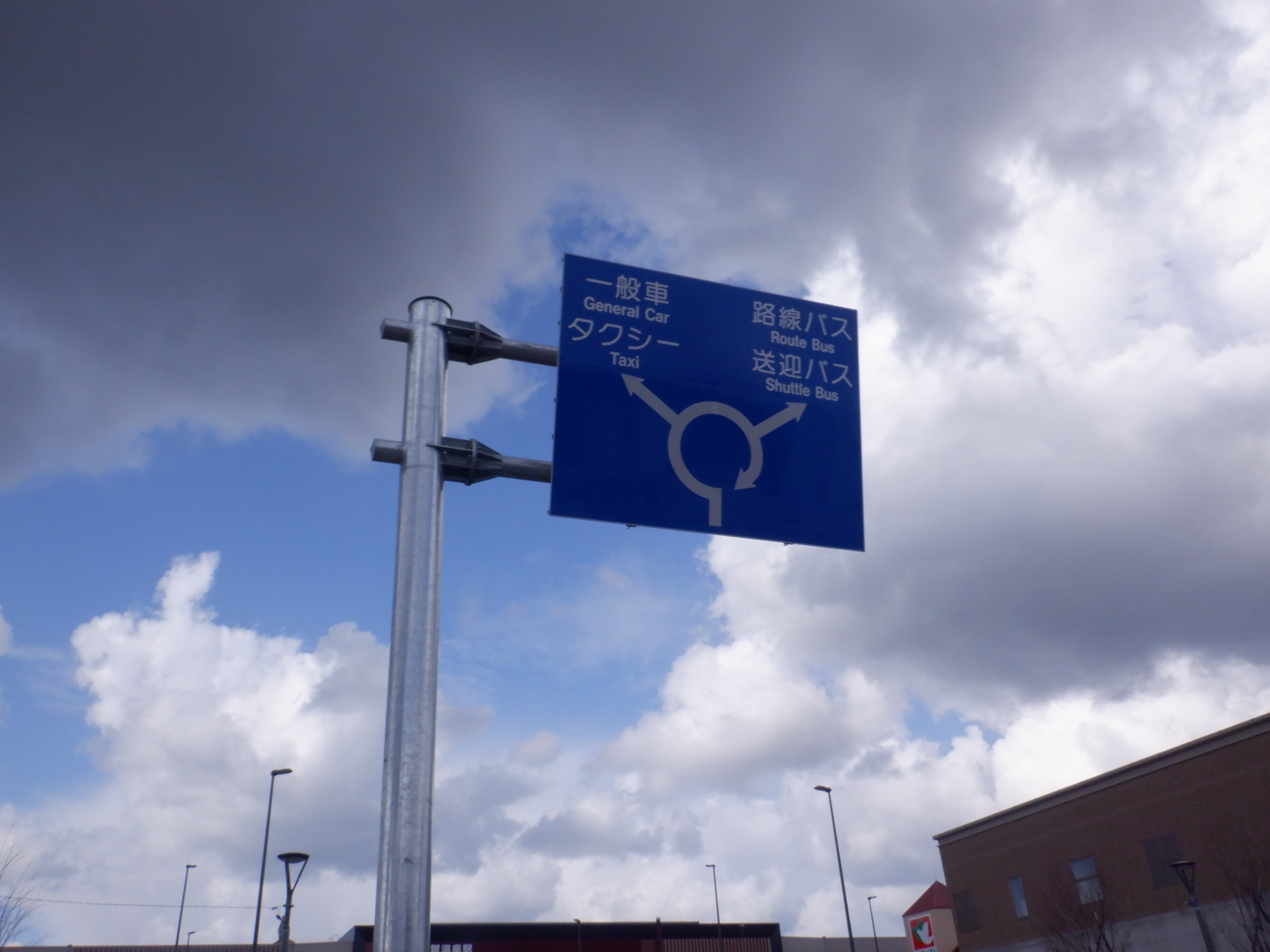 駅正面の環状交差点と青看板。ようやく文字が入りました。