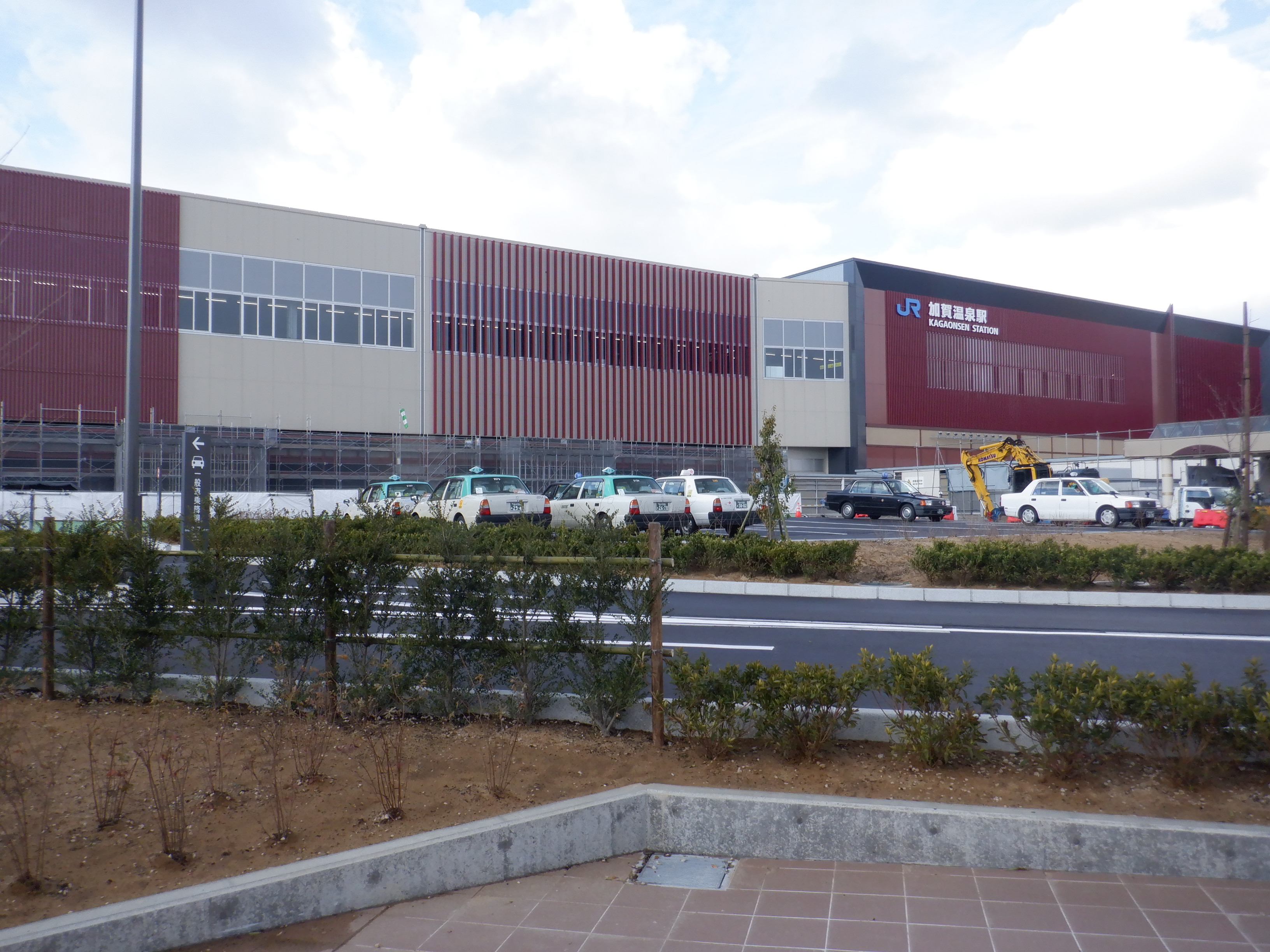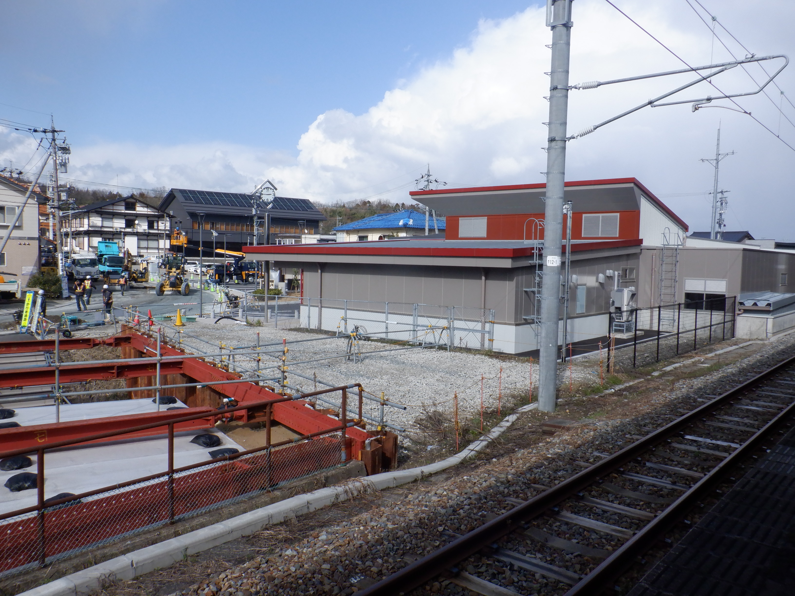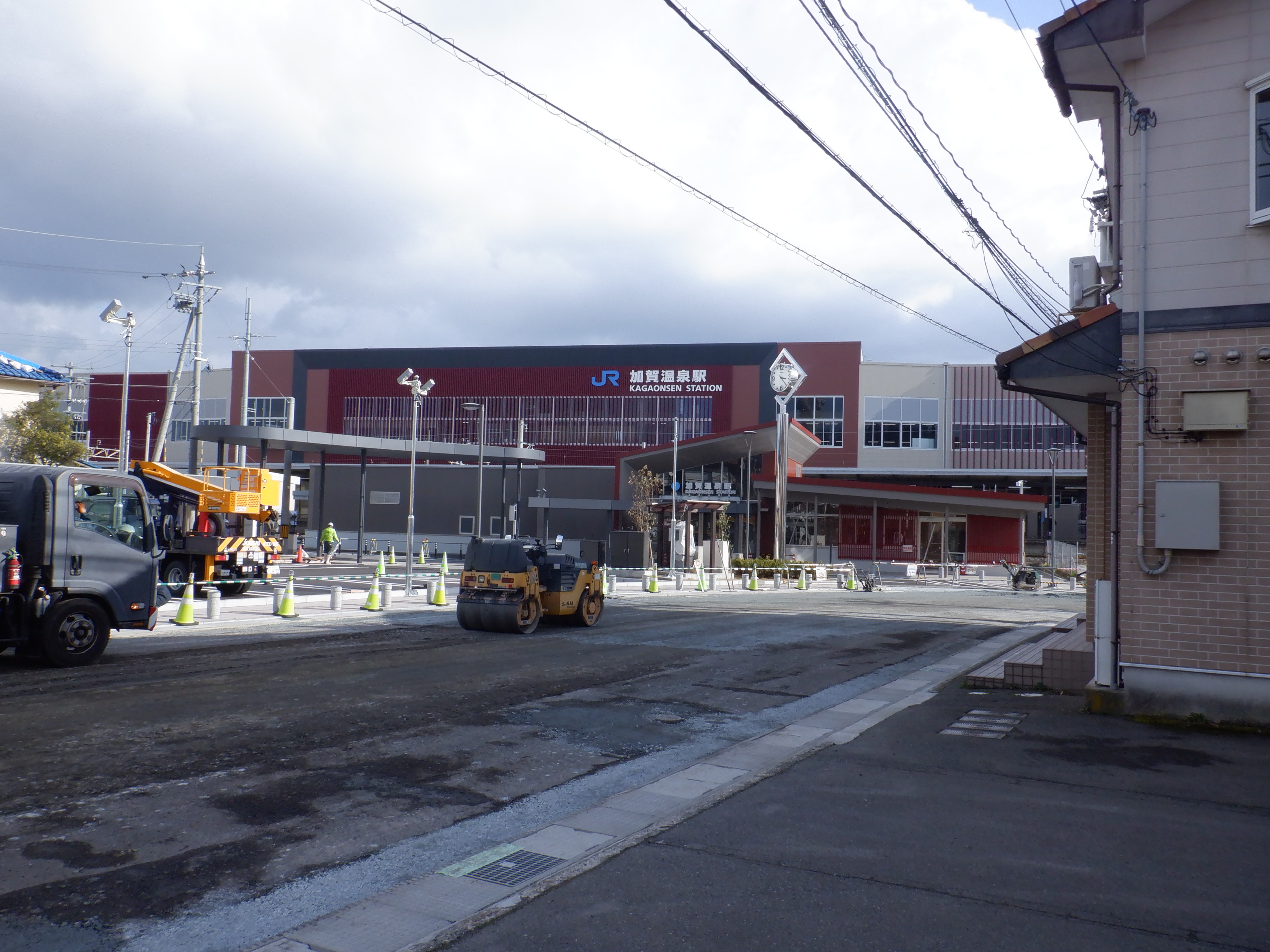 IRいしかわ鉄道への移管・新幹線開業まで1週間となりました。ホームの駅名標等は新しいものに差し替えられた後、JRとしても継続して使用する体制になっています。北口の駅前広場も工事が続いていました。この駅については、移管後・新幹線開業後もまだまだ工事が続きます。