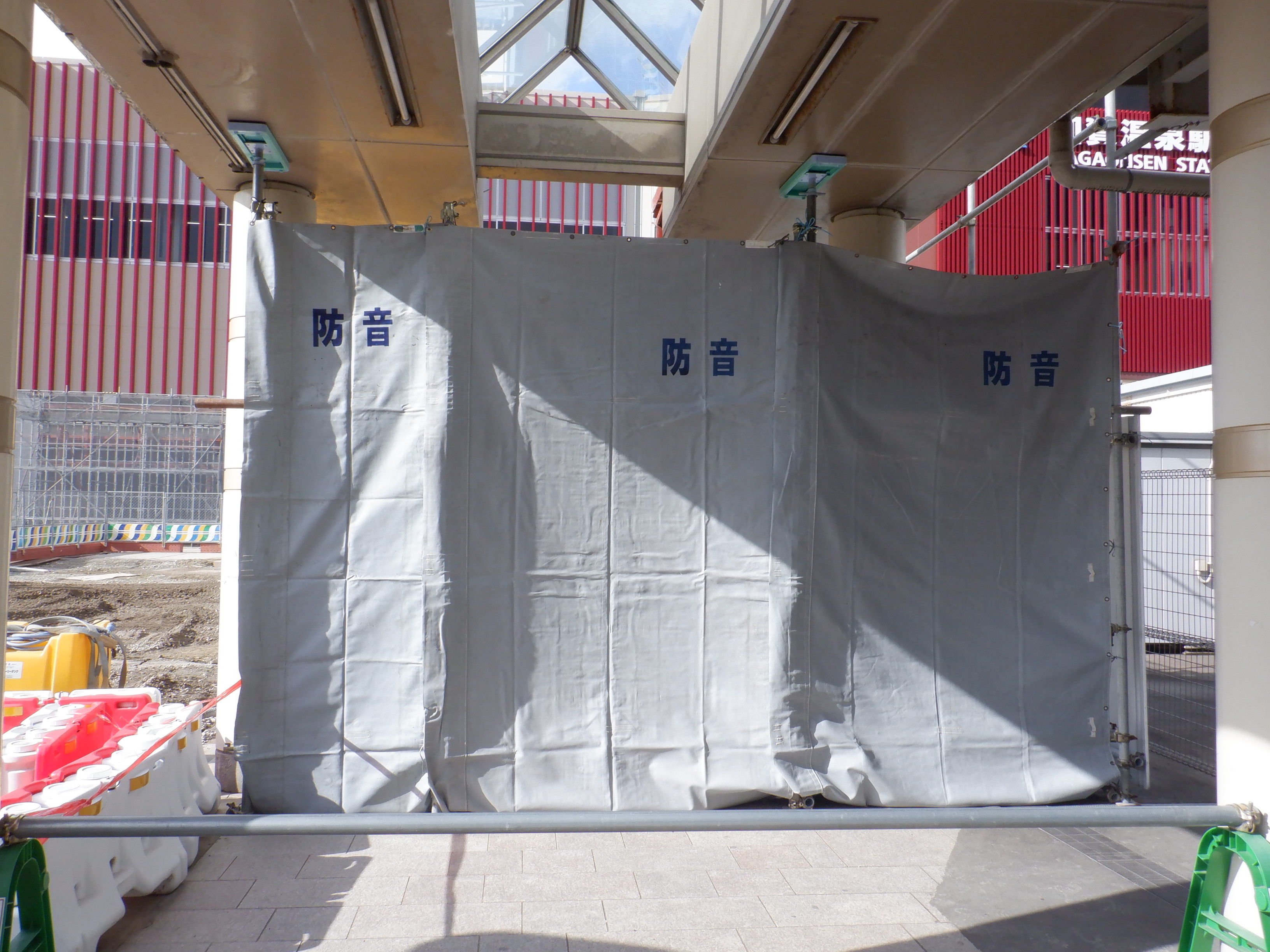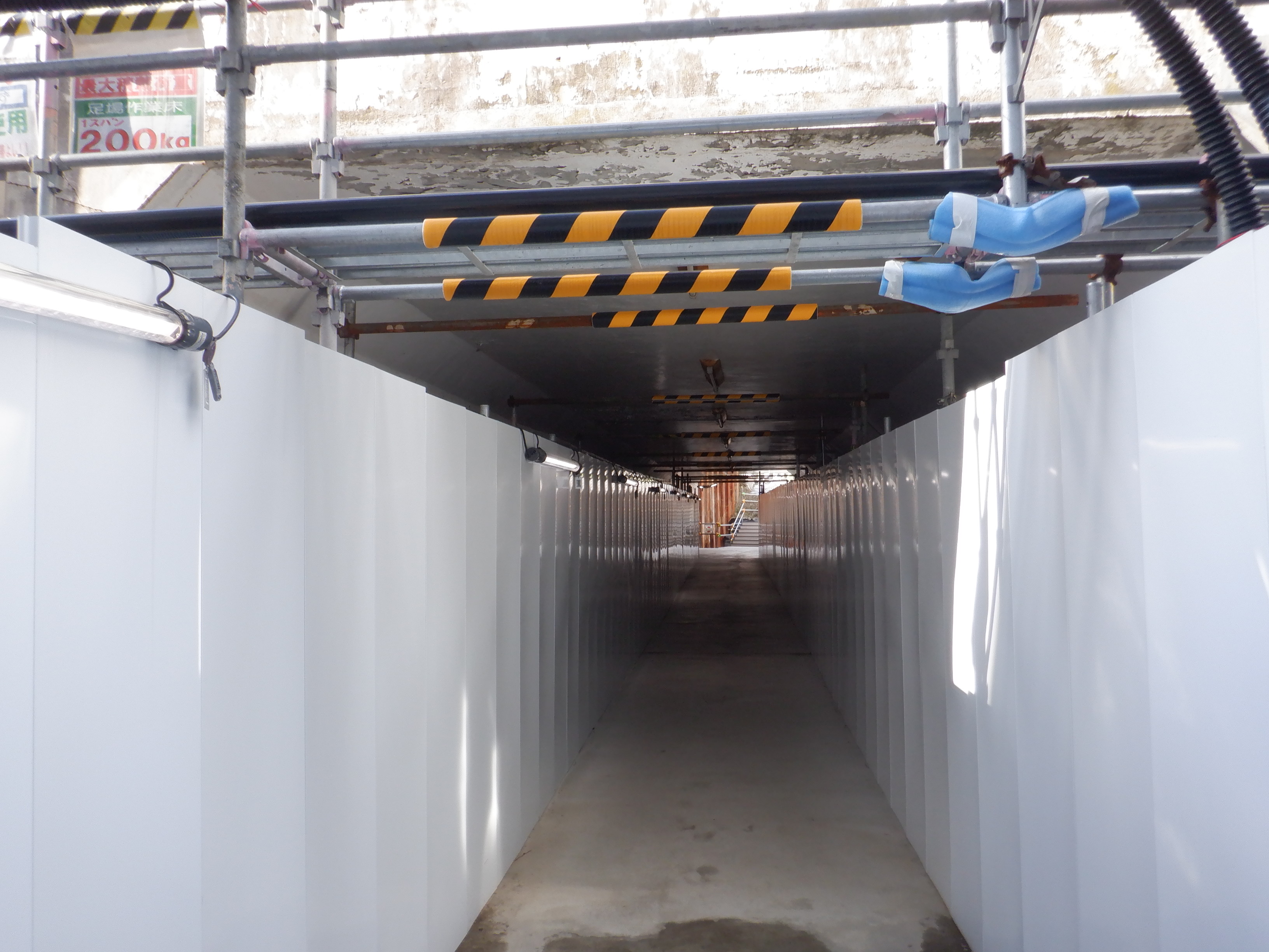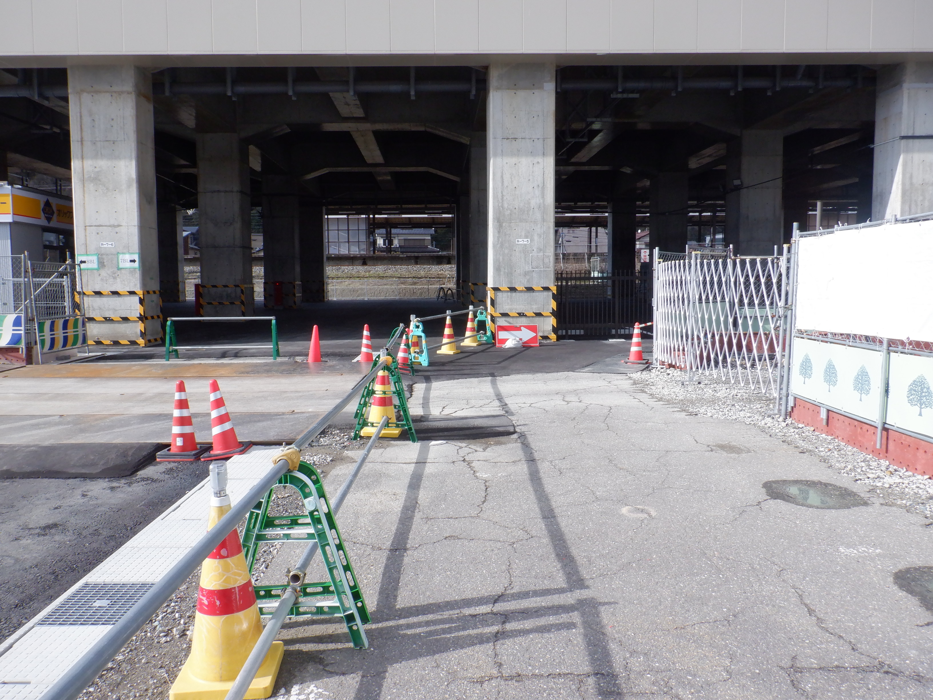 迂回通路から見た高架下部都市施設(コンビニ・待合室等)建設中の様子。