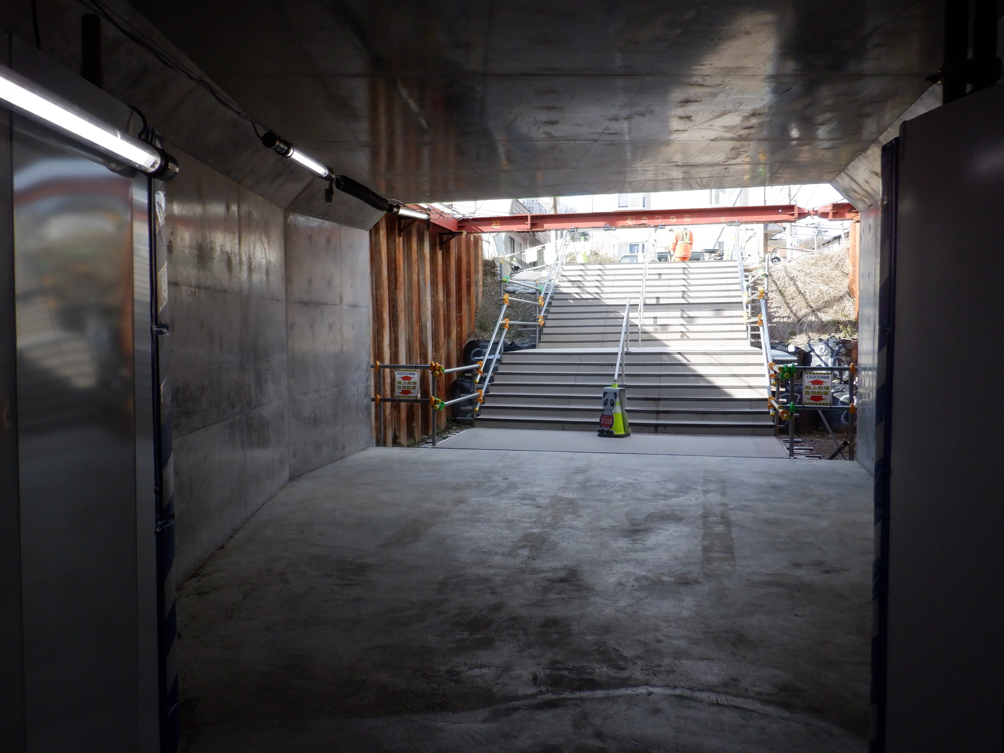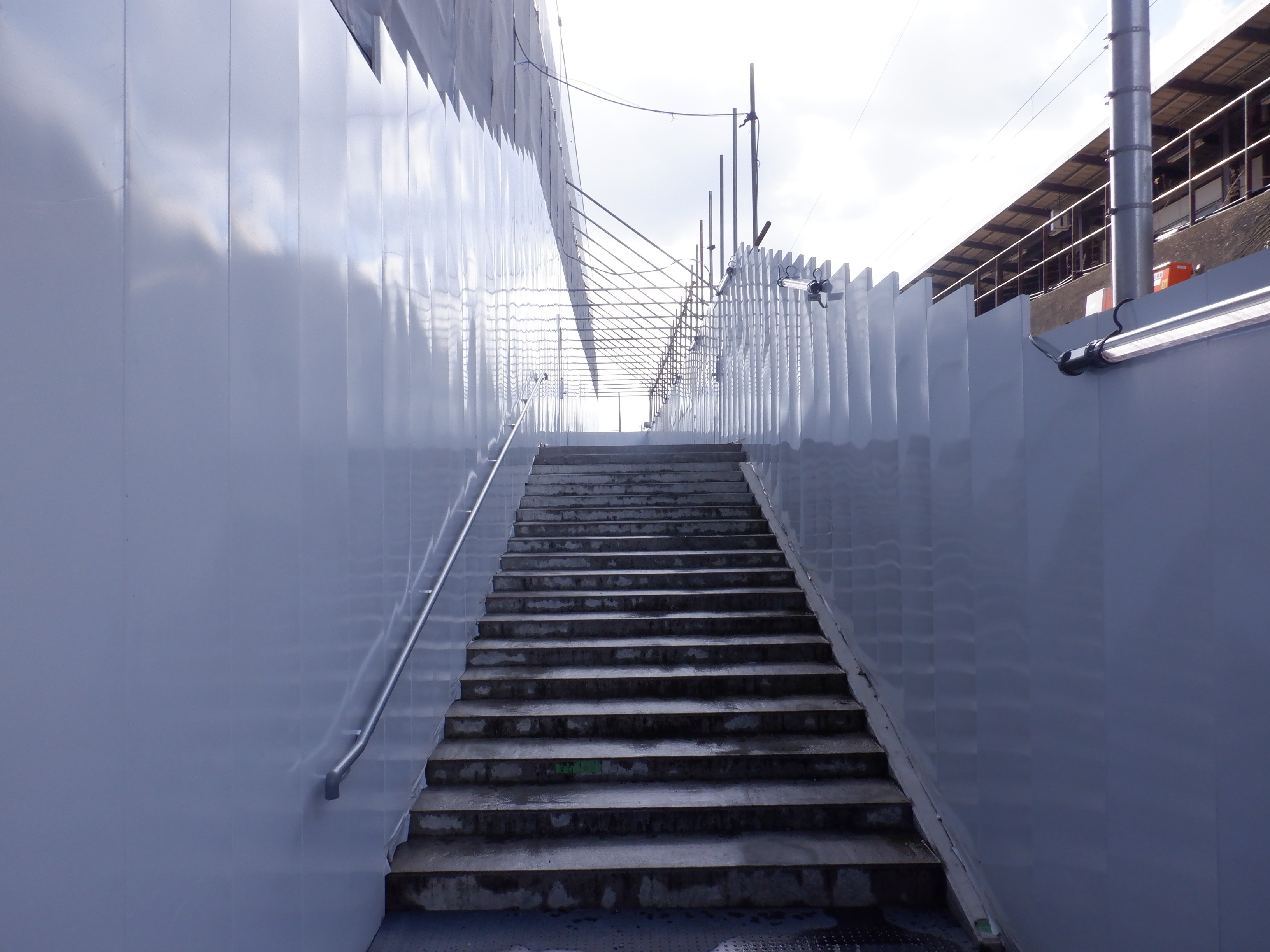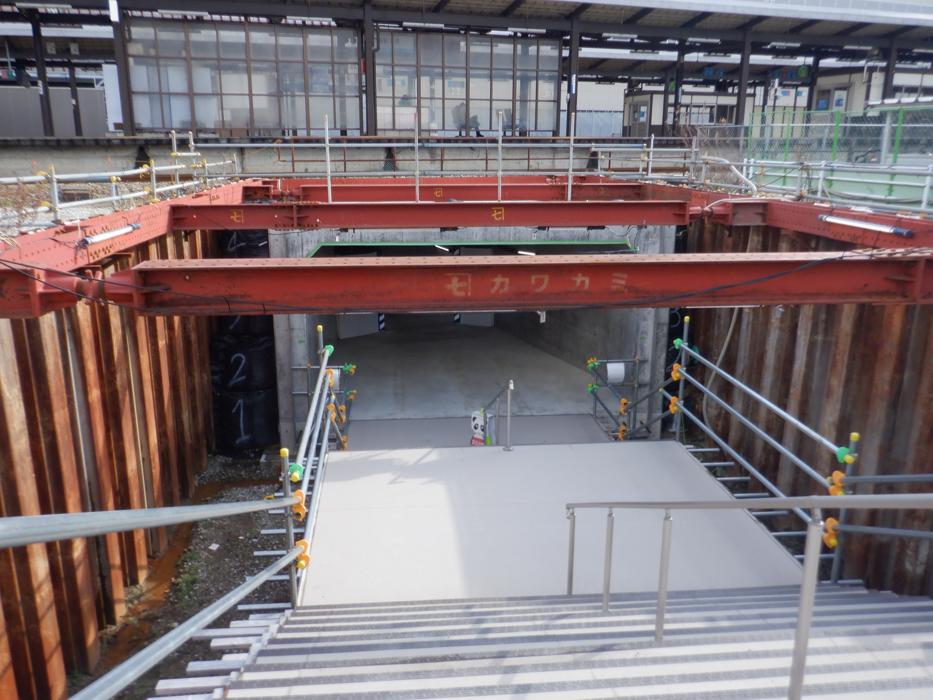 迂回通路から見た高架下部都市施設(コンビニ・待合室等)建設中の様子。