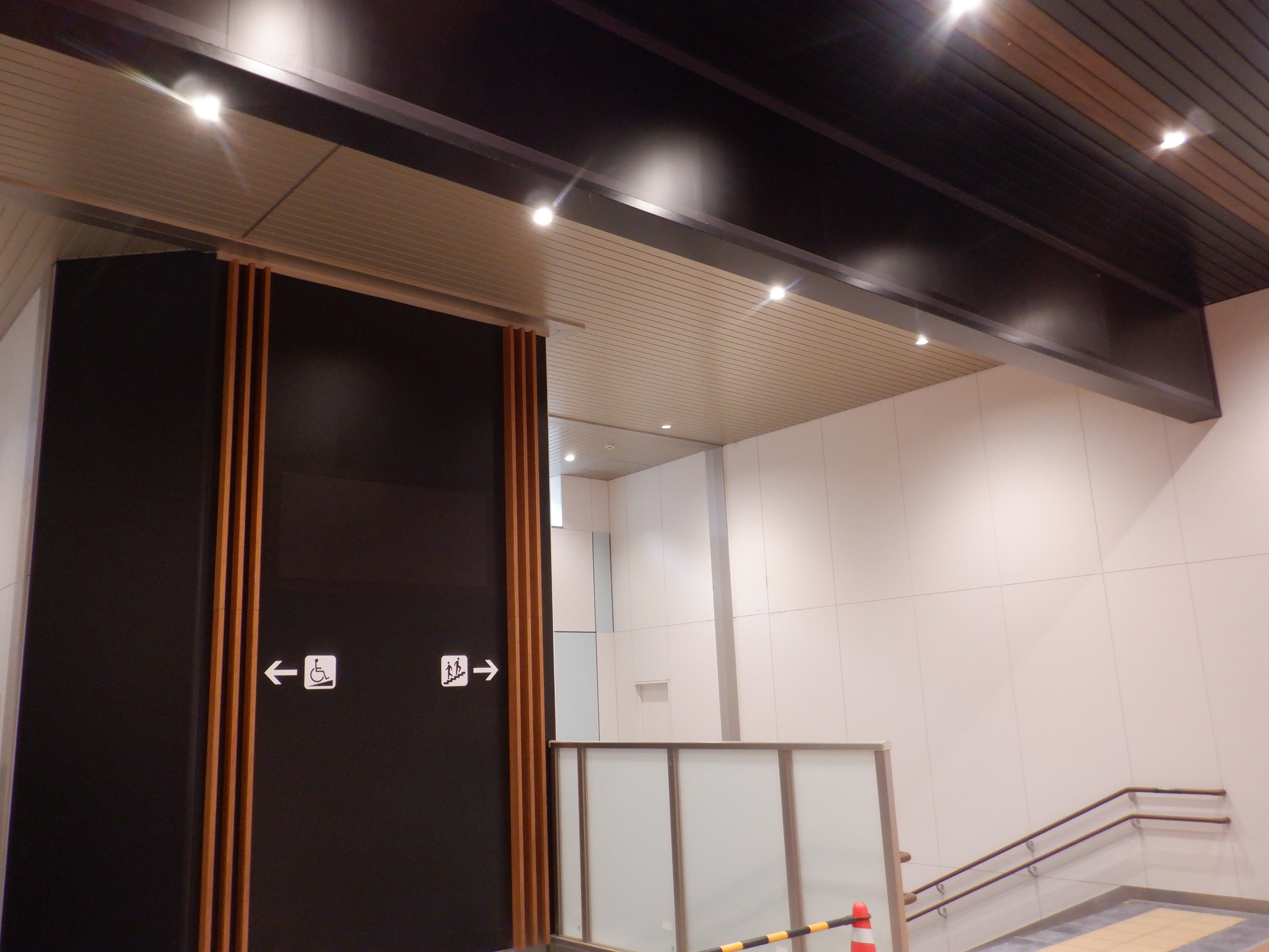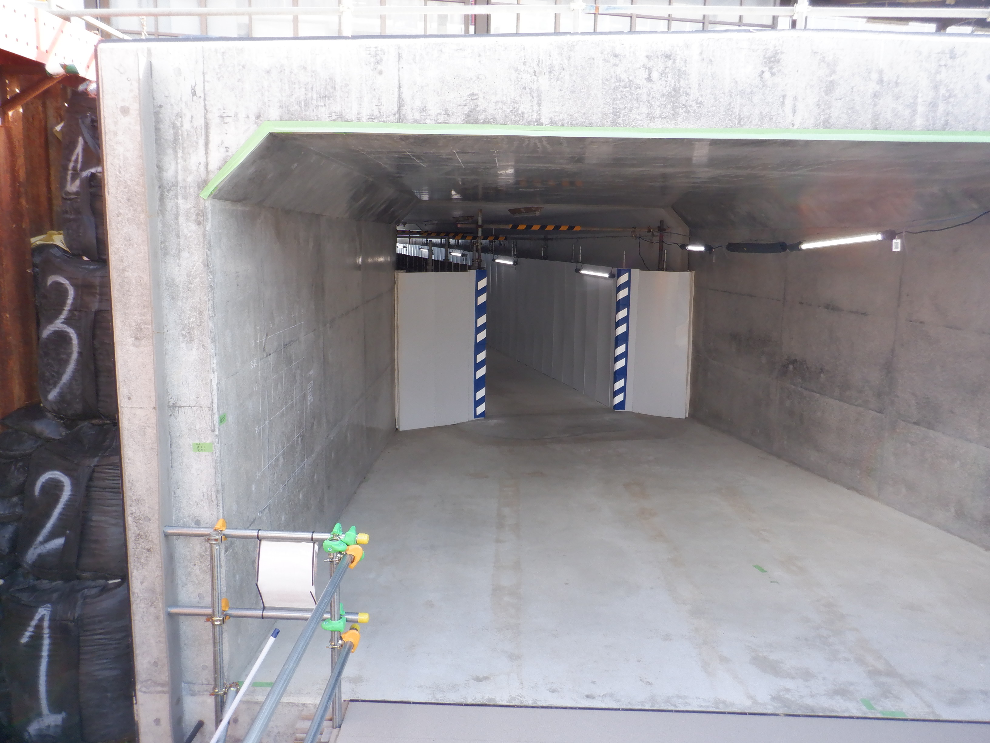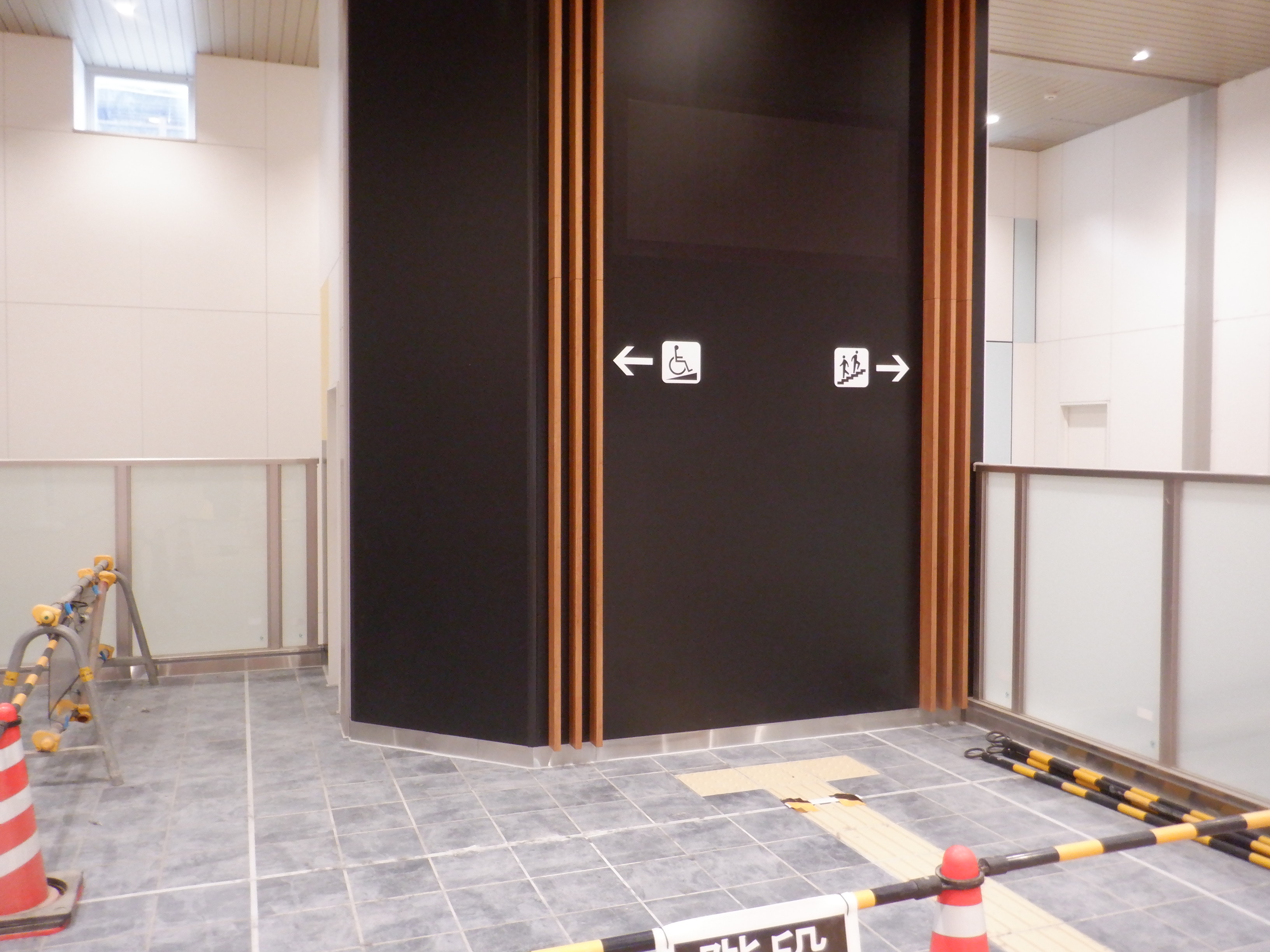 仮設通路の壁が一部撤去され、開業時はここの部分は駅出口付近の通路となるようです。