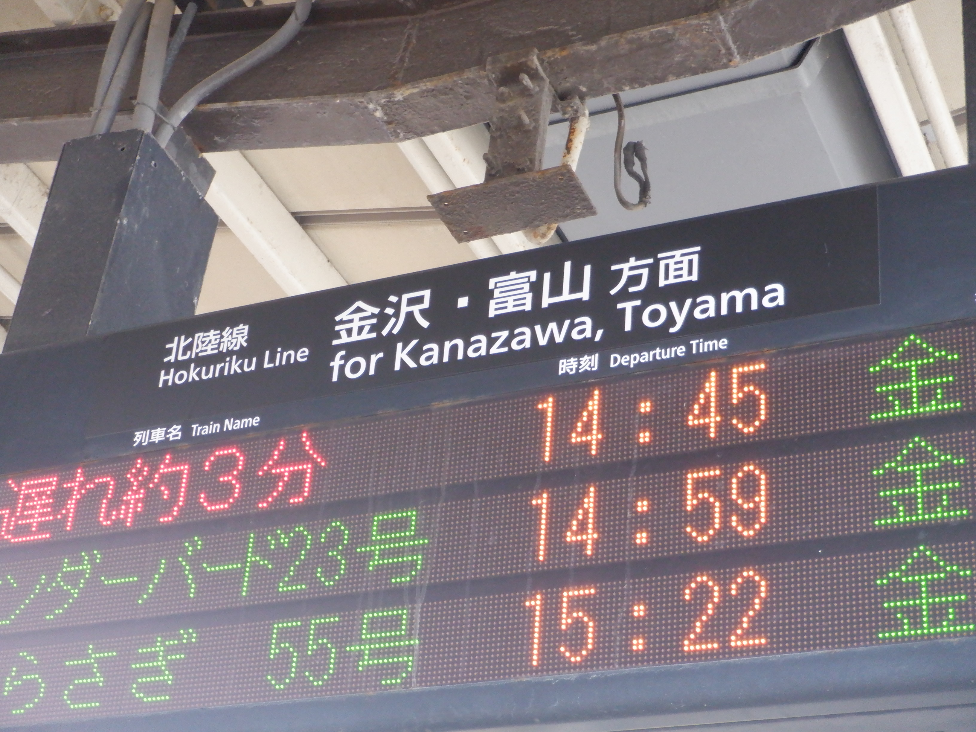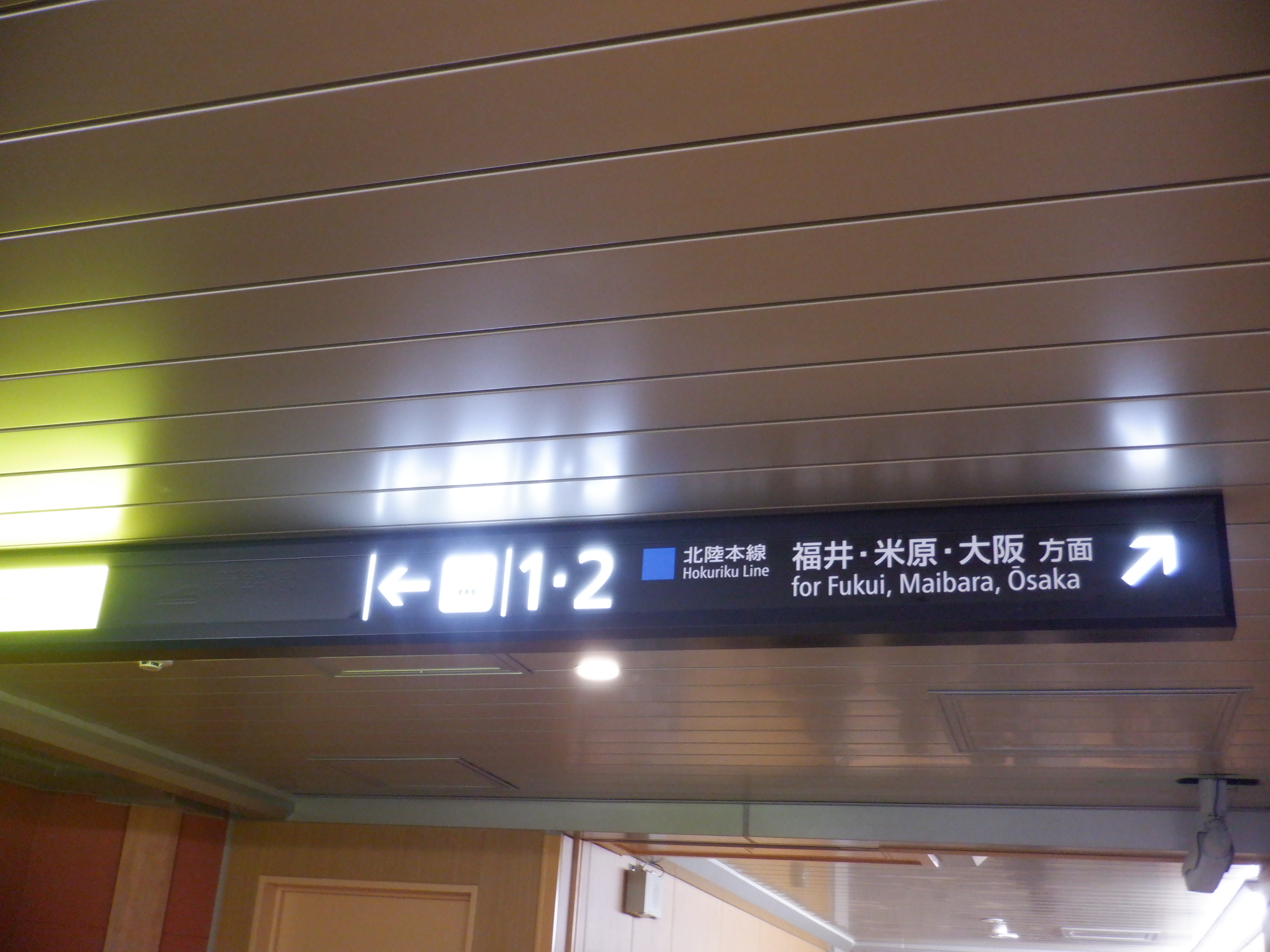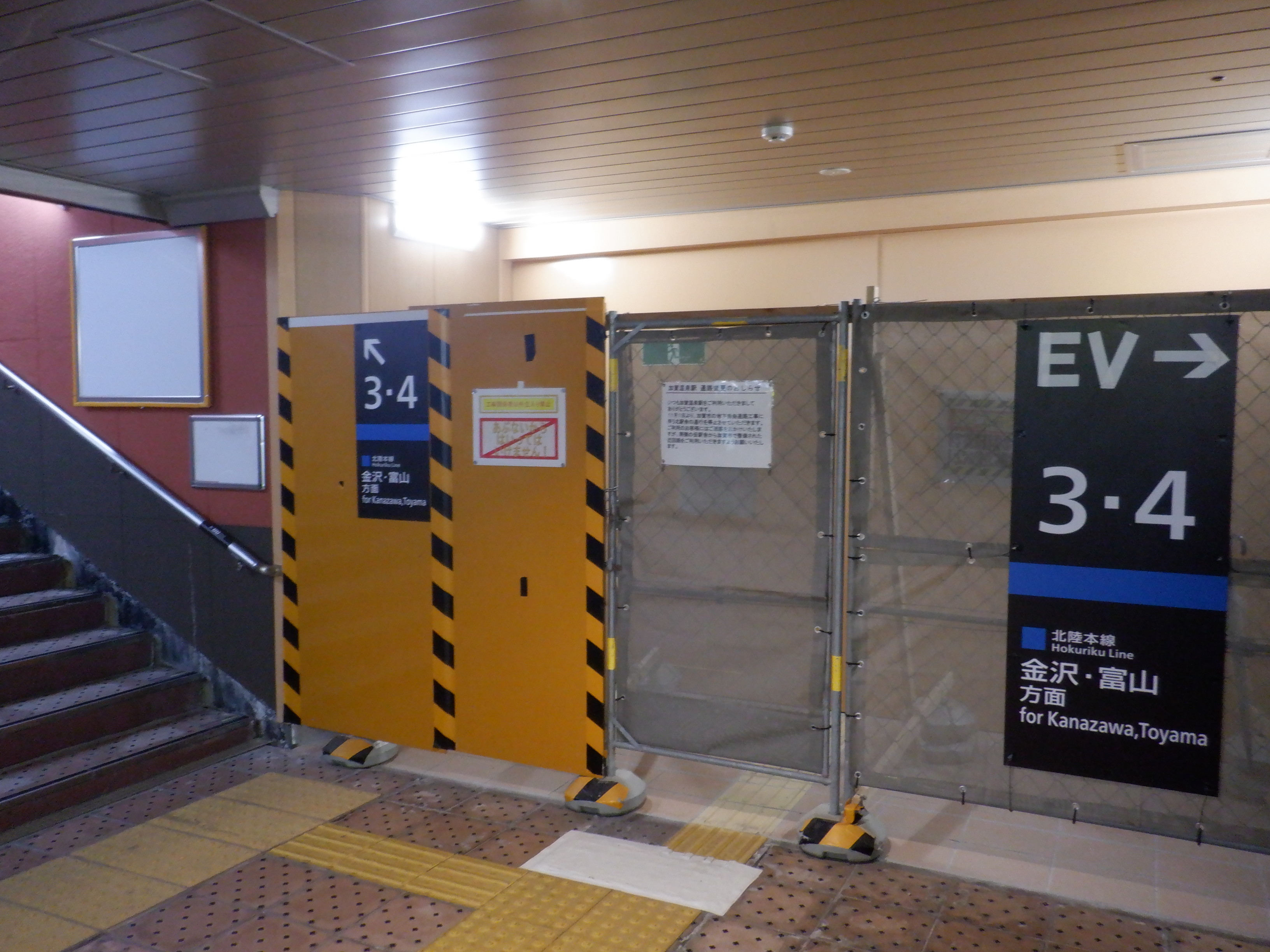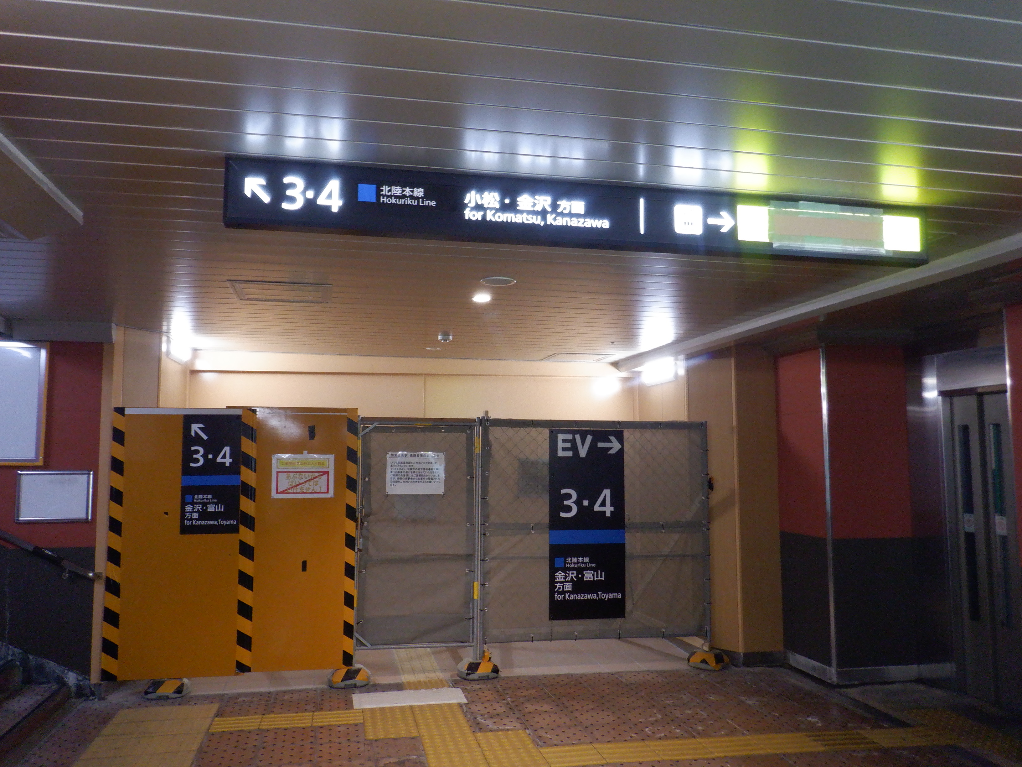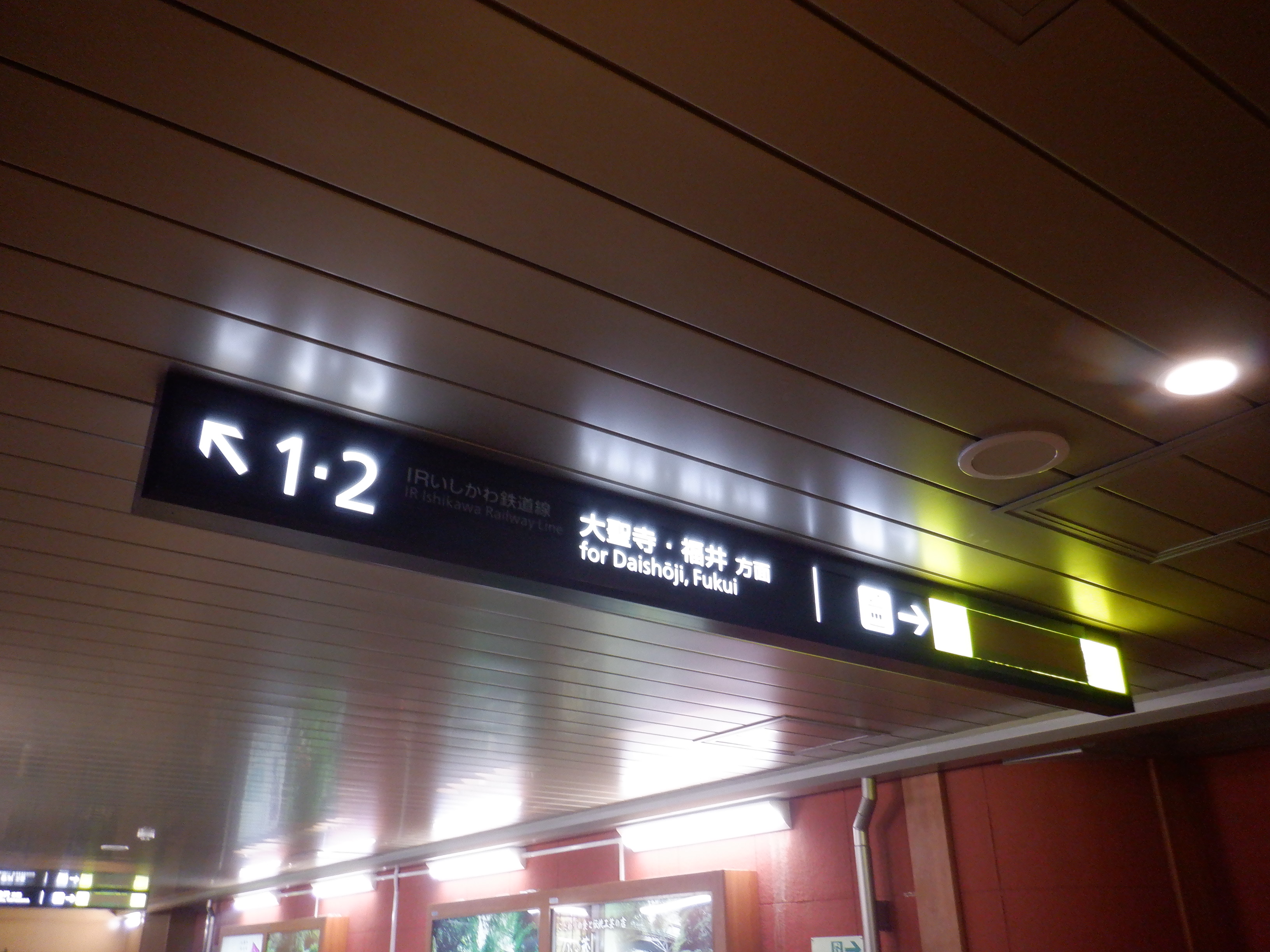 1・2番のりば階段とエスカレーターの間にある建植式の駅名標はIRいしかわ鉄道の駅名標となりましたが、IRのロゴは隠されています。