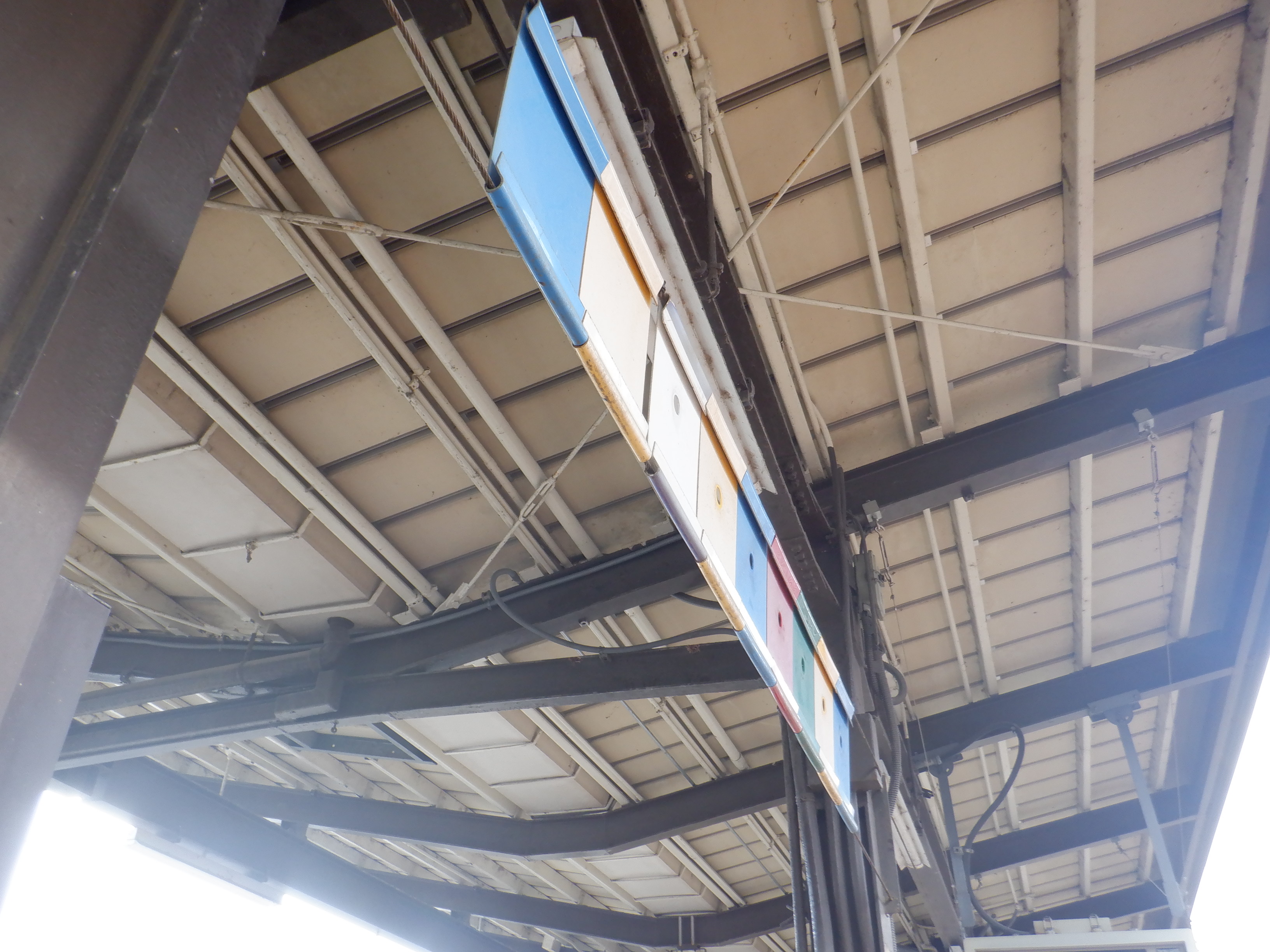 階段から上がってきたところの方面案内。こちらも新しいものの上にシールで古いものが再現されています。