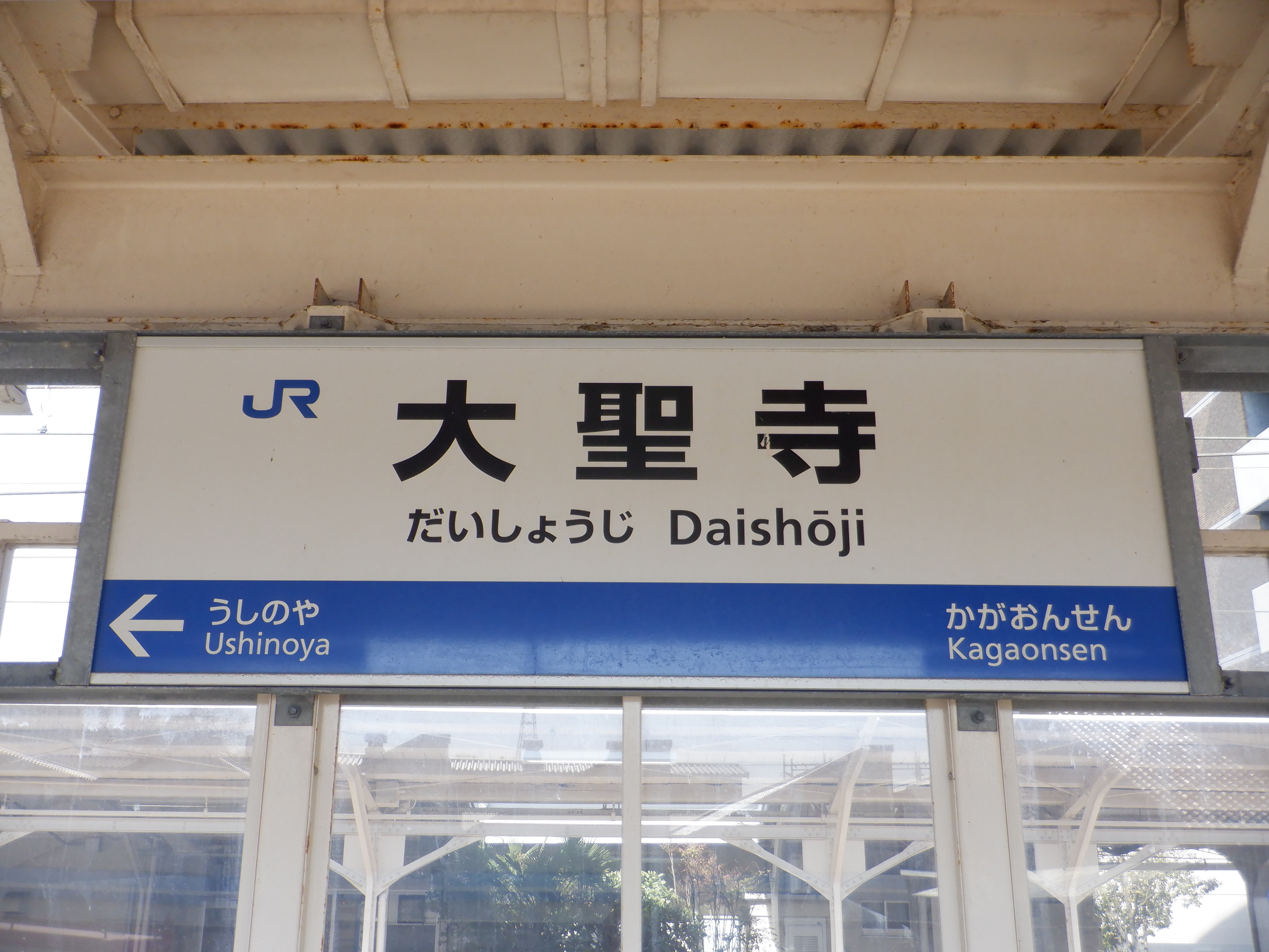 加賀温泉駅側の柱に貼られた縦型駅名標。