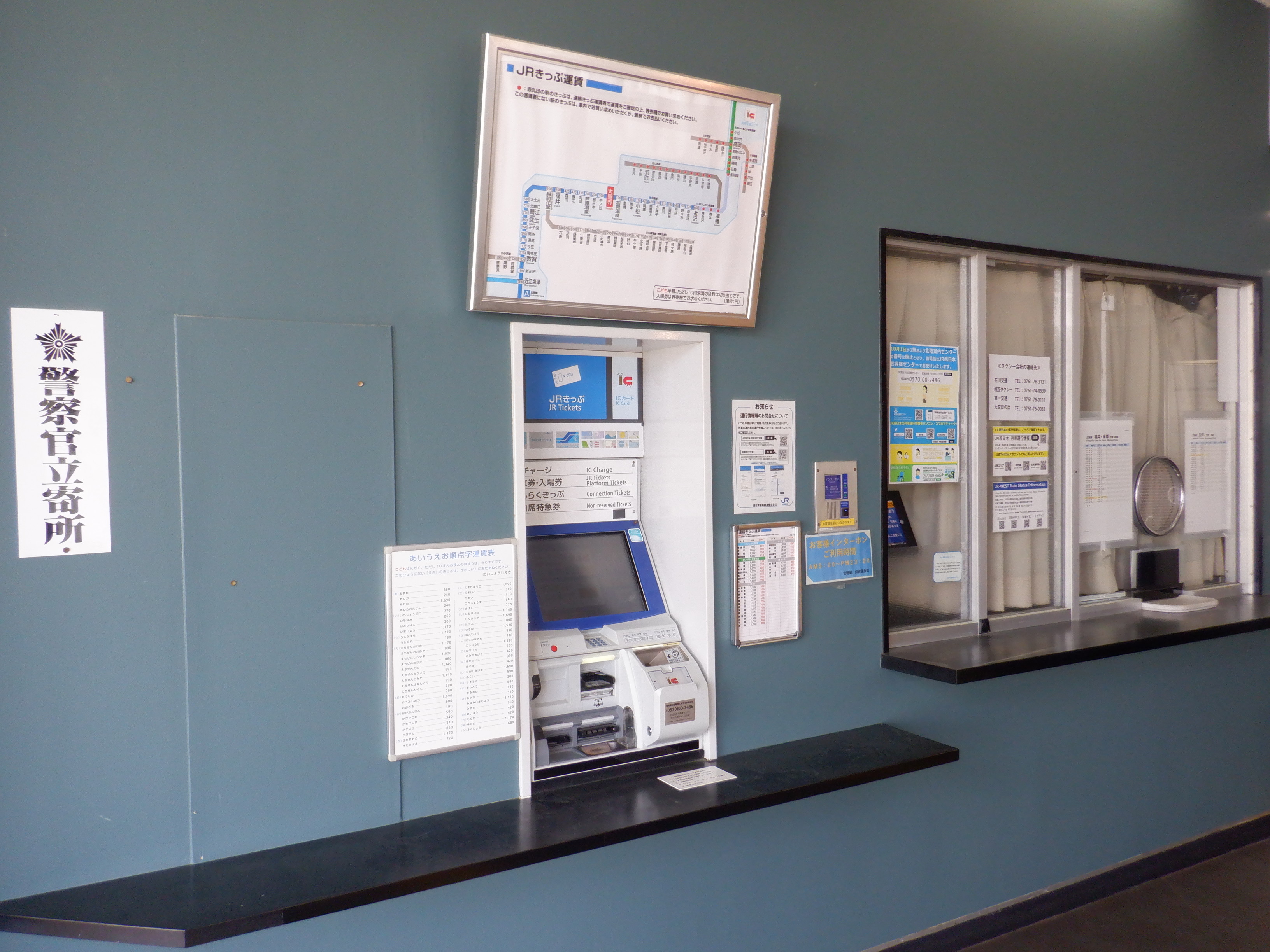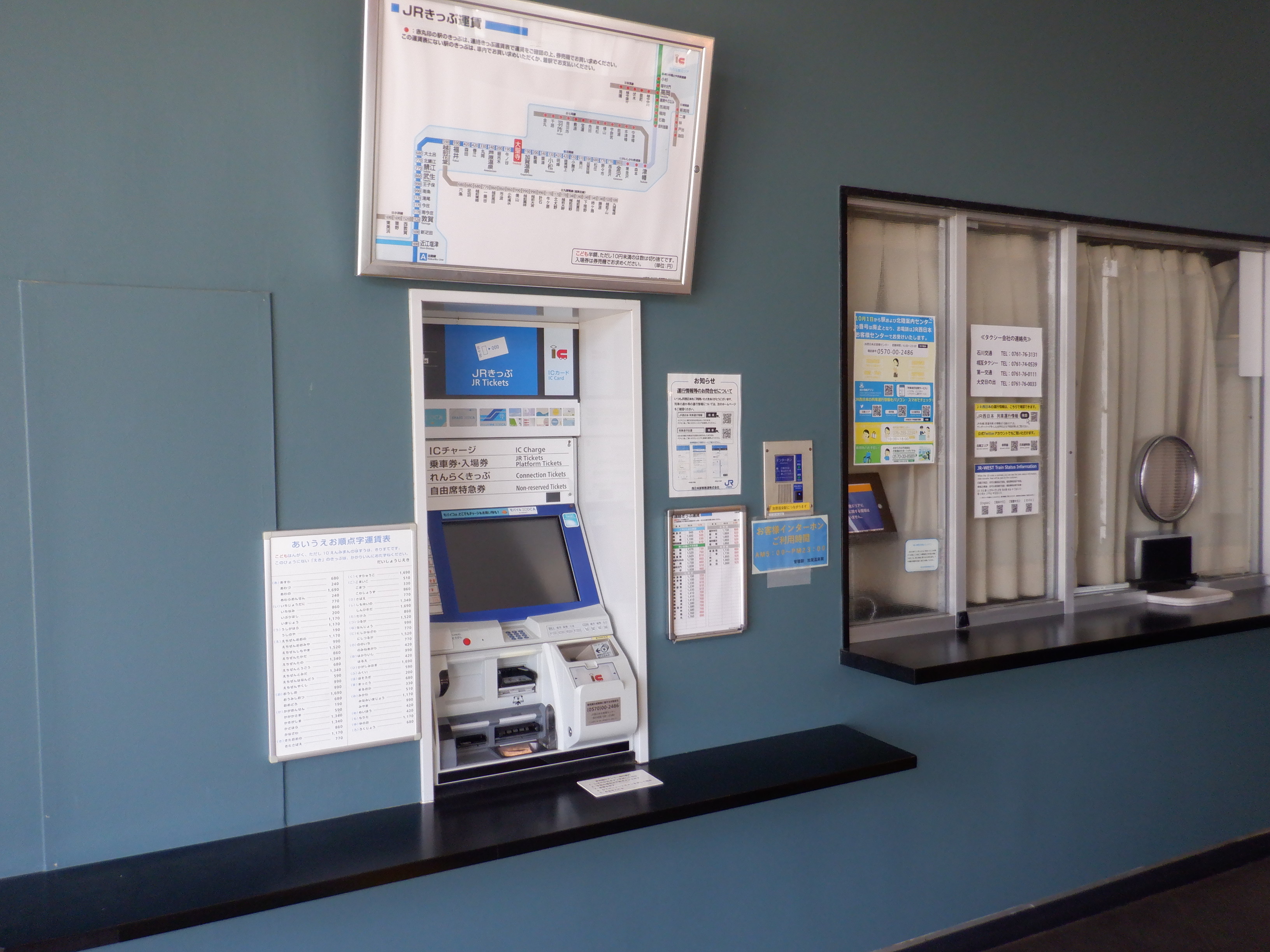 窓口跡と券売機。また、みどりの窓口看板跡。