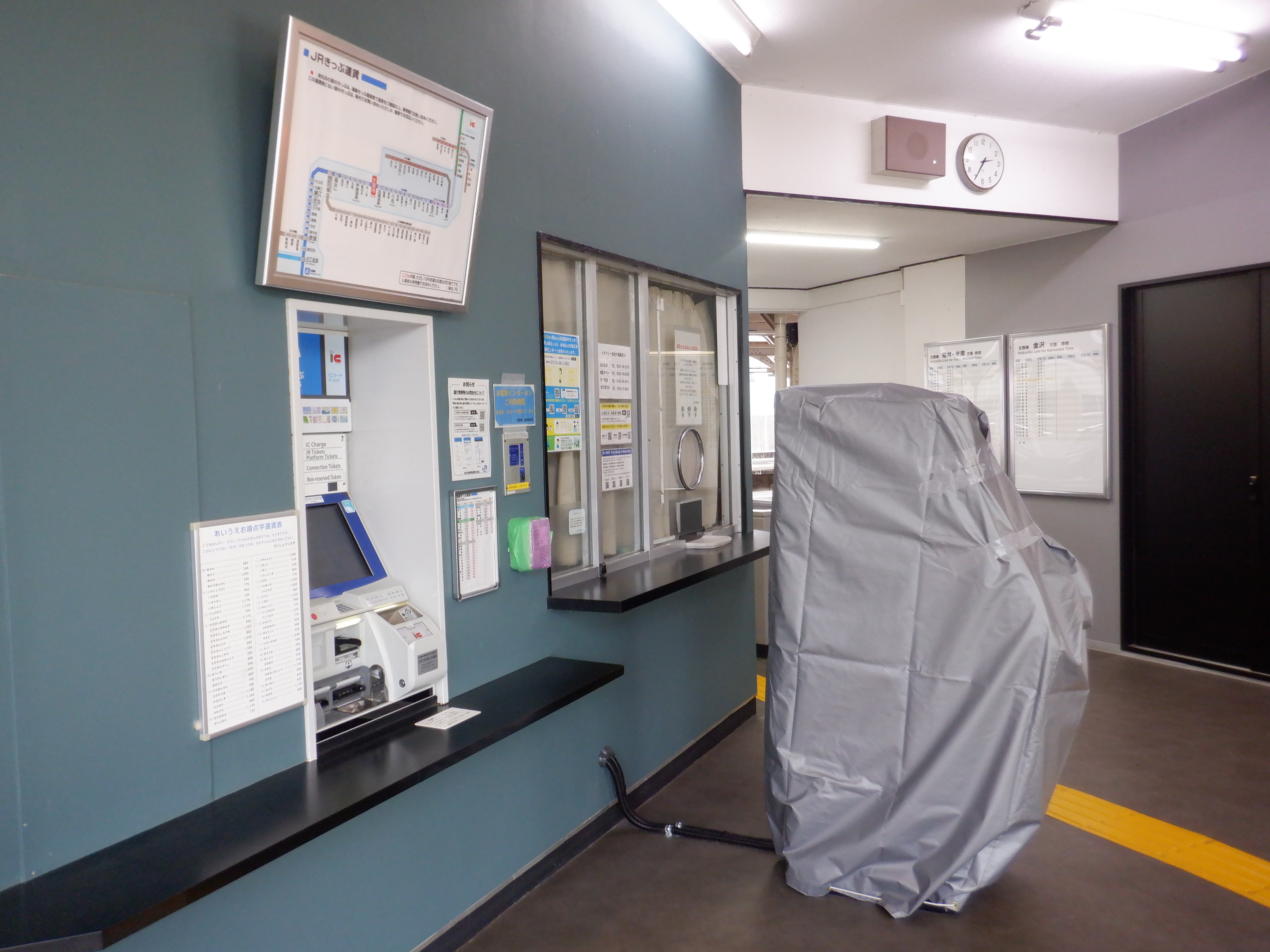 従来の券売機の前に新しい券売機がカバーを被った状態で置かれていました。