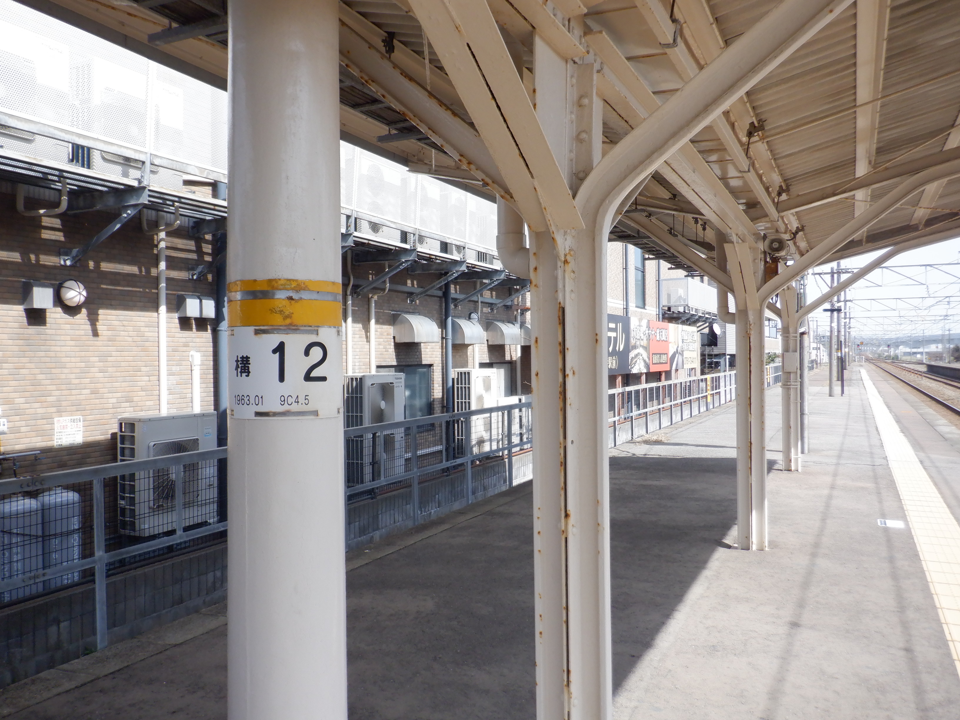 跨線橋前の上屋支柱に少し古レールの刻印が見えます。