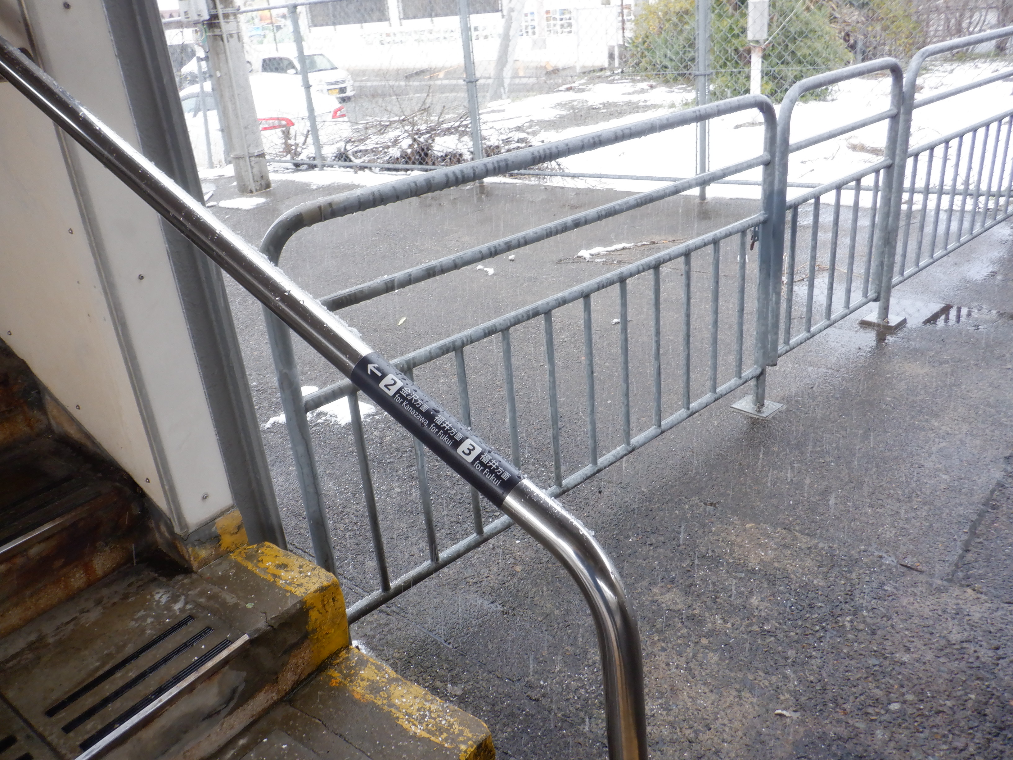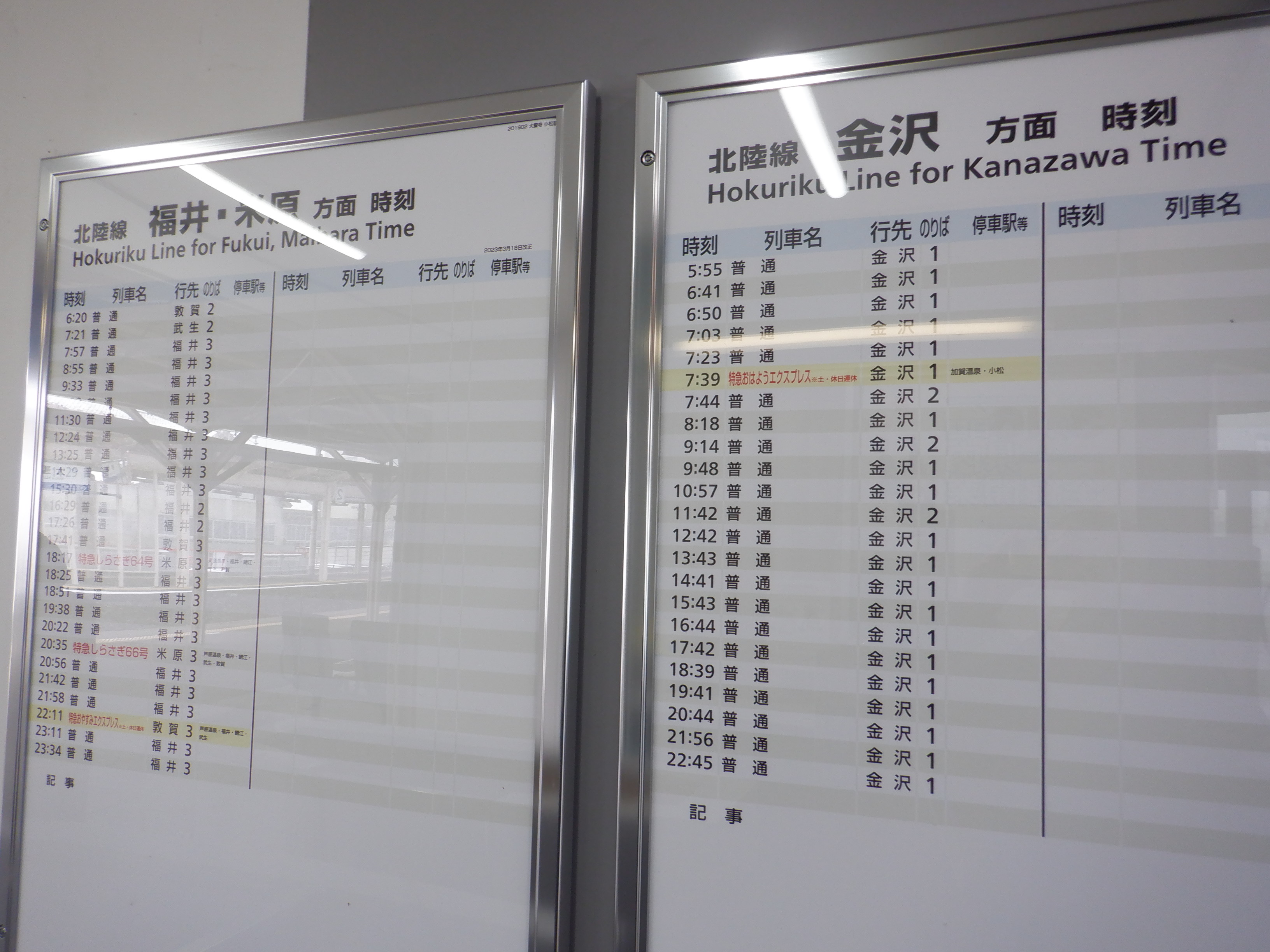 駅名標が新しくなってIR/ハピラインのロゴが隠されたもの、JRものにIR/ハピラインのロゴが貼られ隠されたものになりました。また、階段や改札口のところの案内も新しいものの上に仮のものが貼られています。駅舎入口の時計跡にIRのロゴが貼られるようです。