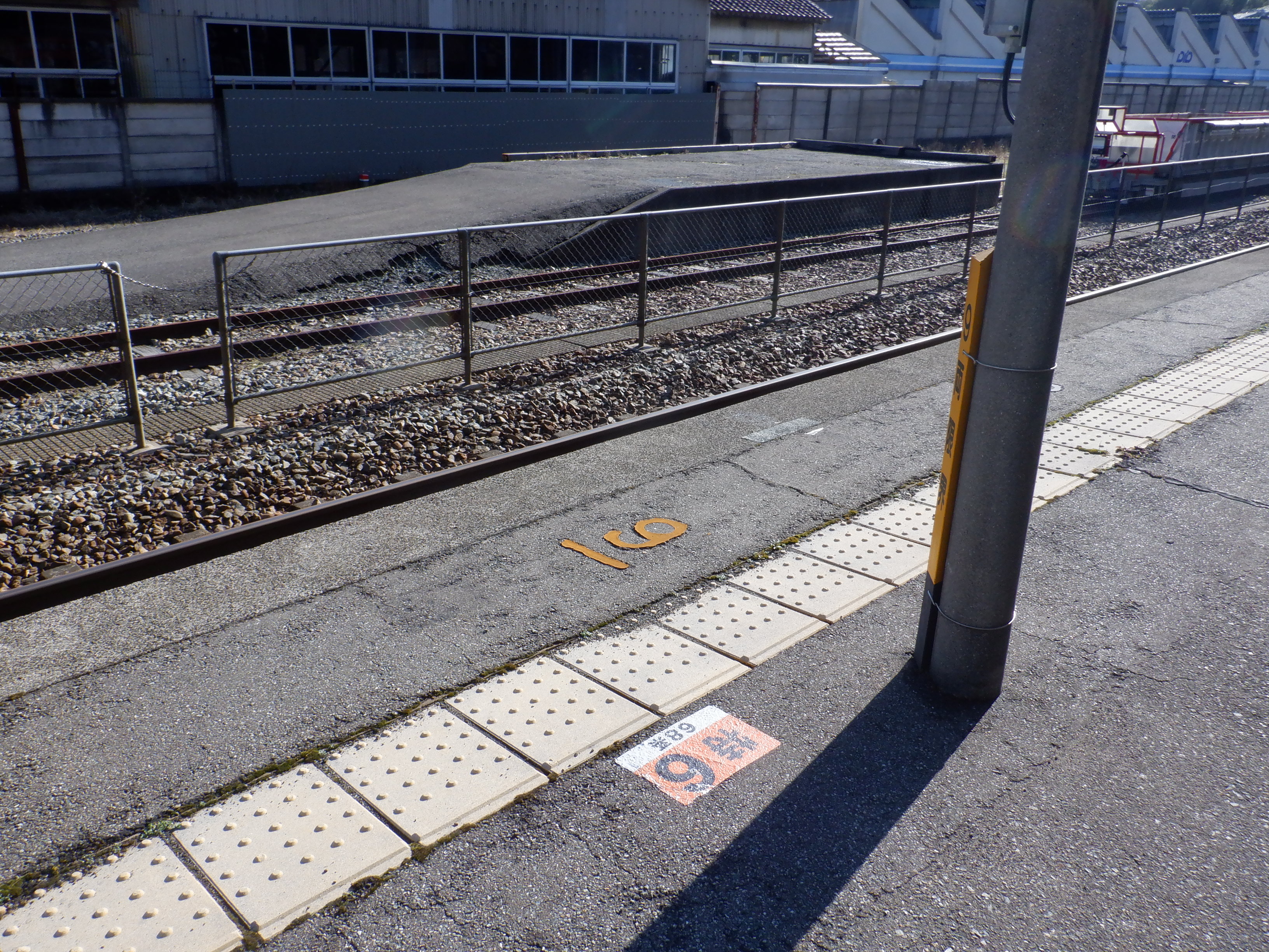 2・3番のりば上屋付近の駅名標。こちらはIRいしかわ鉄道仕様のものになって、ロゴが隠されています。