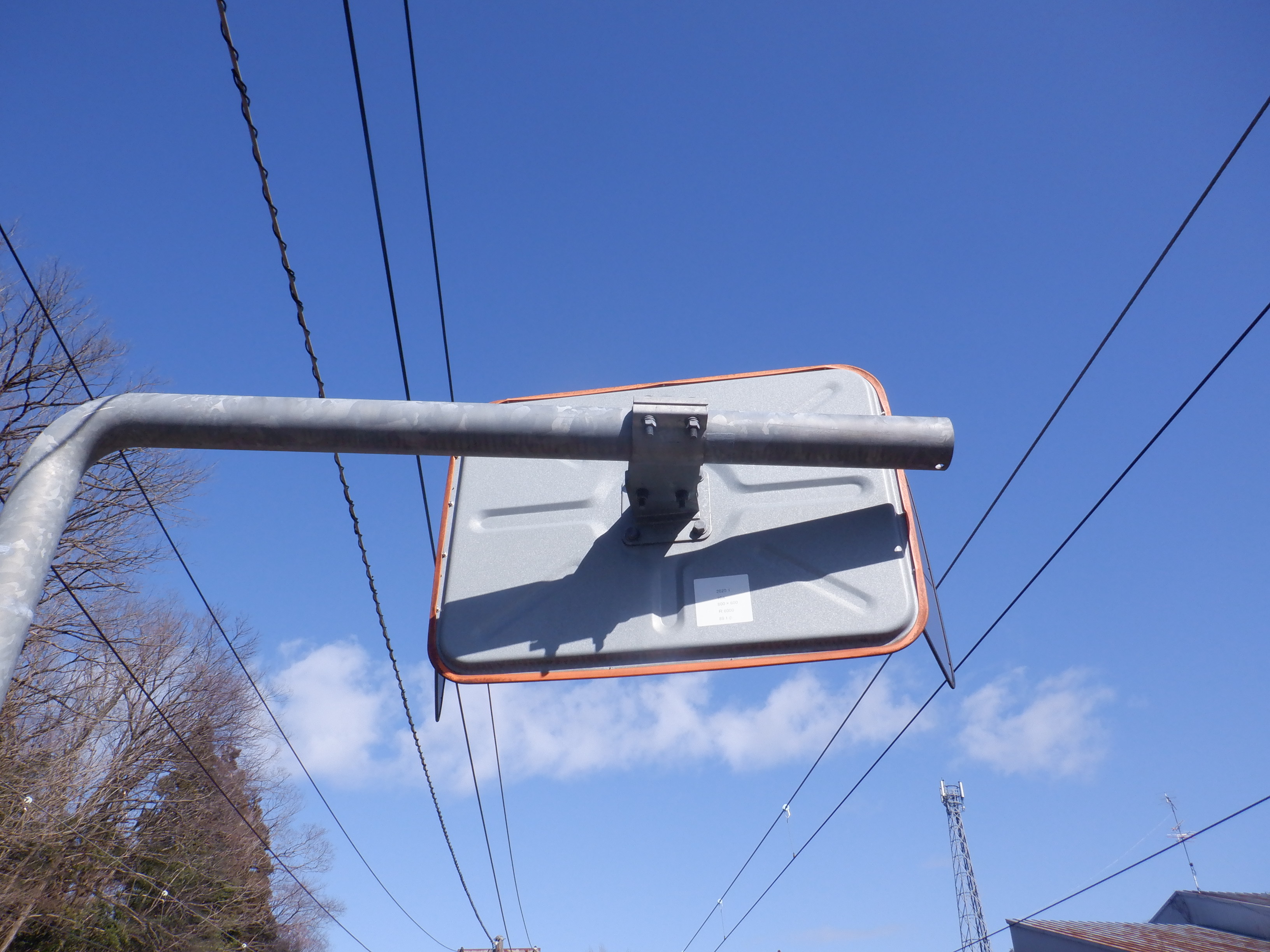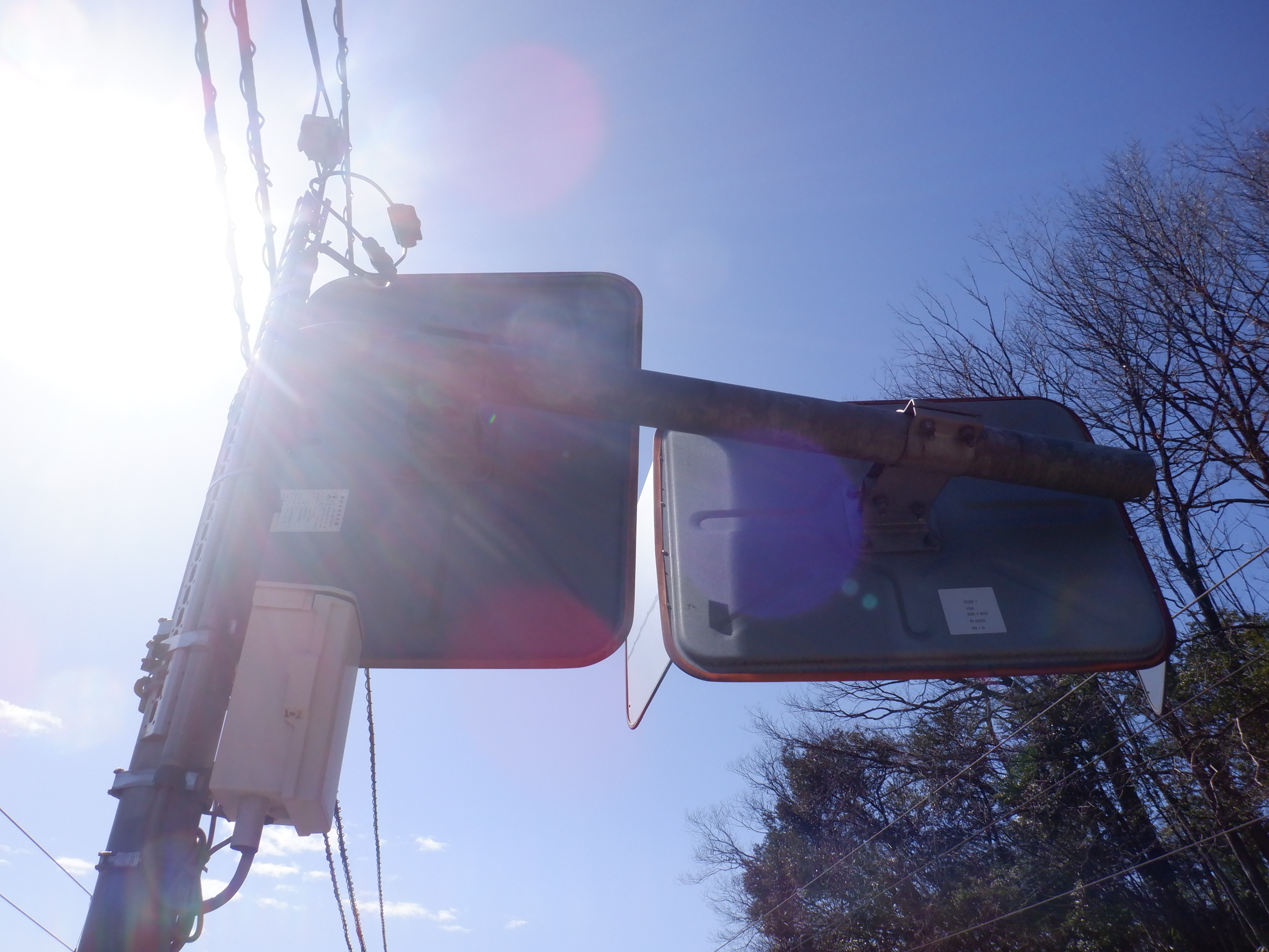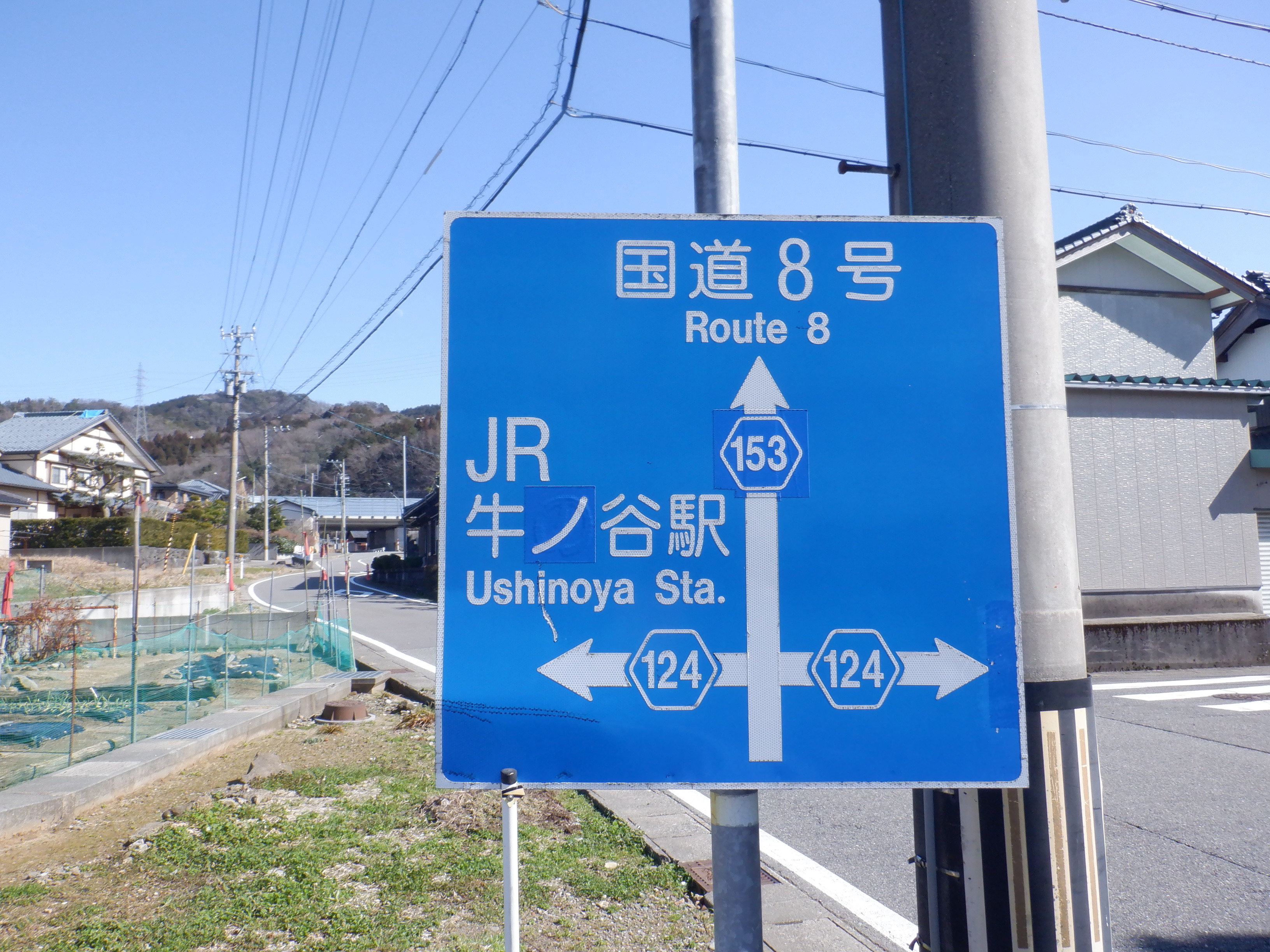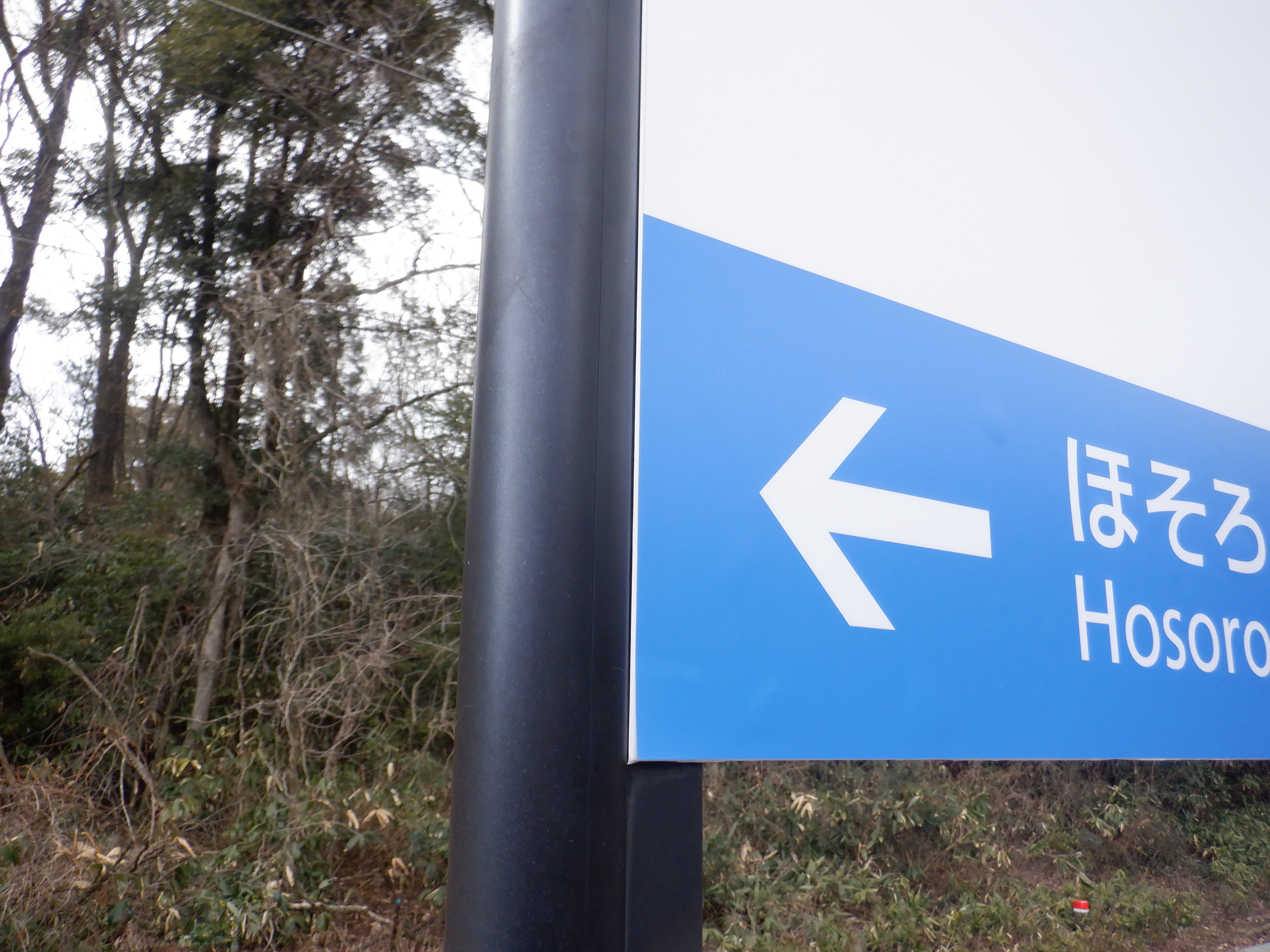 集落入口近く、駅へ進む道にある青看板。「の」が「ノ」に訂正された形跡があります。