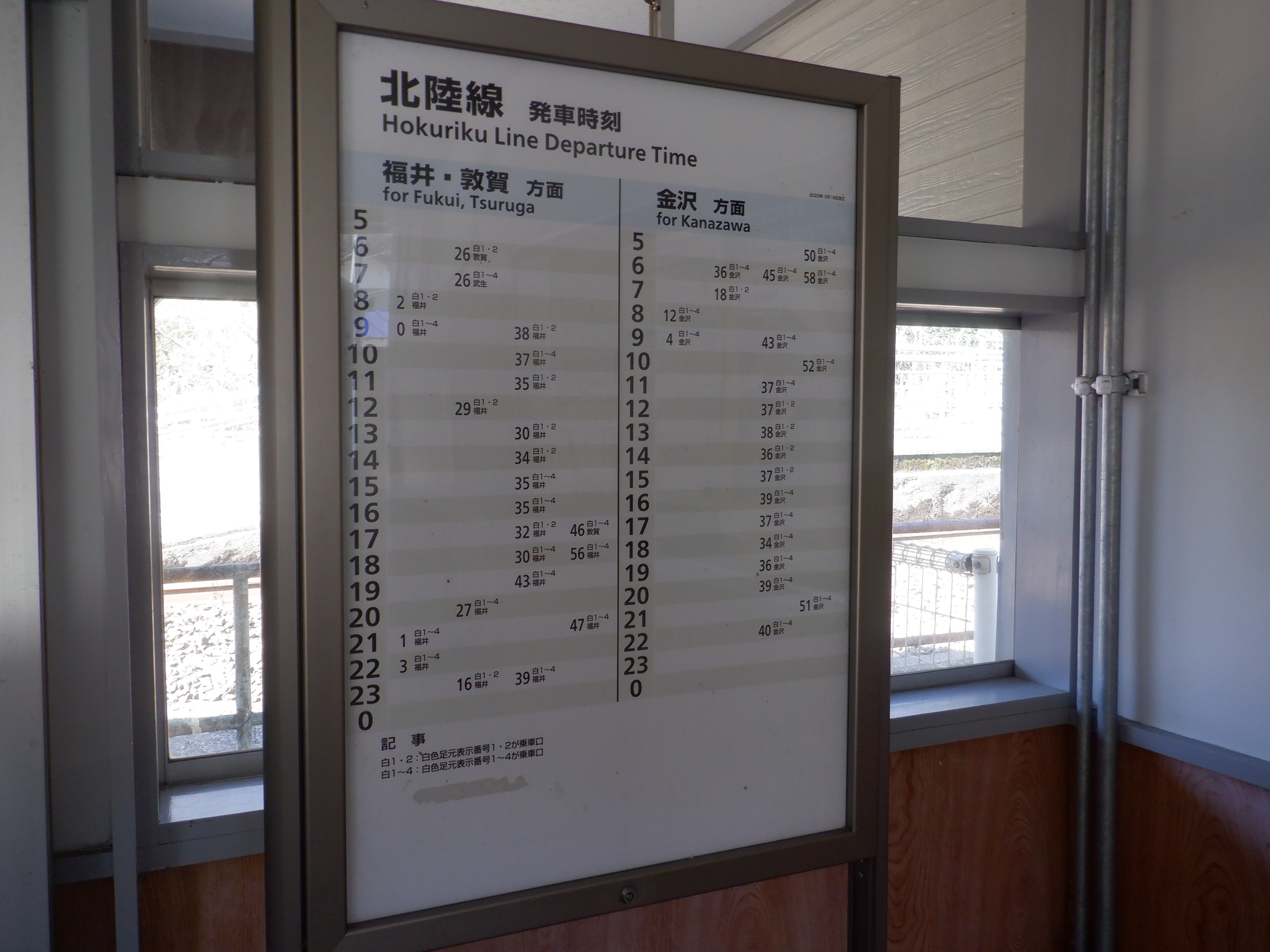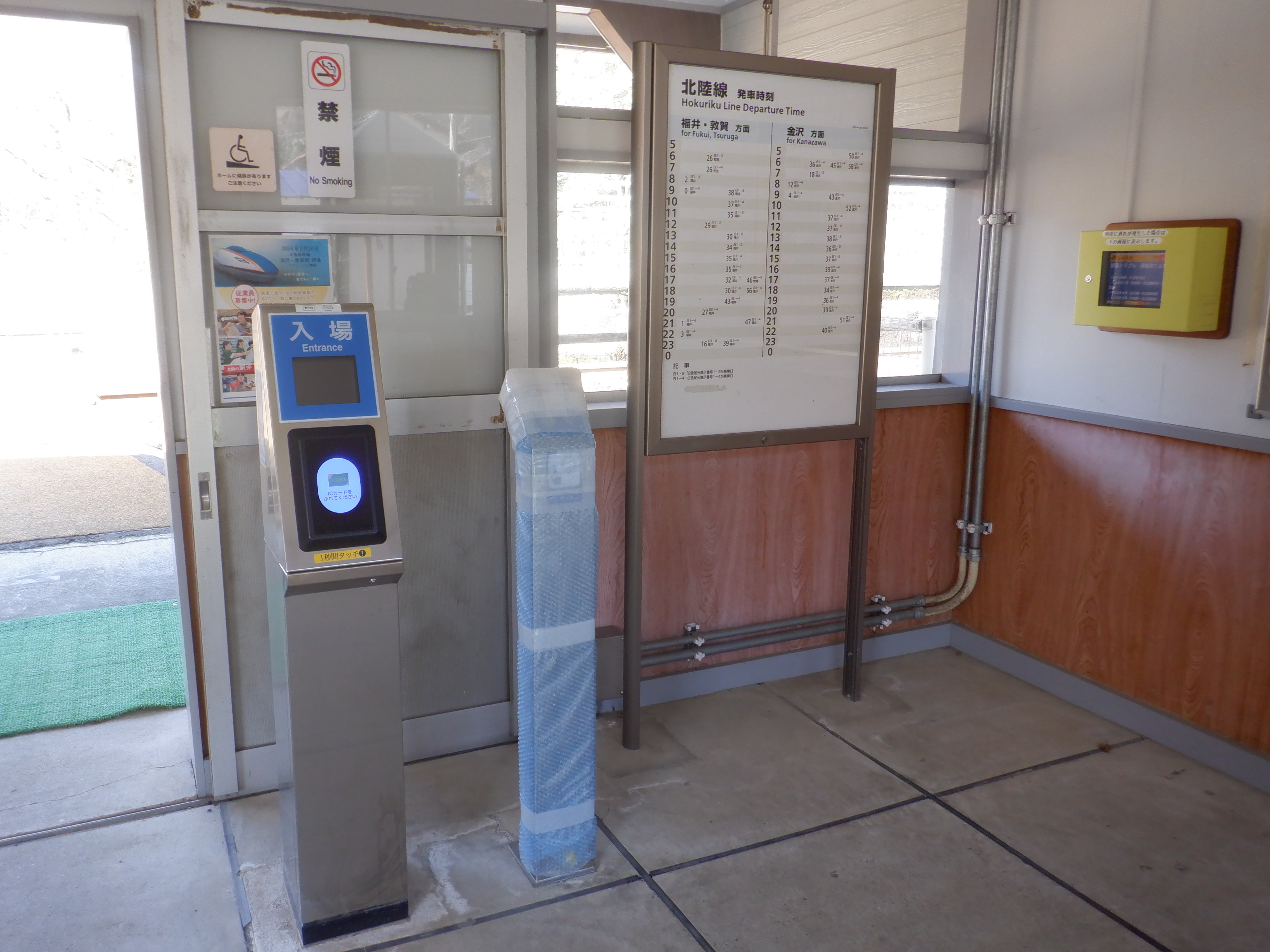 駅舎の様子。新しい第一種駅名標に差し替えられ、ハピラインふくいのロゴが隠された状態でした。