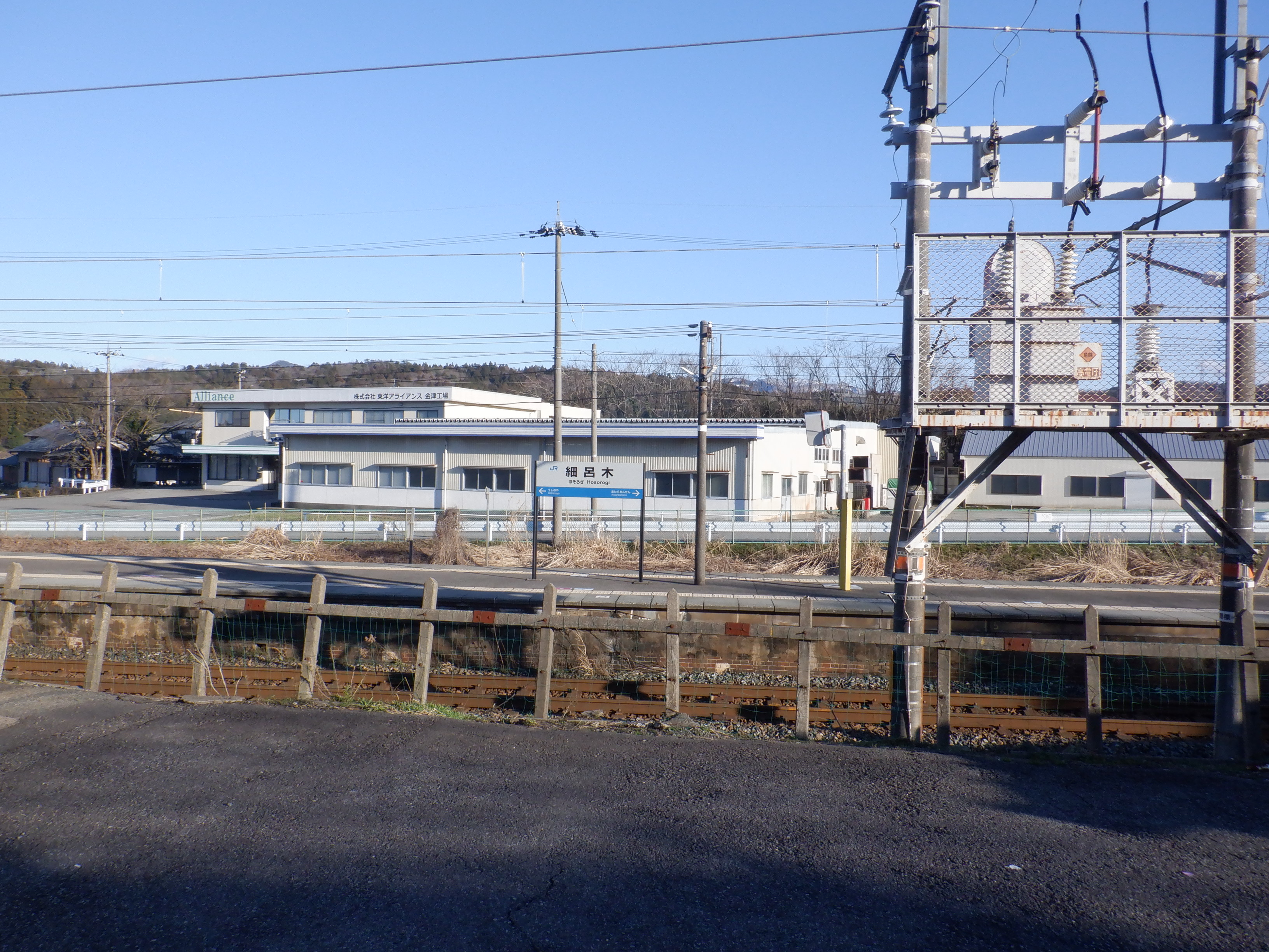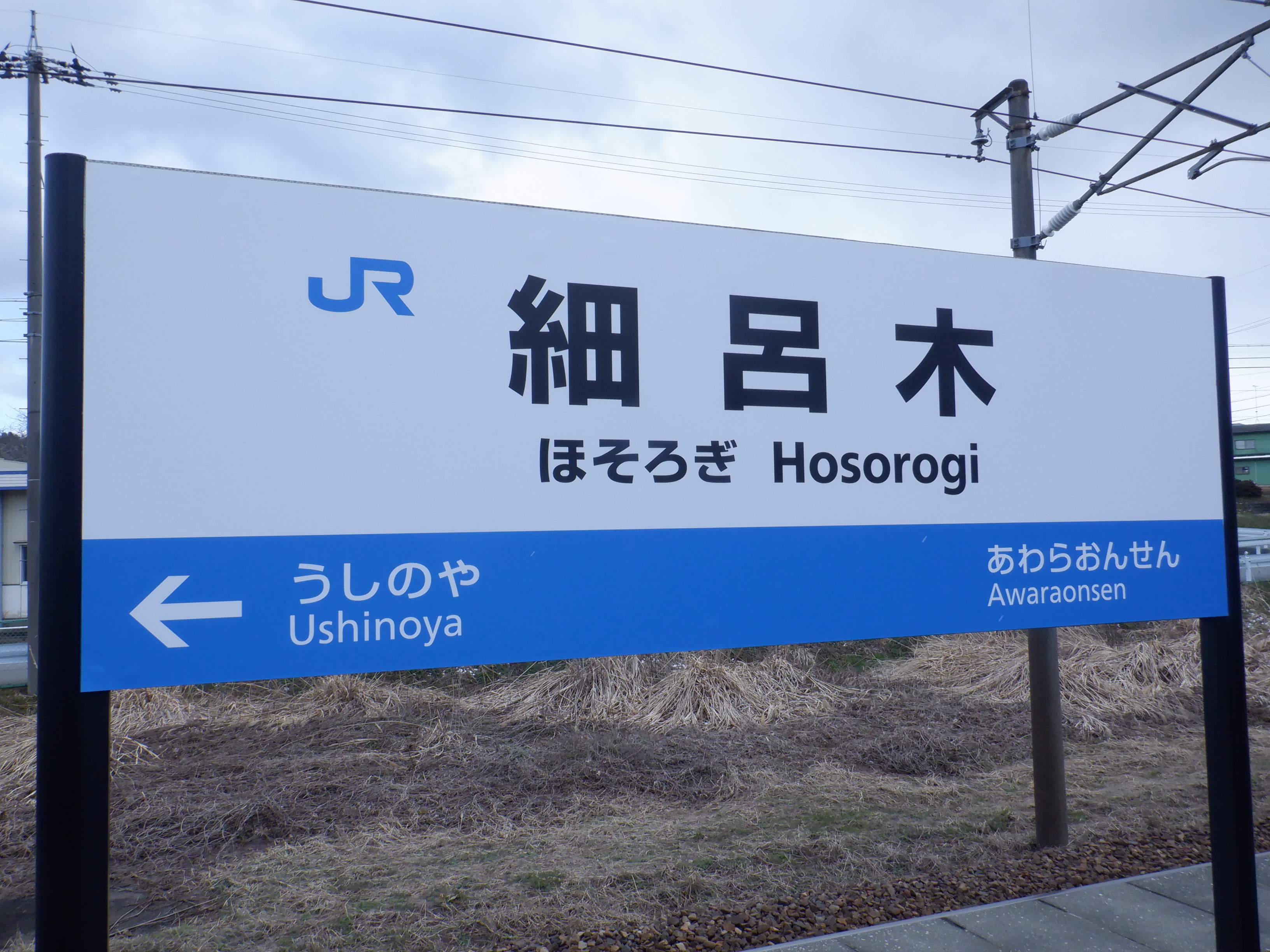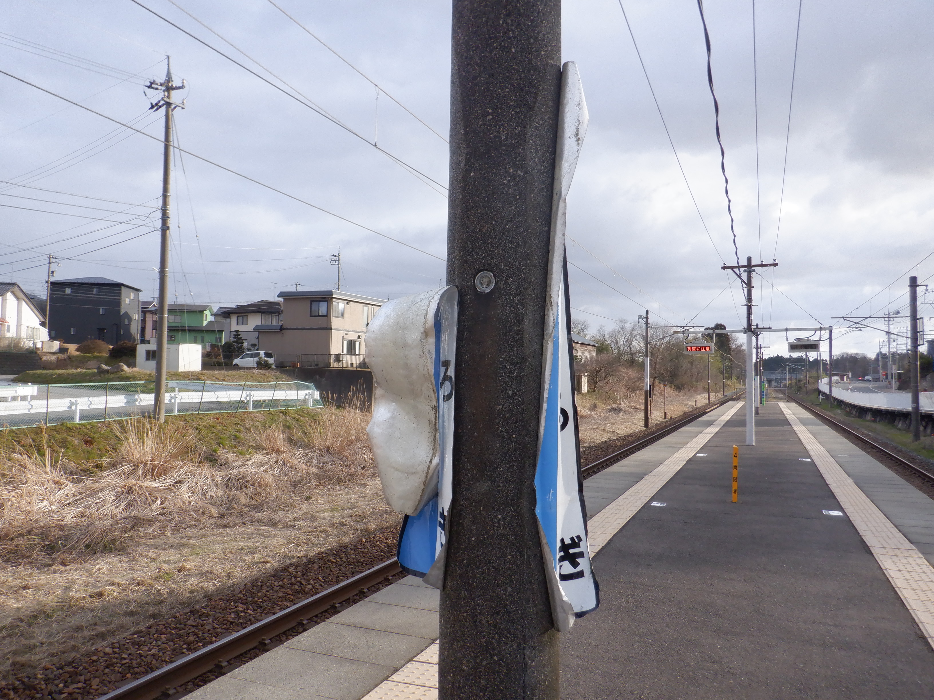 架線の注意書きがある板をホームから。