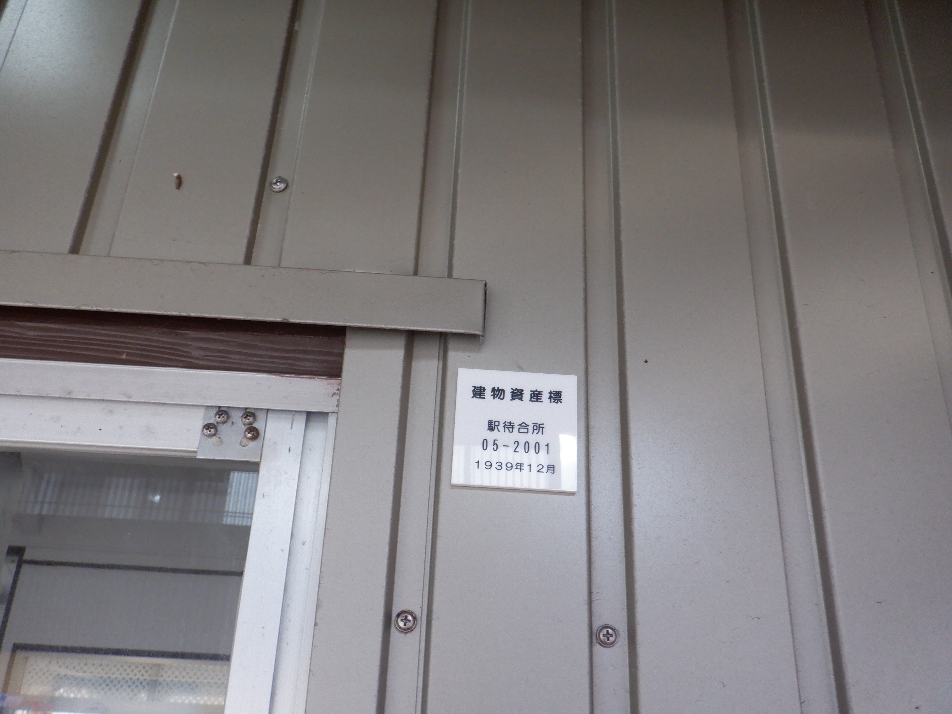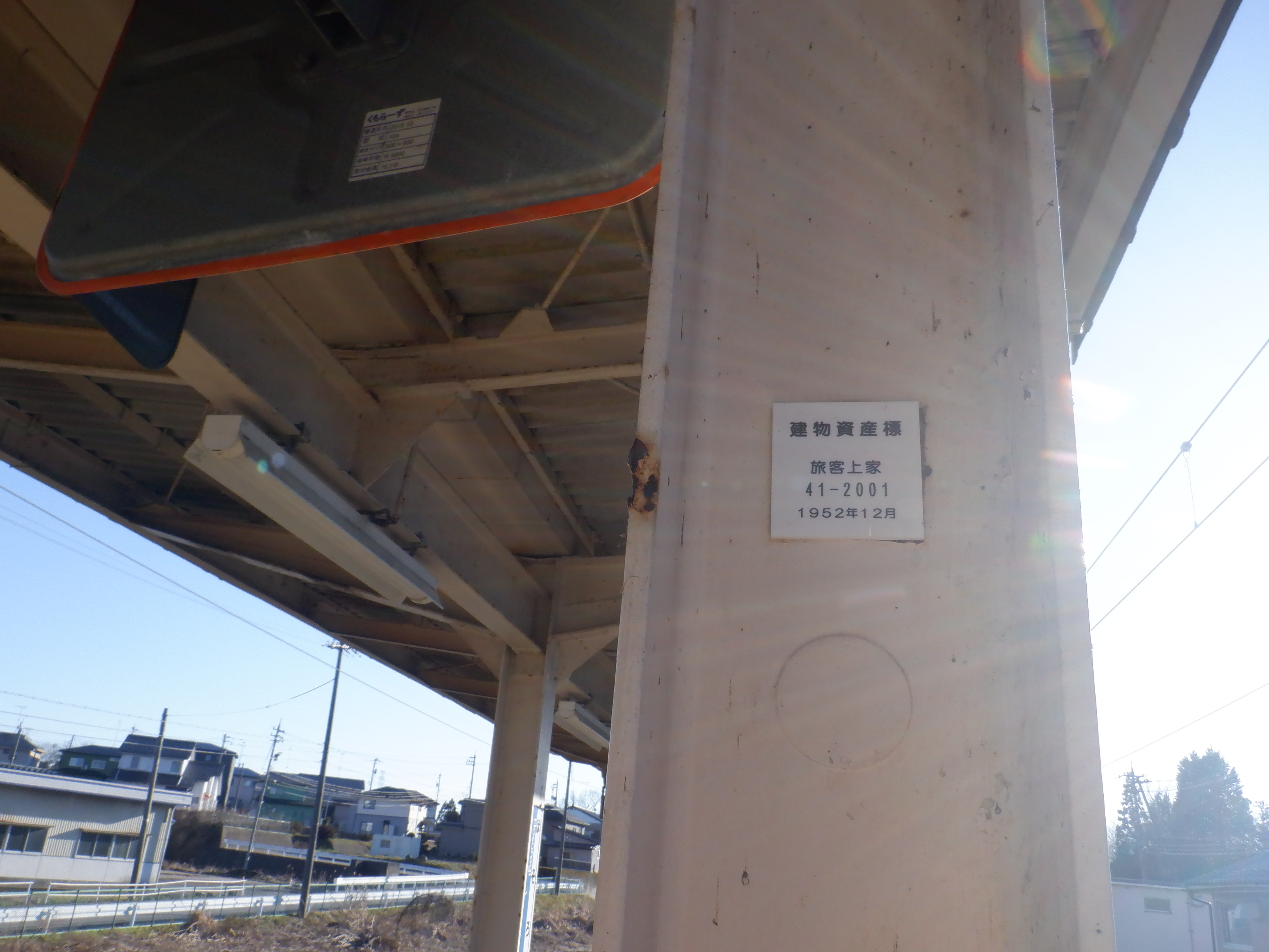 駅舎の反対側から見た跨線橋と跨線橋の銘板。