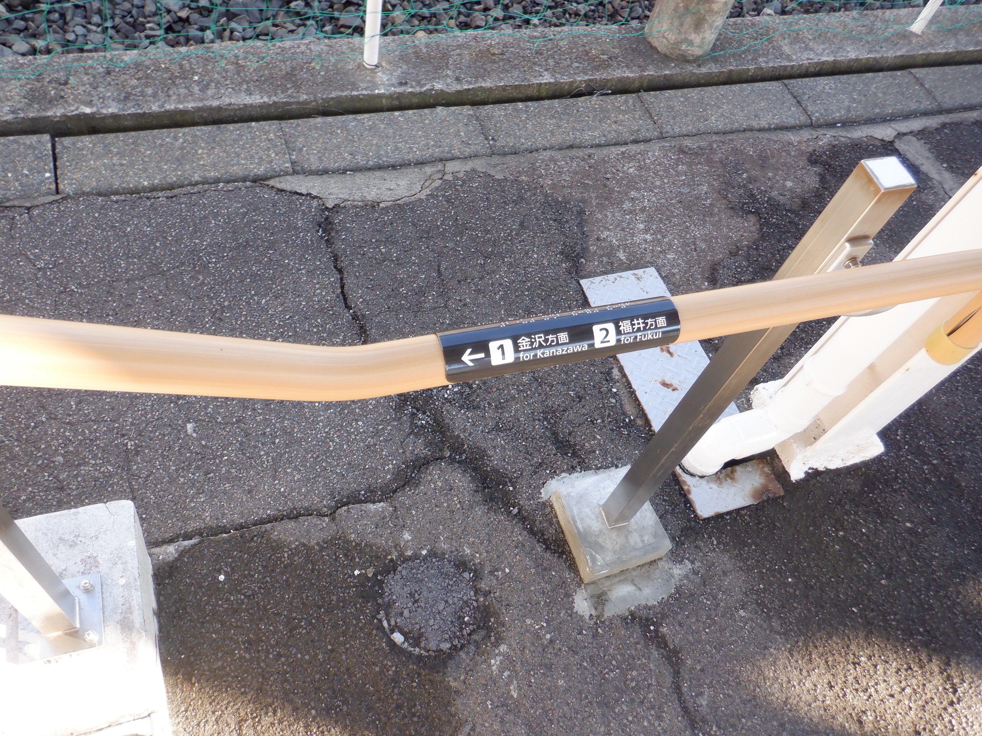 2番のりばの駅名標。下にハピラインふくいの駅名標が見えていて、その上からJRの駅名標がシールで貼られています。上部から水が入って膨らんだ様子は解消されています。
