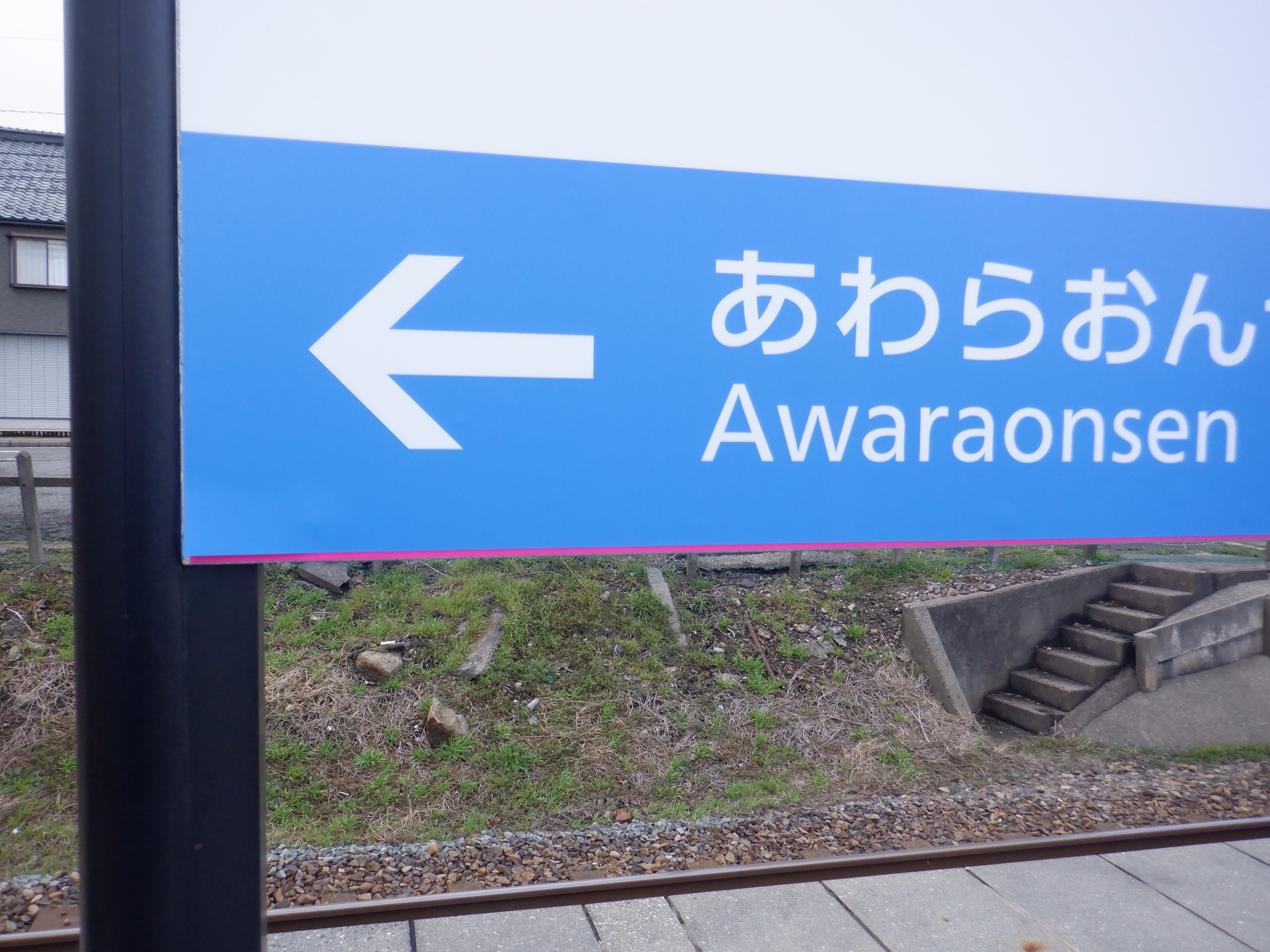 ハピラインふくいの駅名標が設置され、その上にJRの駅名標が貼られていました。
