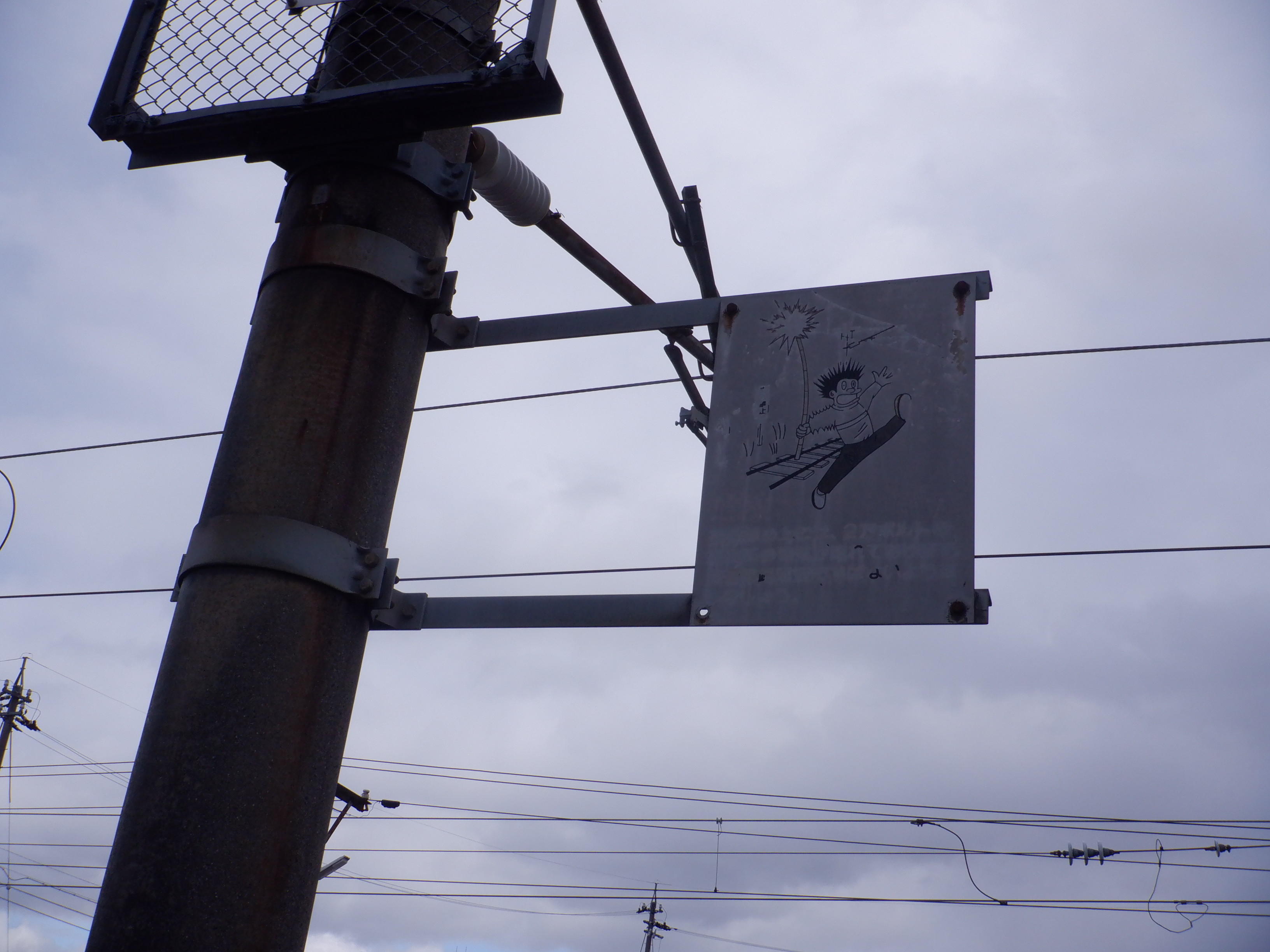 架線の注意書き。国鉄からJRを経てハピラインふくいまで、もうすぐです。