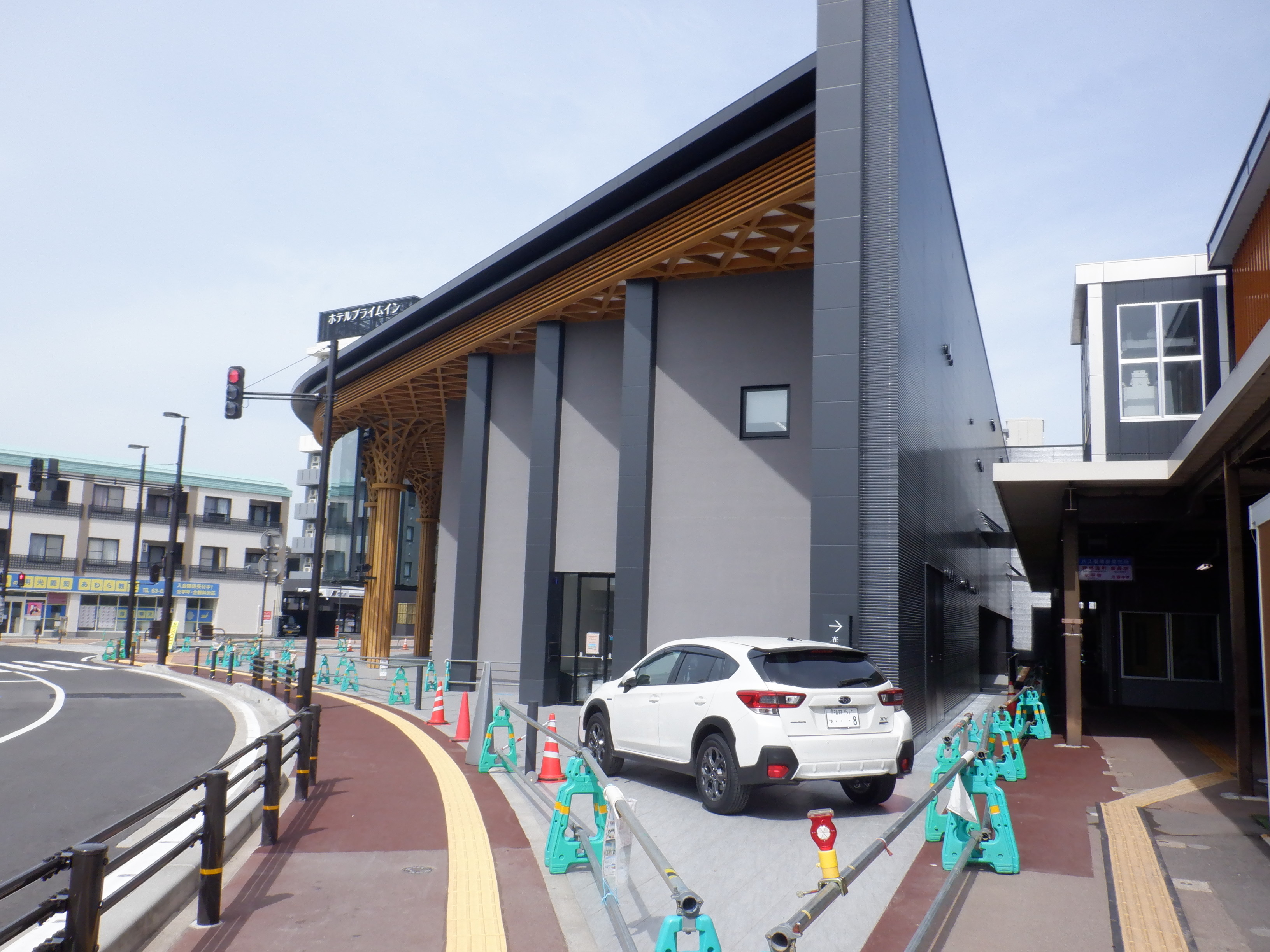 西口の新幹線駅舎と交通広場。