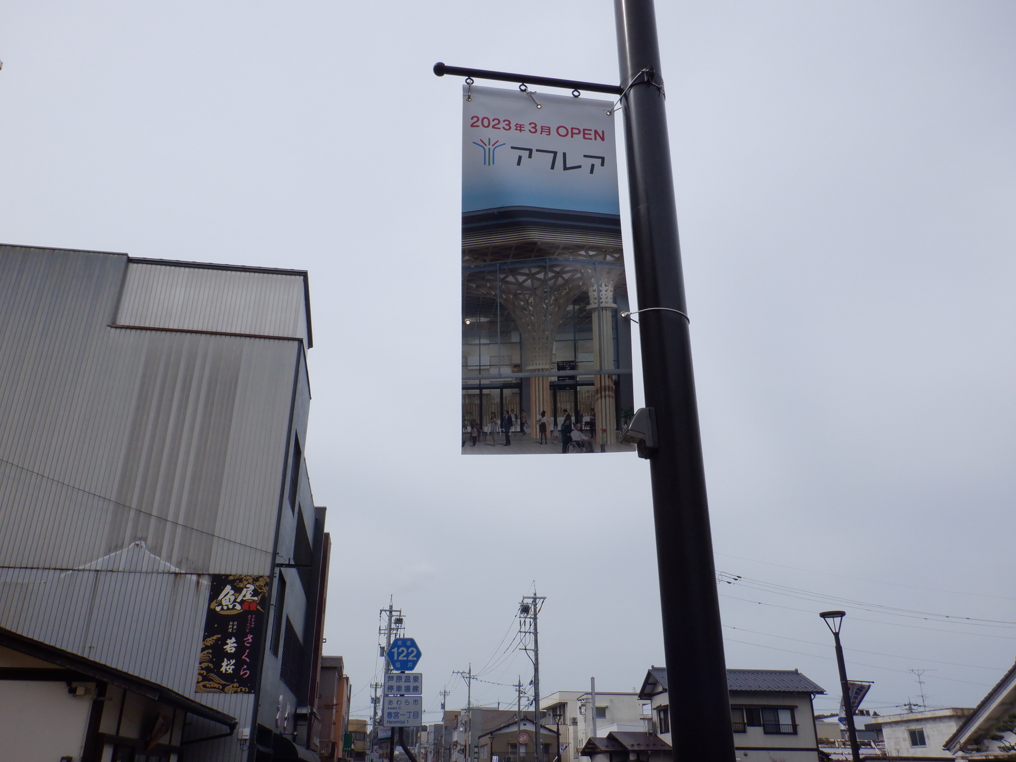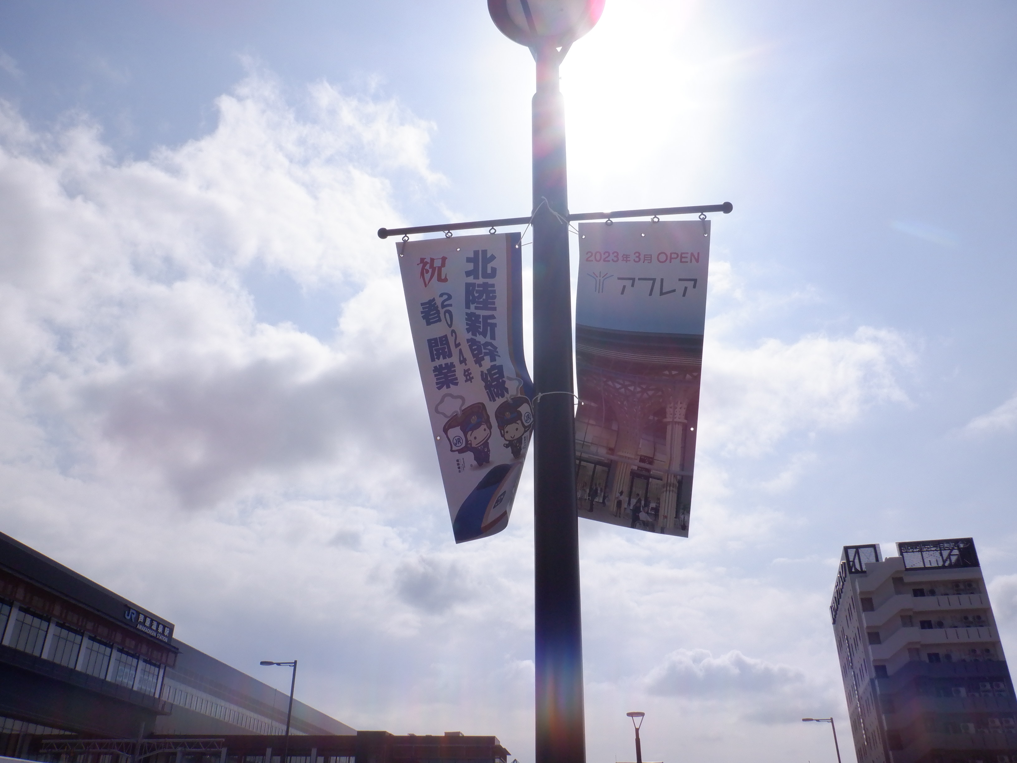 新幹線開業とアフレアオープンに向けた布が取り付けられていました。