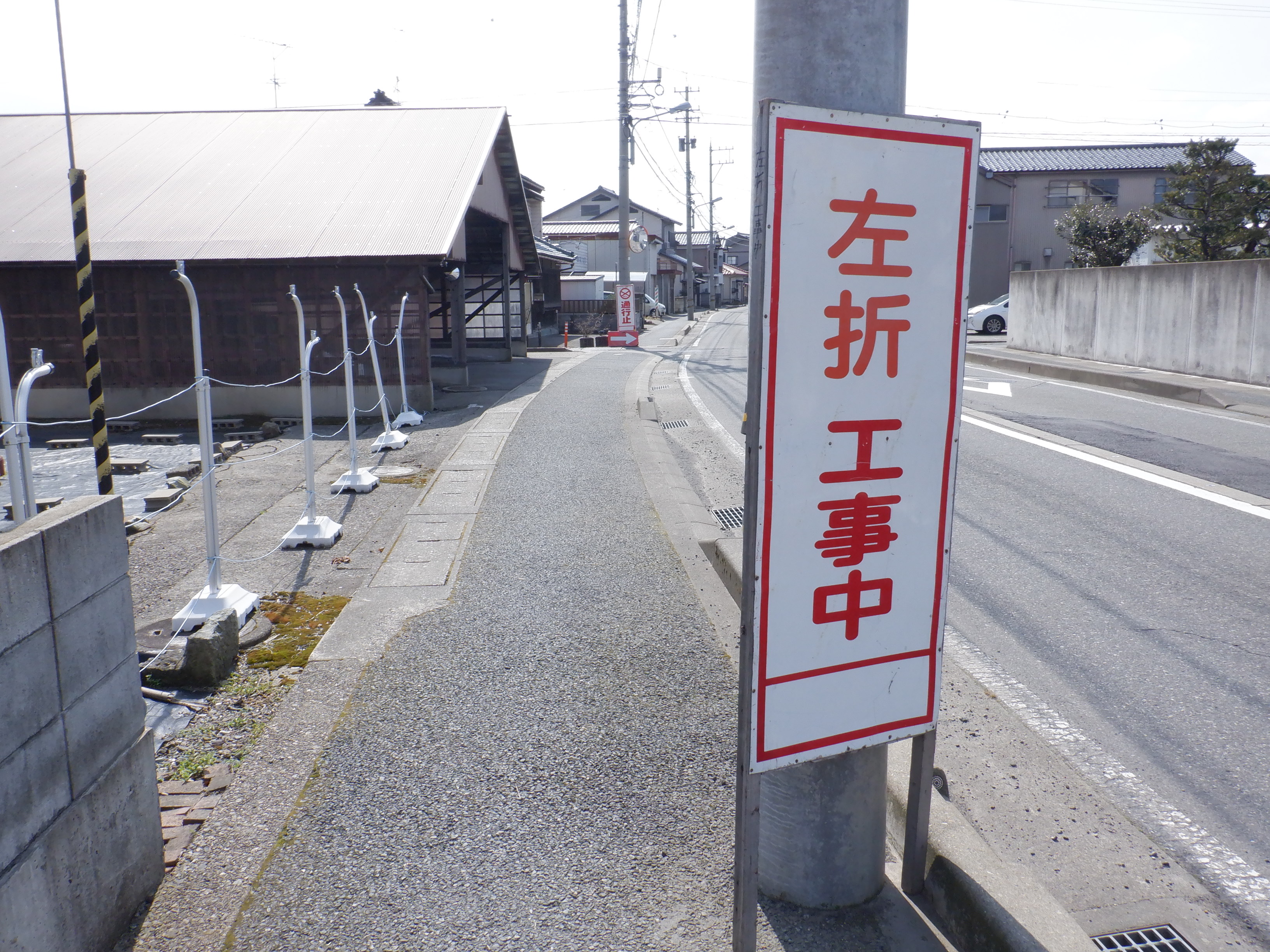 普段通り進もうとすると、西口からの道路延長部分の工事のため、橋を渡ったところで通行止めになっていました。