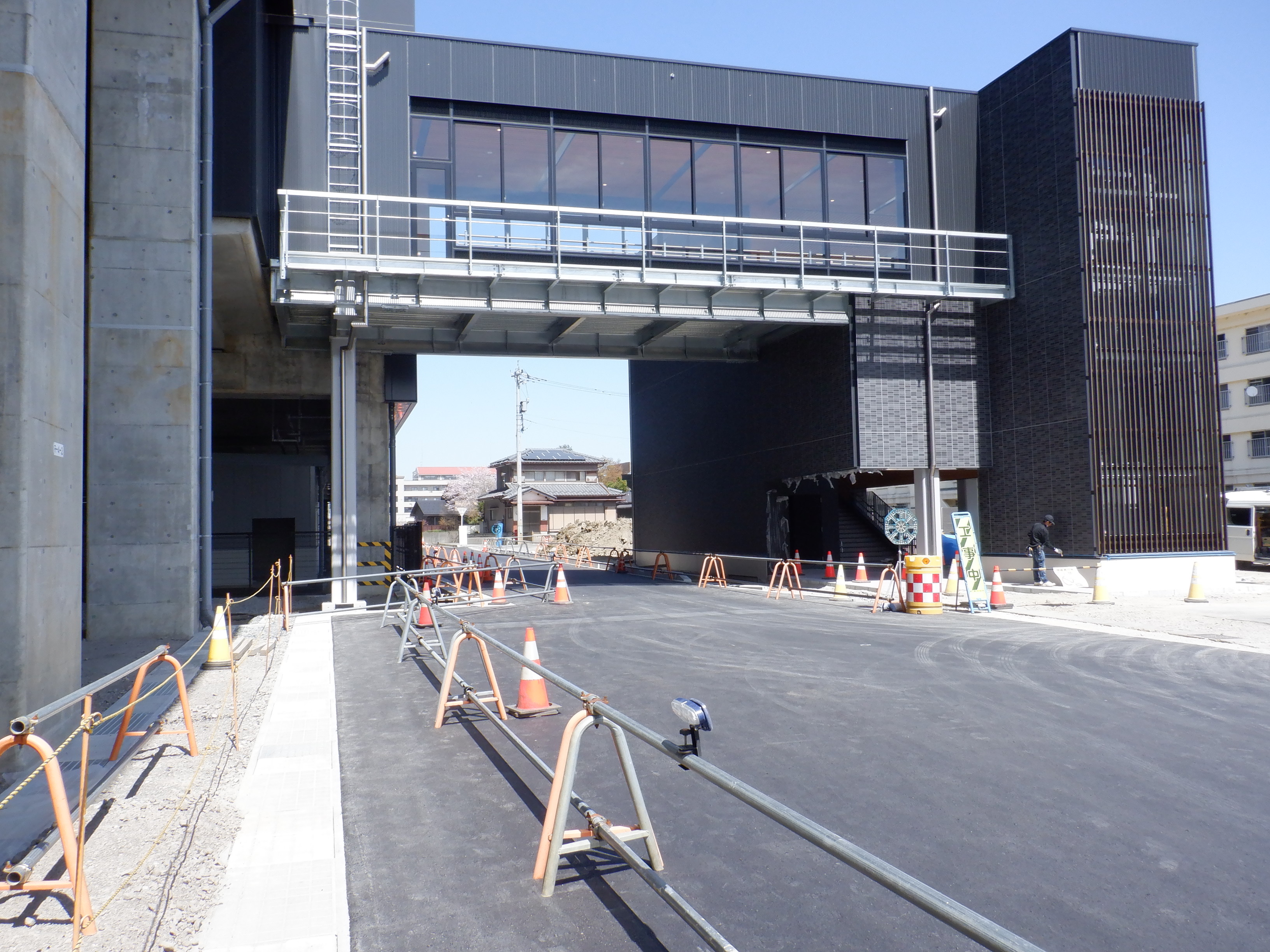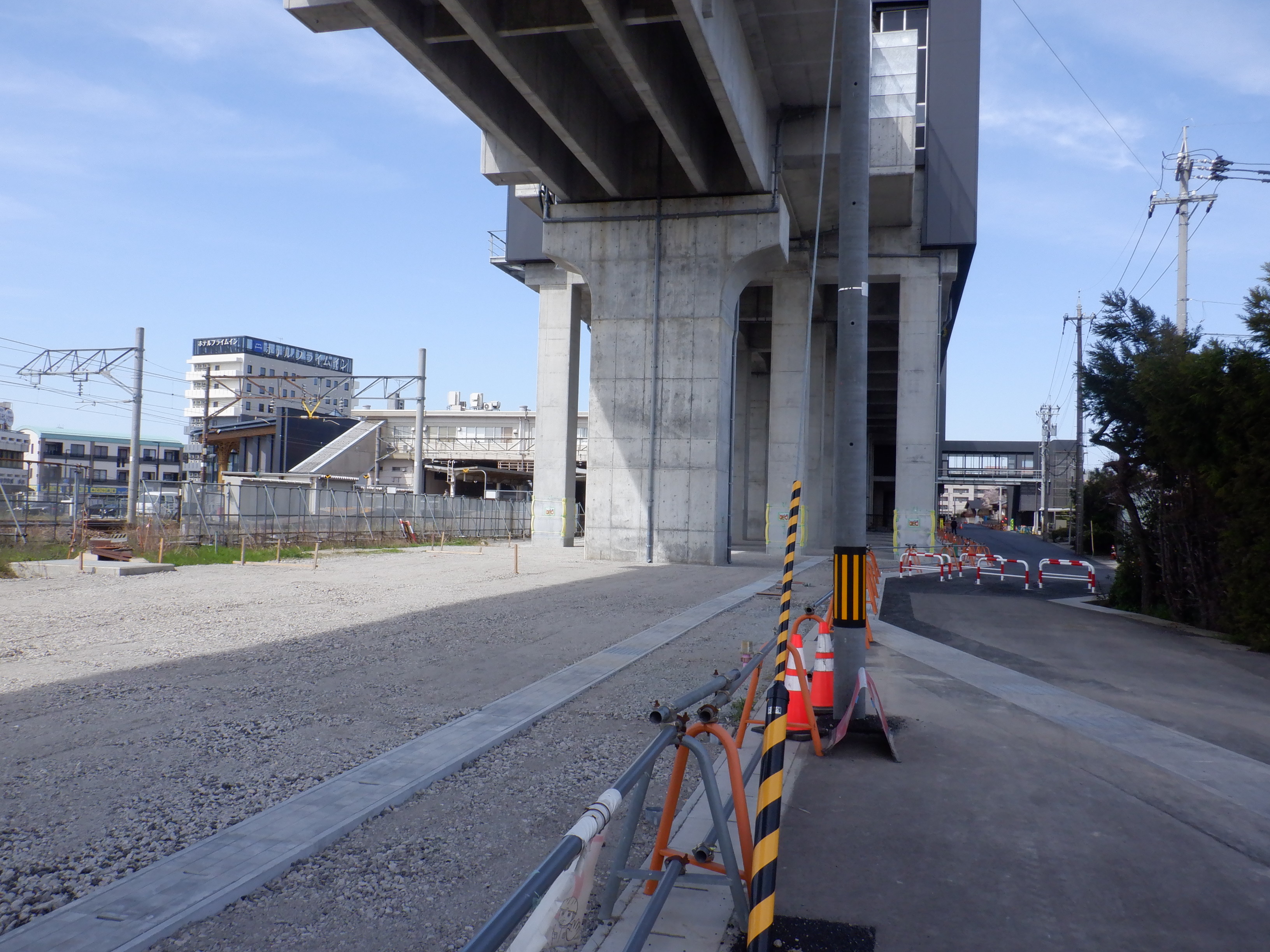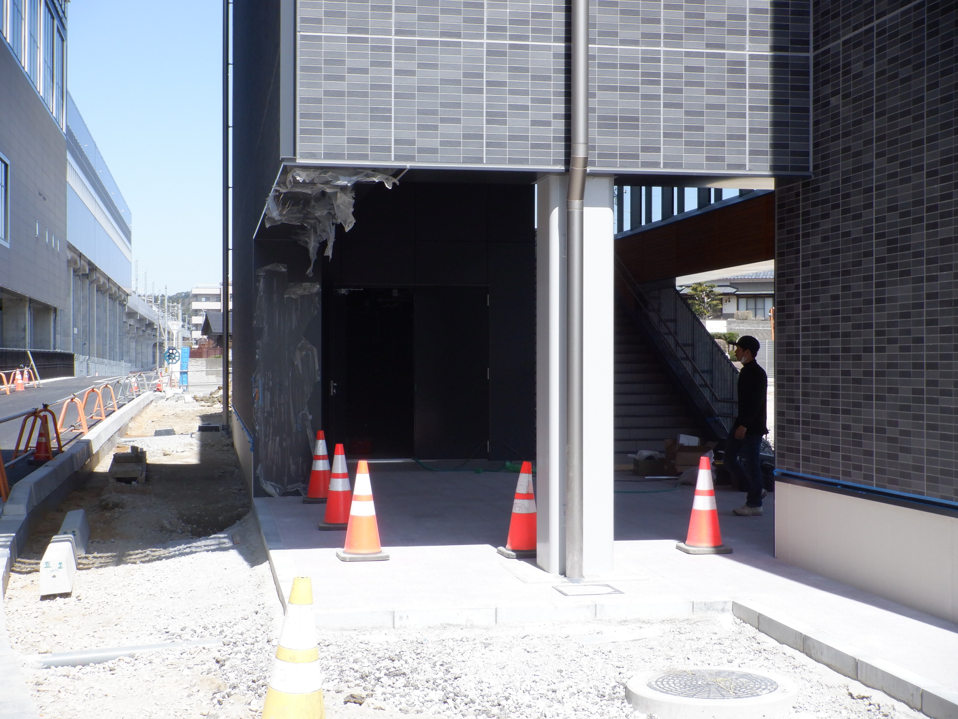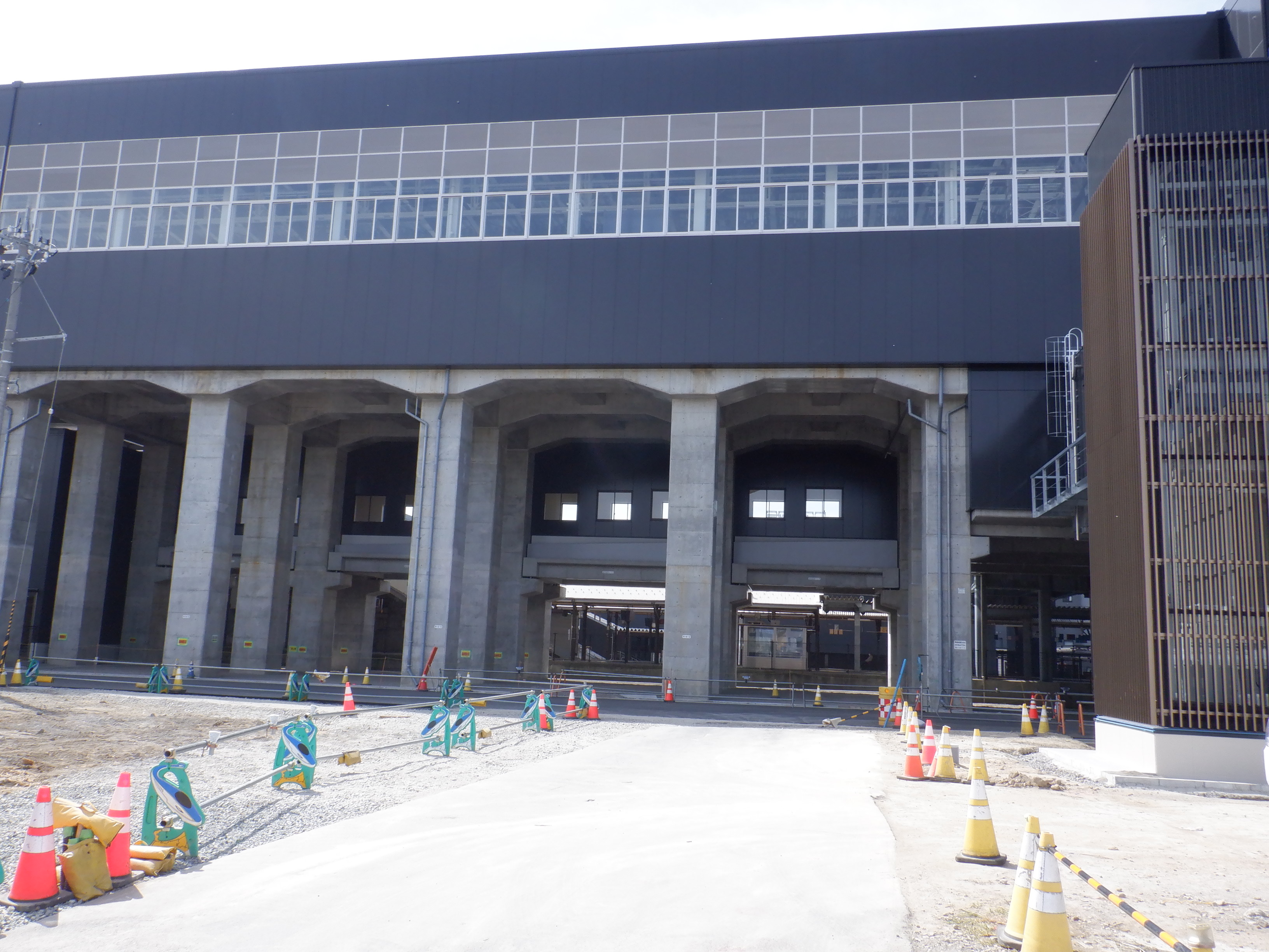 東口の交通広場と新幹線駅舎出入口建設中の様子、東口の出入口側。足場が取れてきれいに見えるようになりました。また、案内板も取り付けられています。