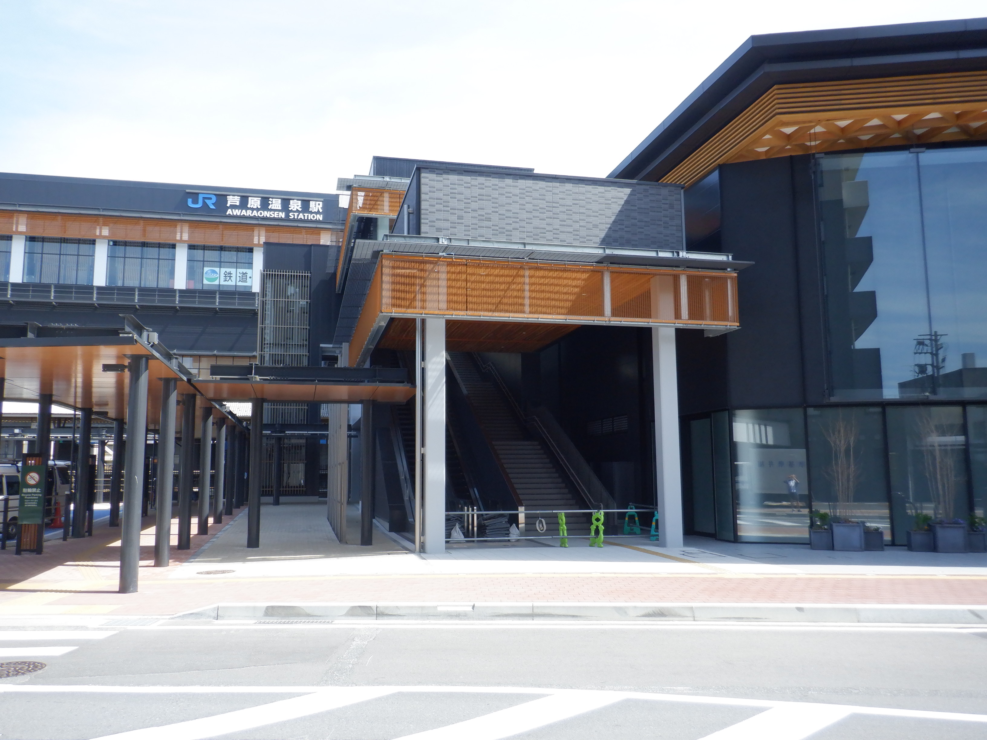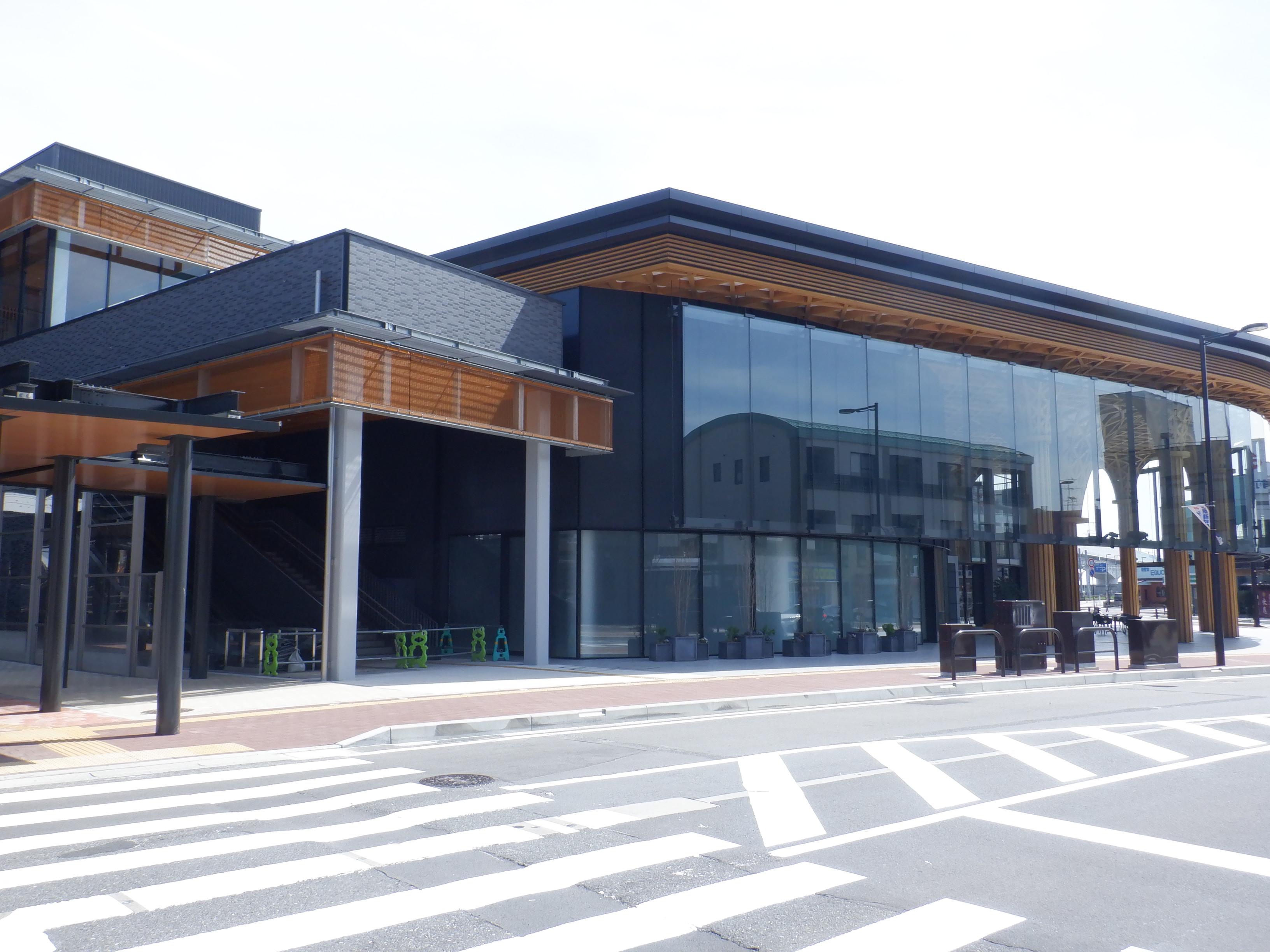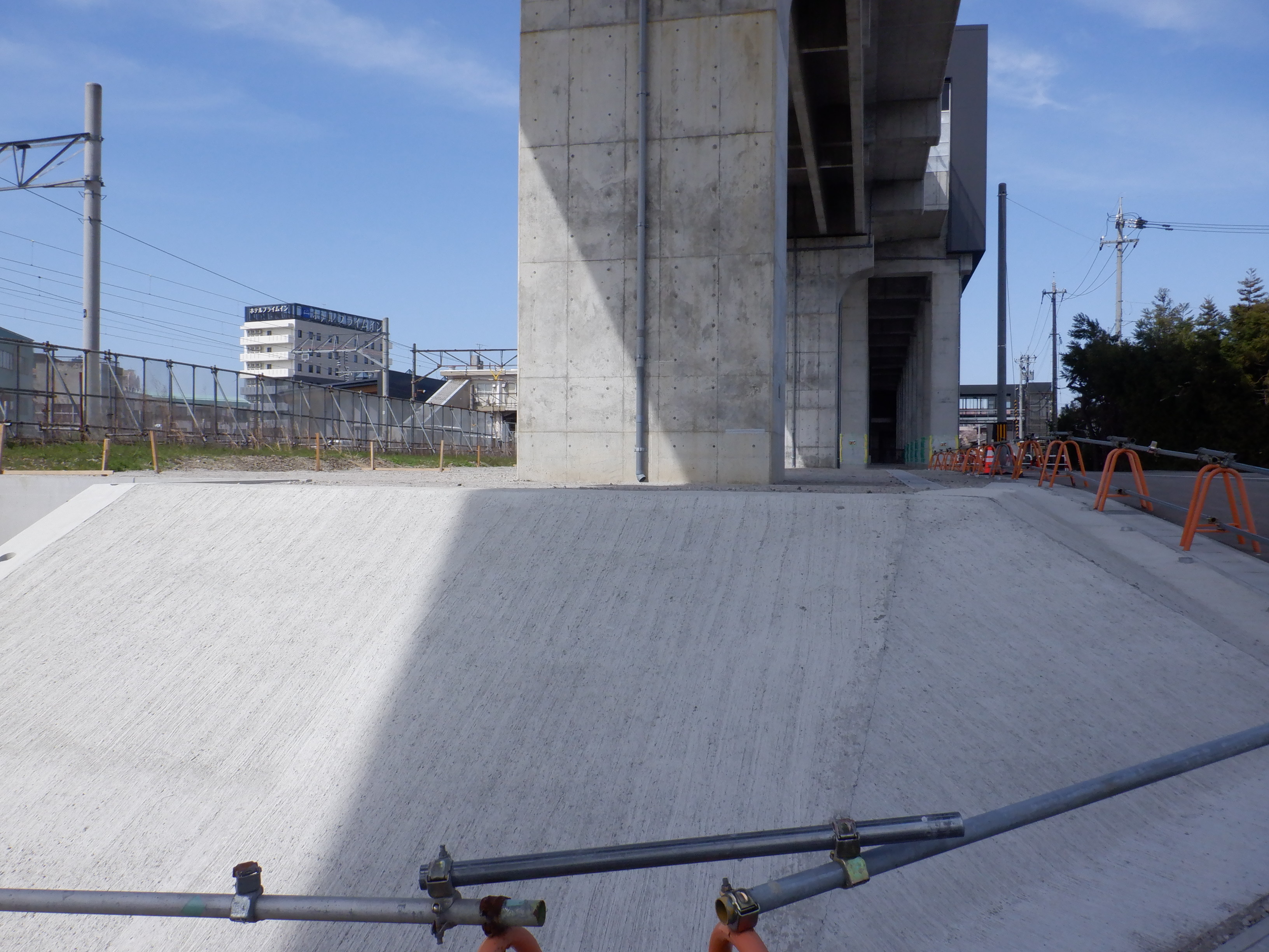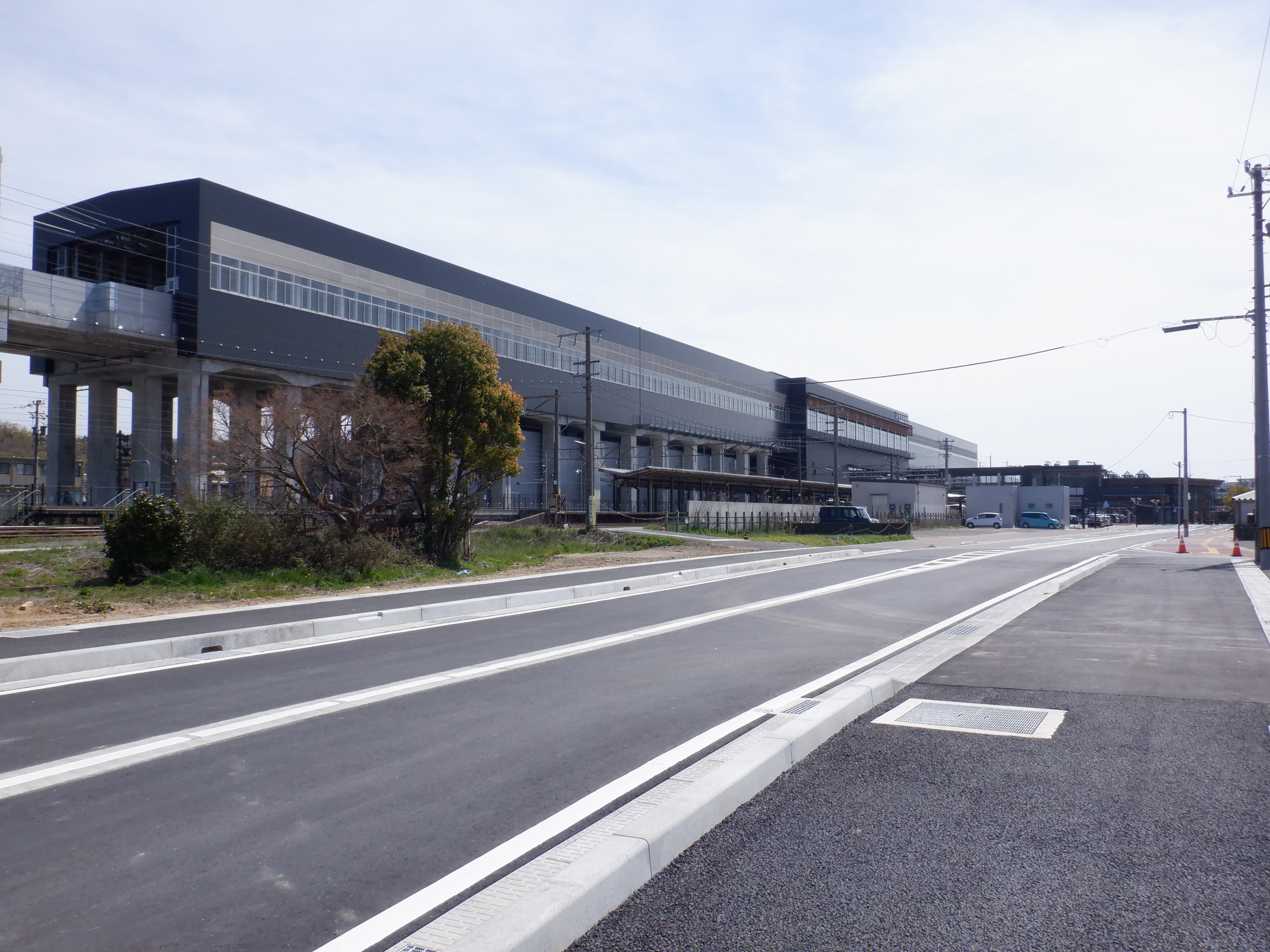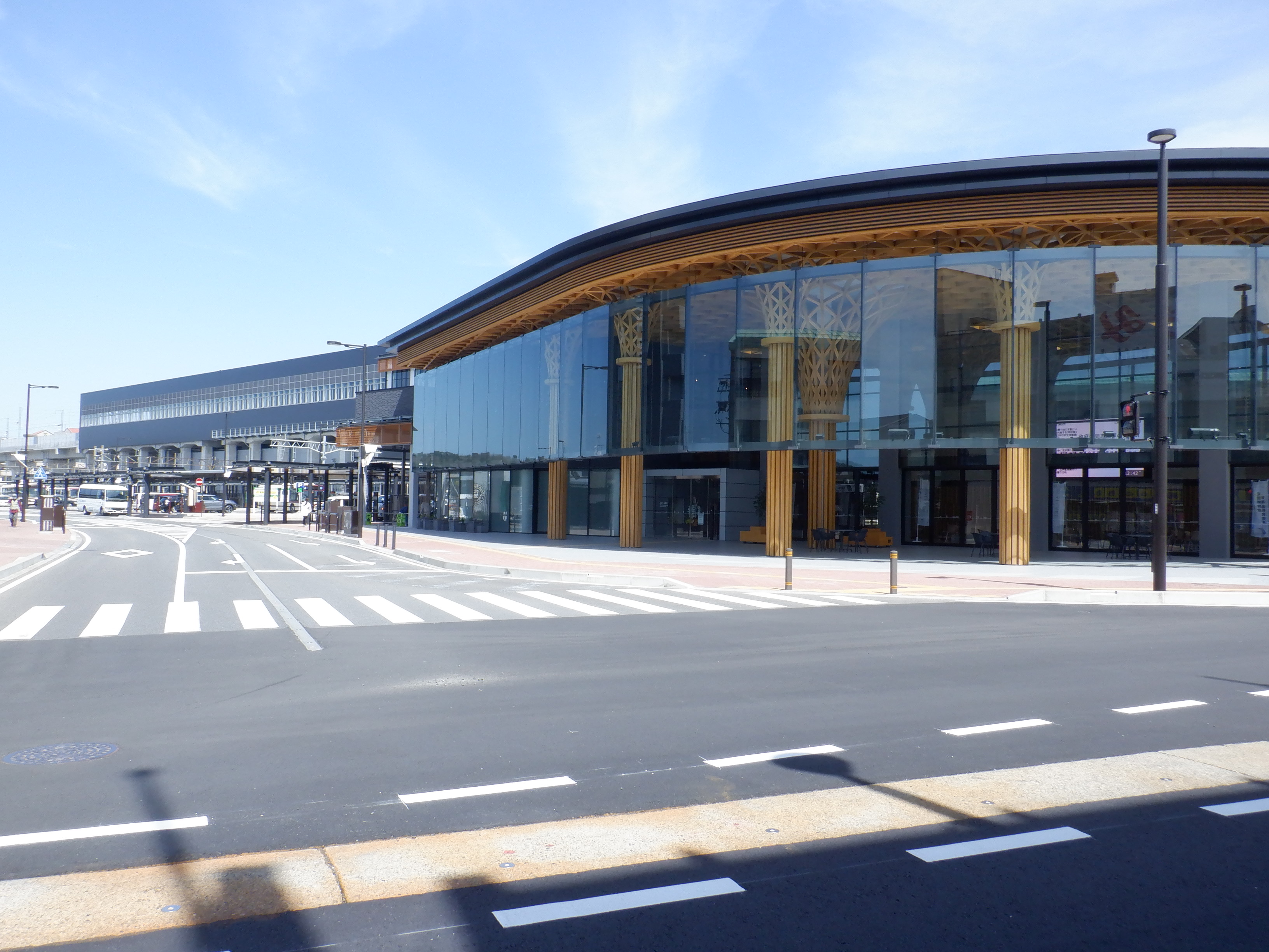 東口の交通広場と新幹線駅舎出入口建設中の様子、東口の出入口側。足場が取れてきれいに見えるようになりました。また、案内板も取り付けられています。