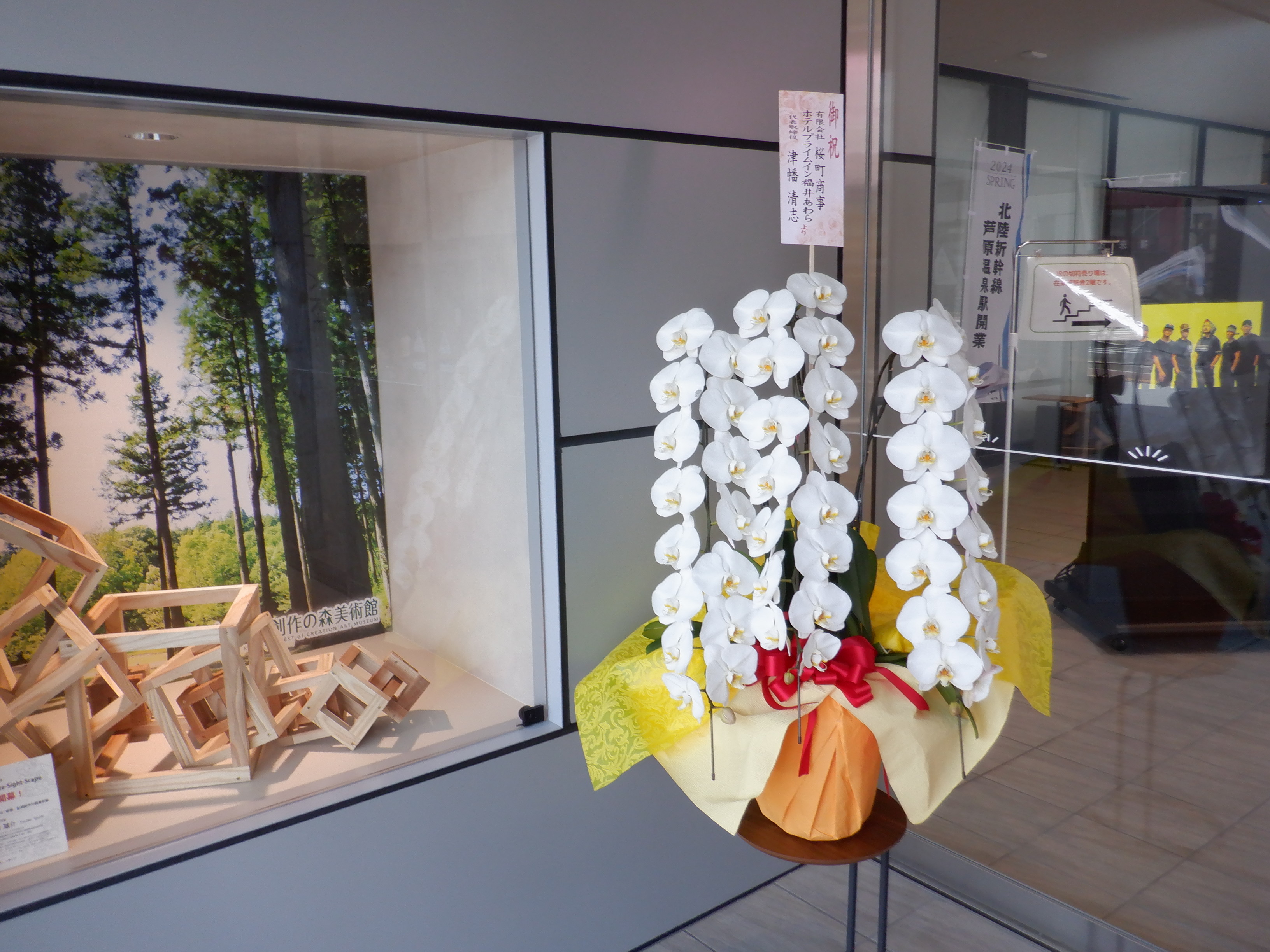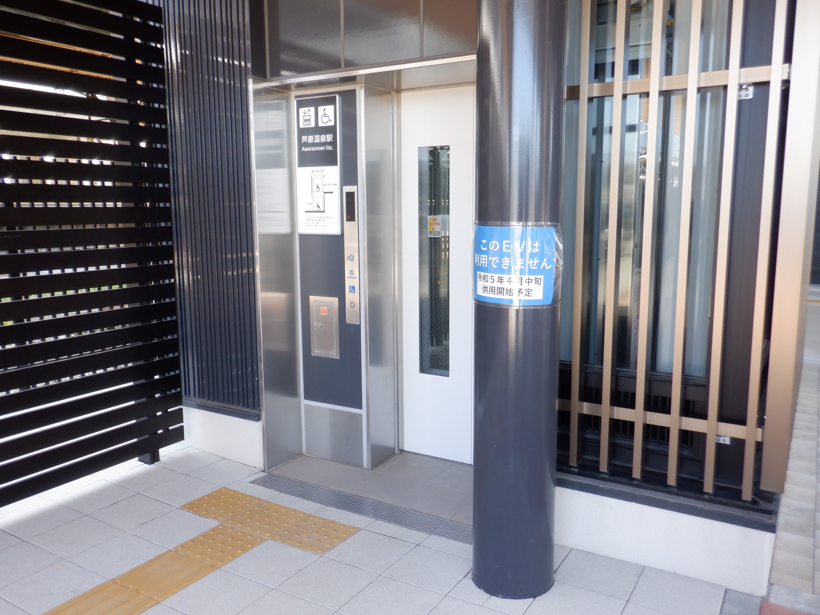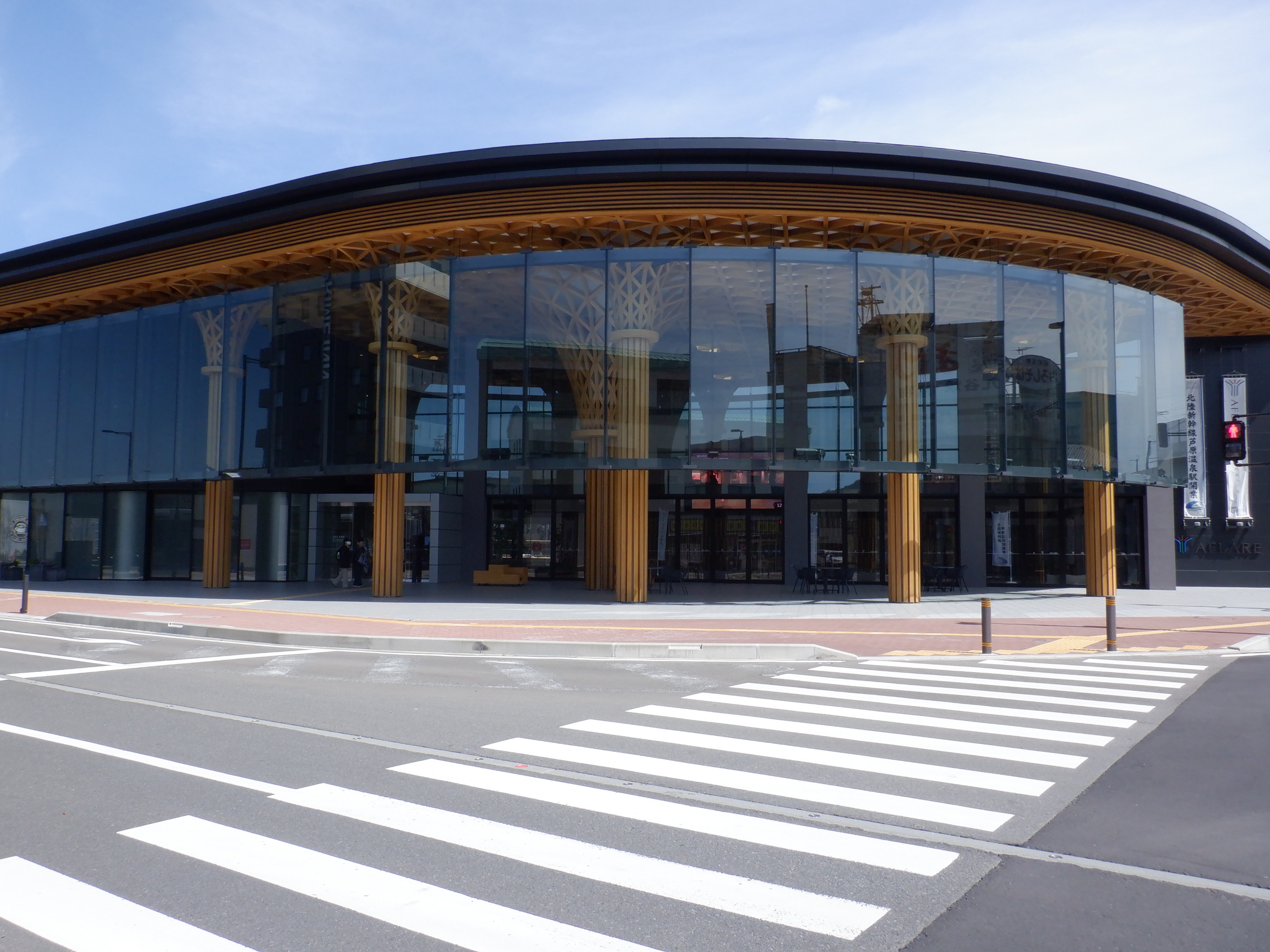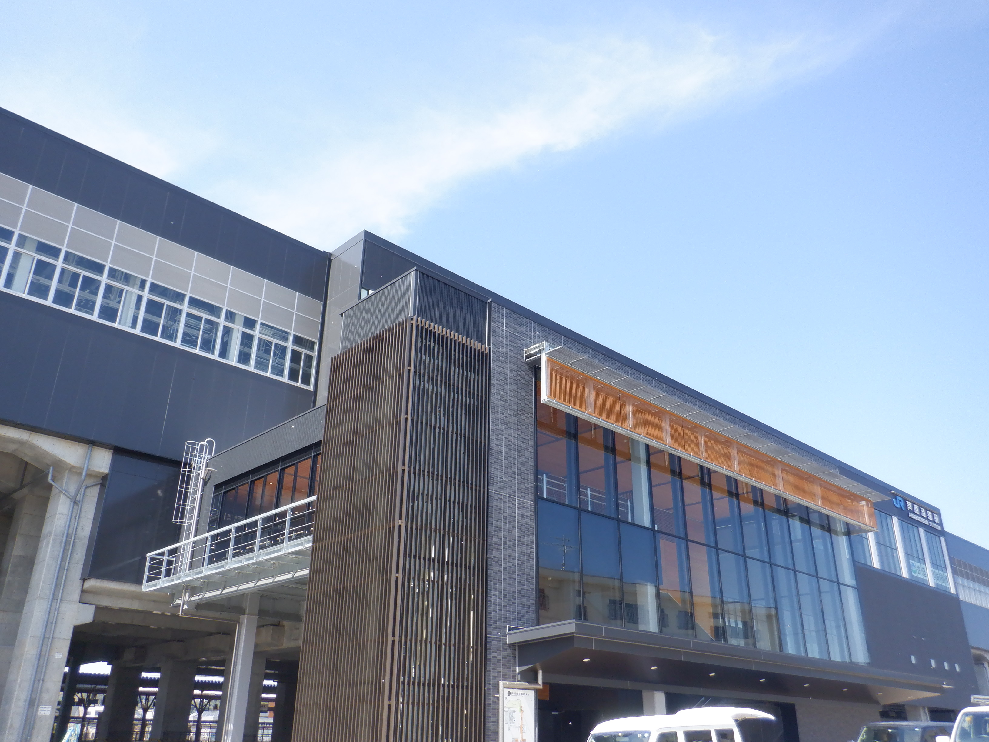 東口の交通広場と新幹線駅舎出入口建設中の様子、東口の出入口側。足場が取れてきれいに見えるようになりました。また、案内板も取り付けられています。