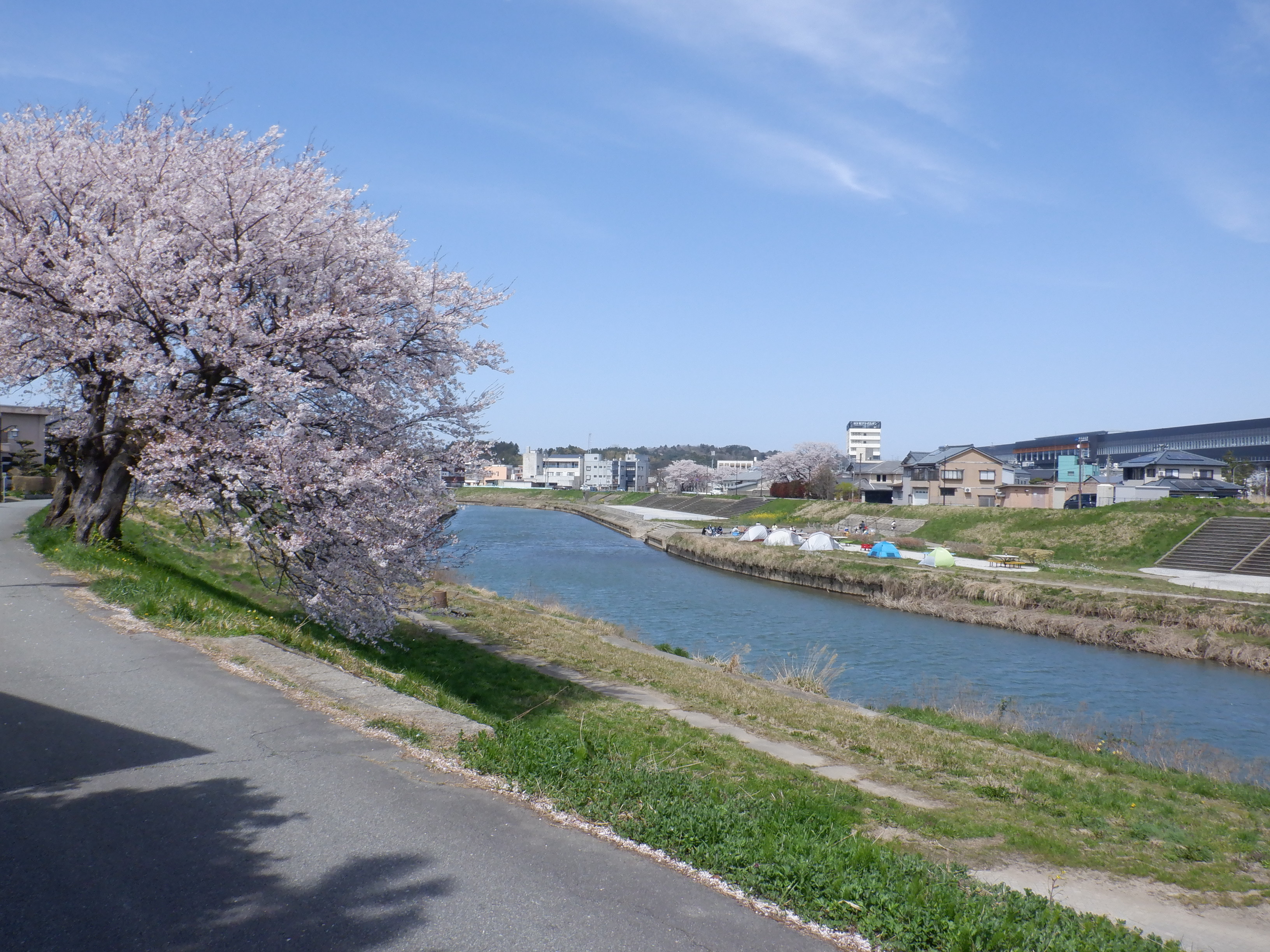 竹田川対岸から見た桜の花と芦原温泉駅。