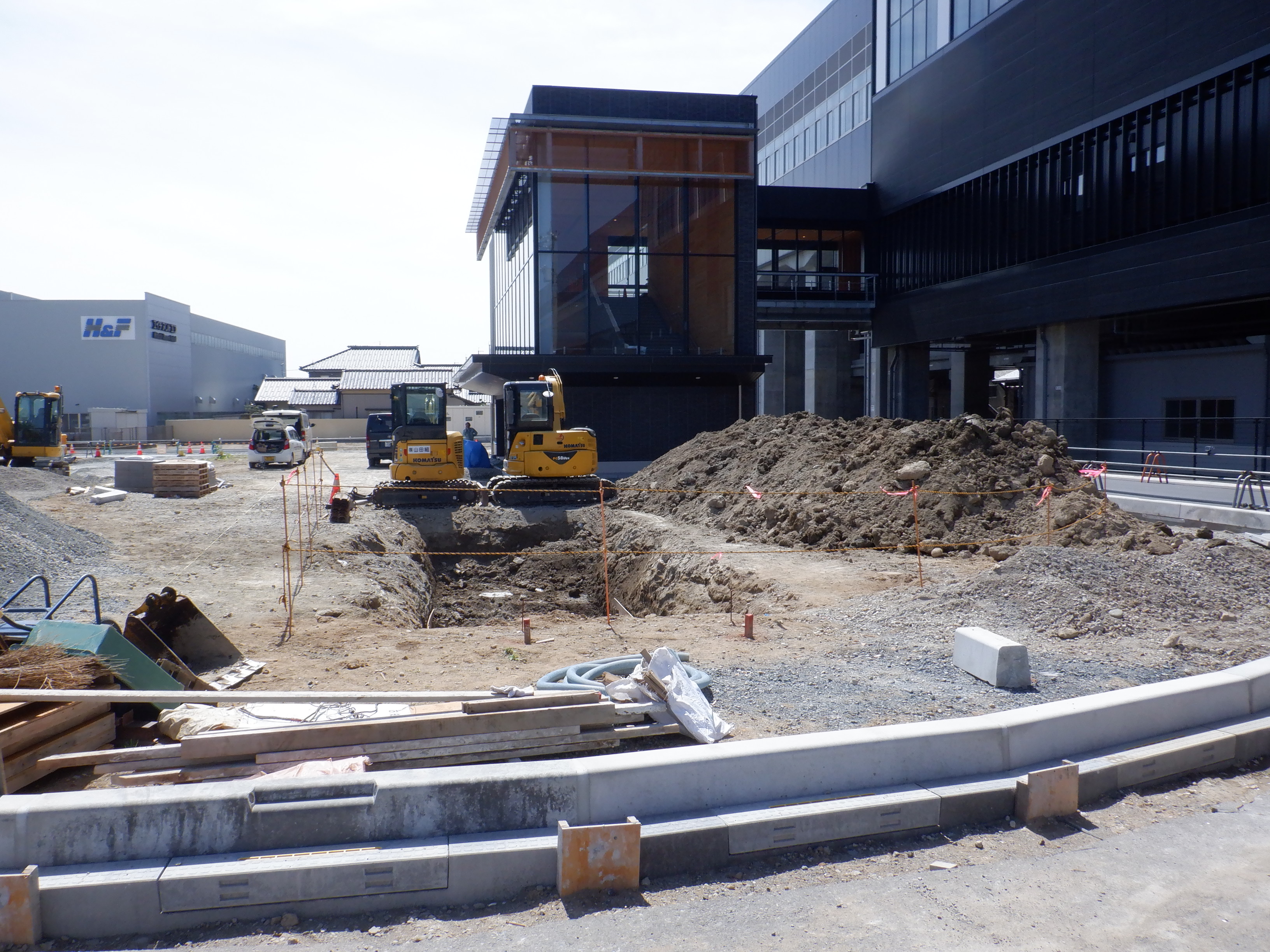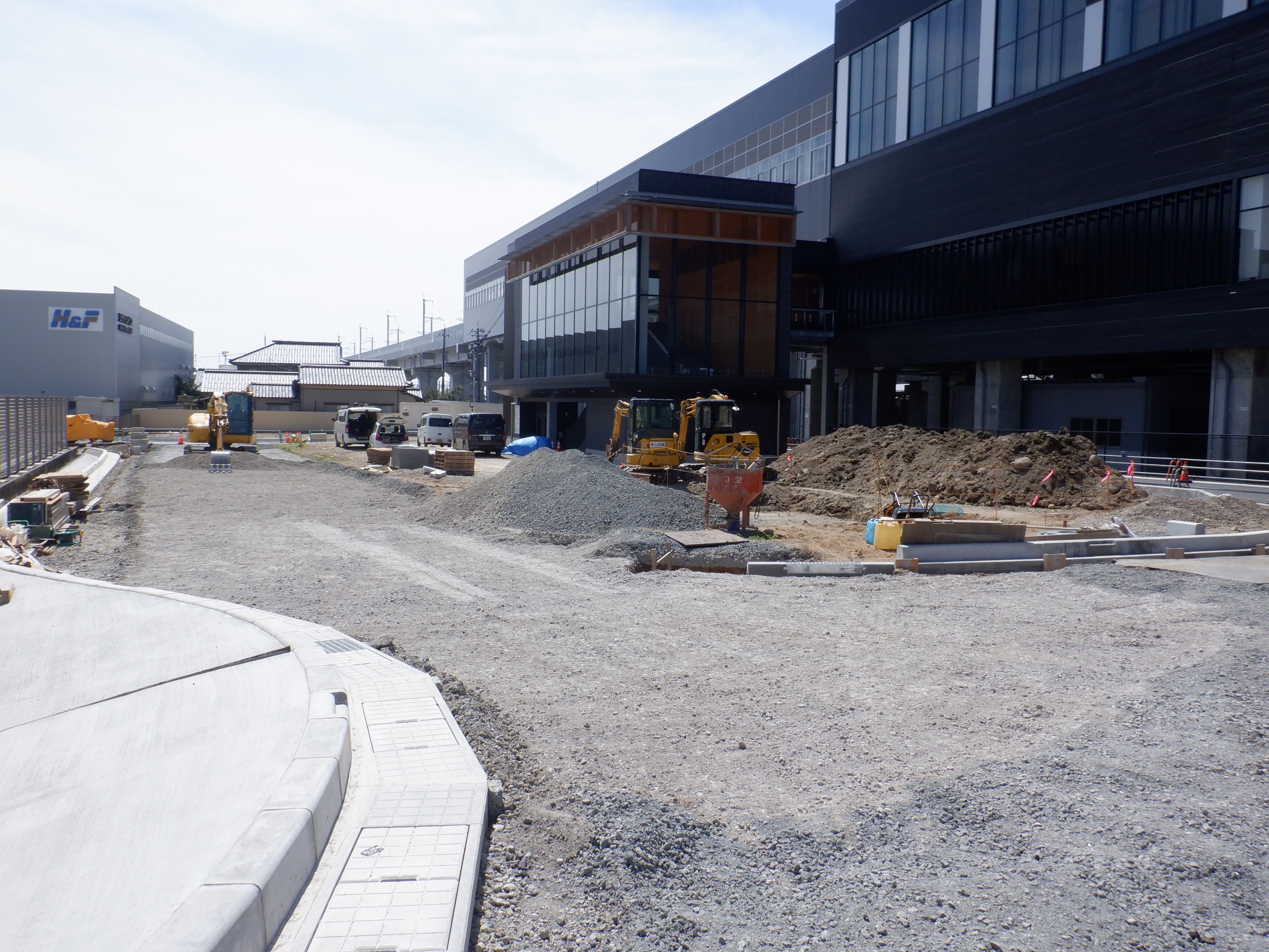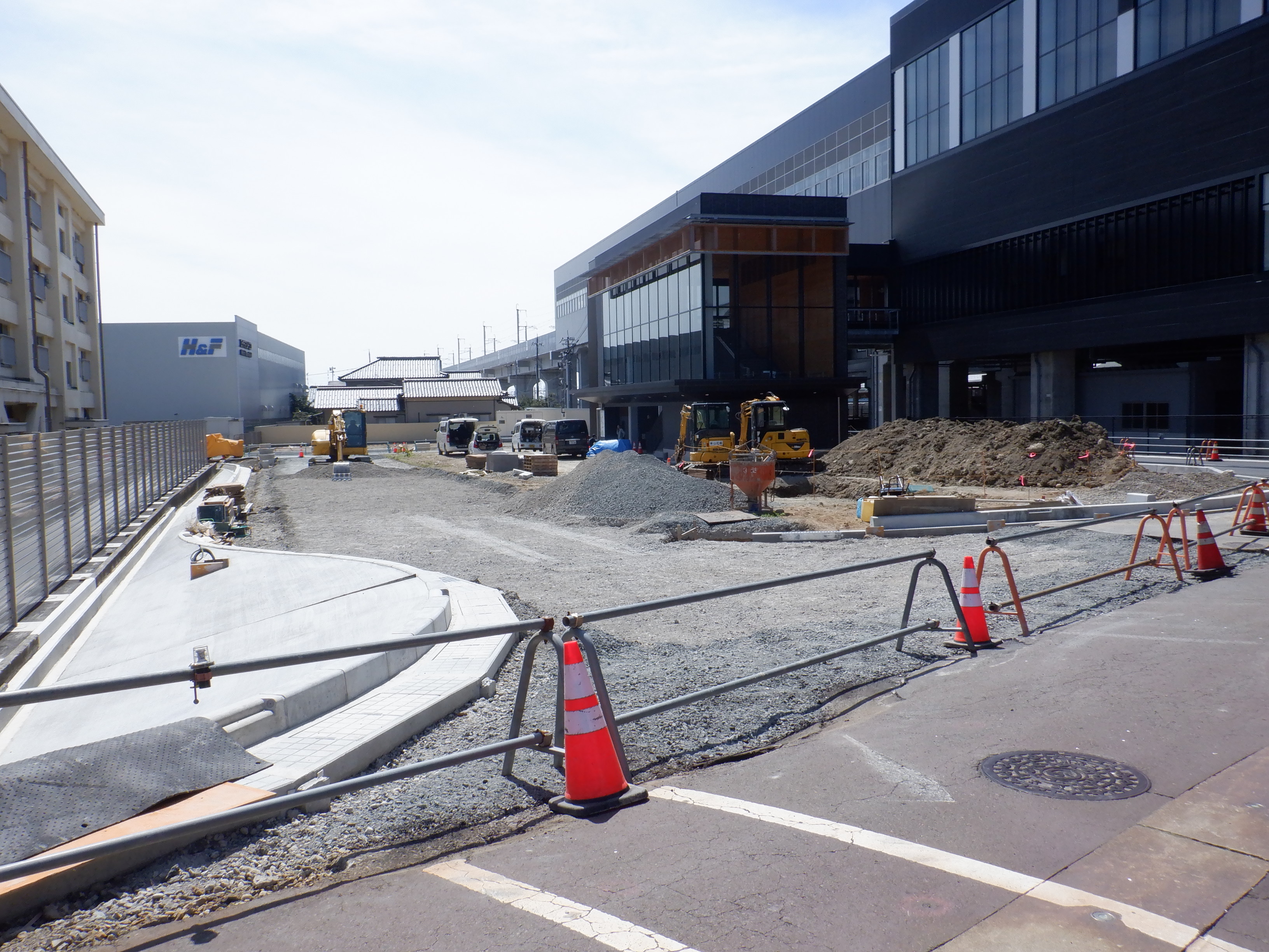 東口の交通広場と新幹線駅舎出入口建設中の様子、細呂木駅側から。陸橋下を通ることができるようになった代わりに、交通広場側の仮設通路は通行止めになり、広場建設が進んでいます。