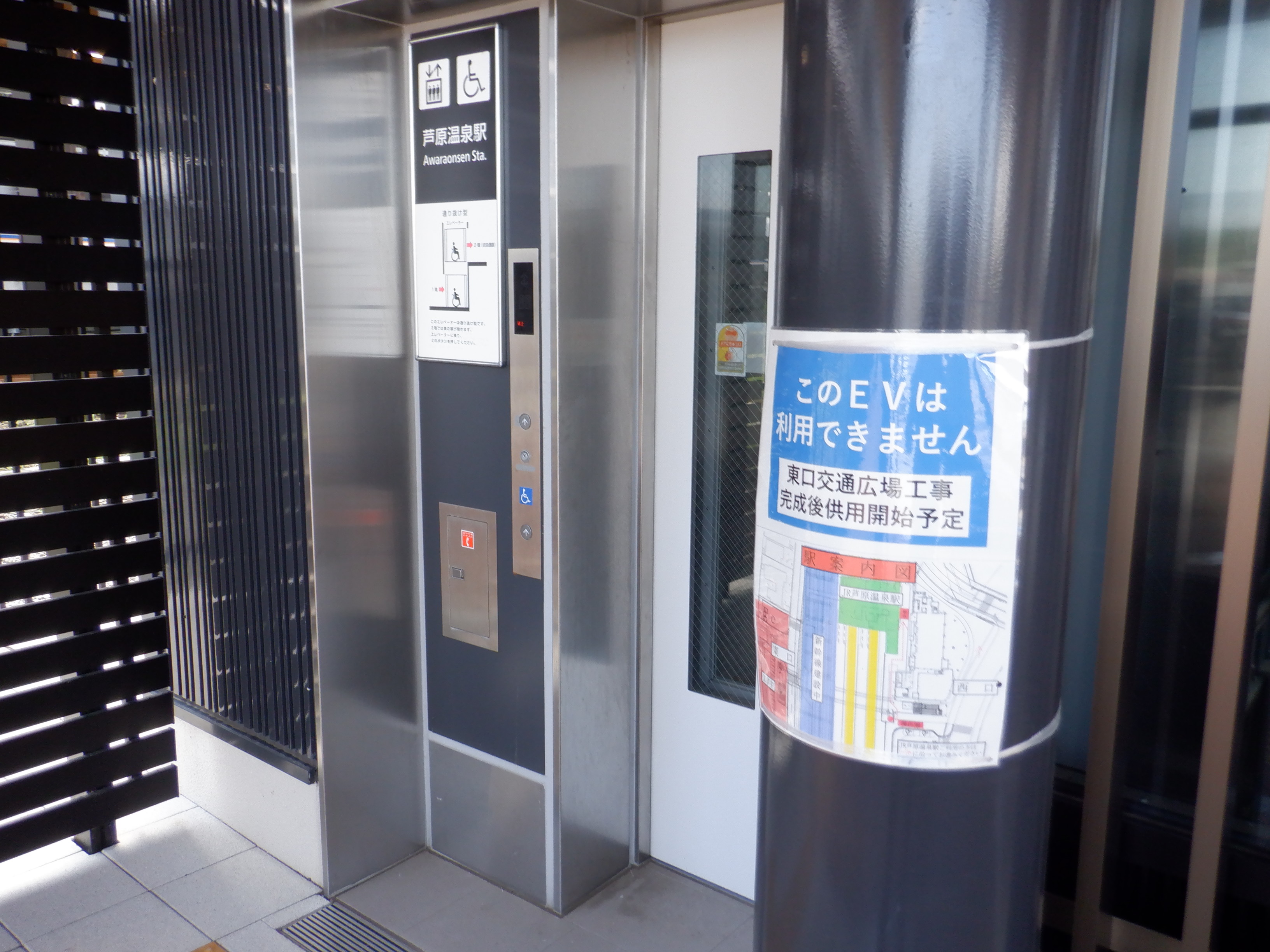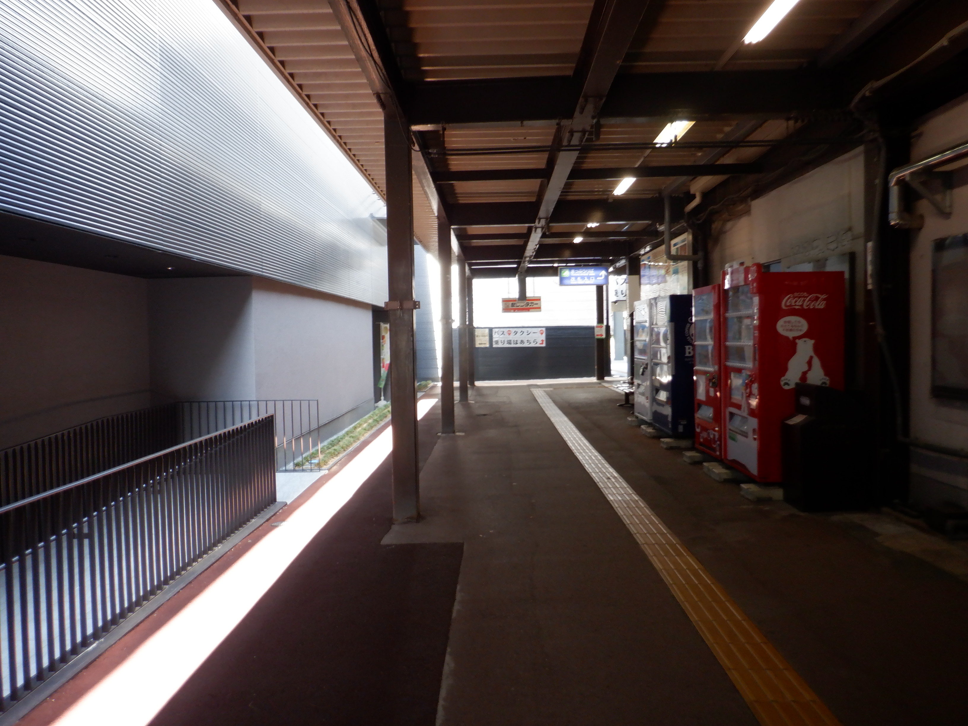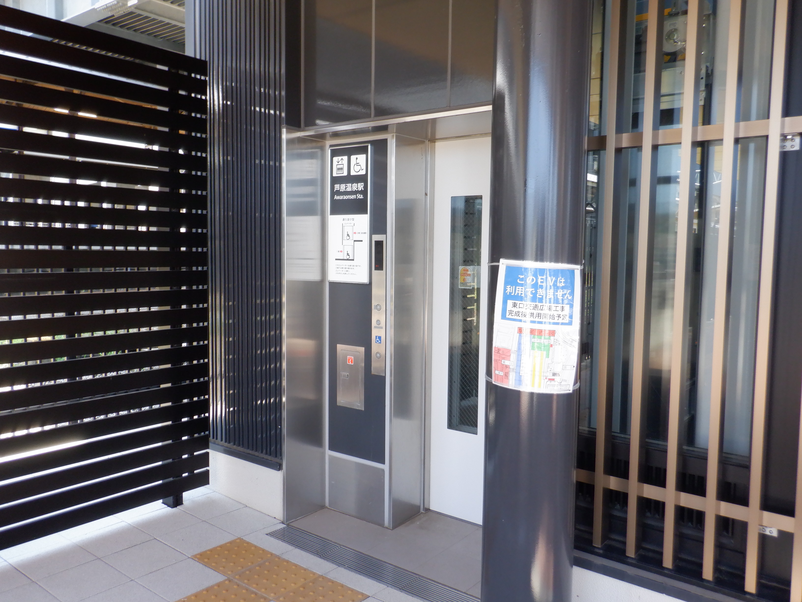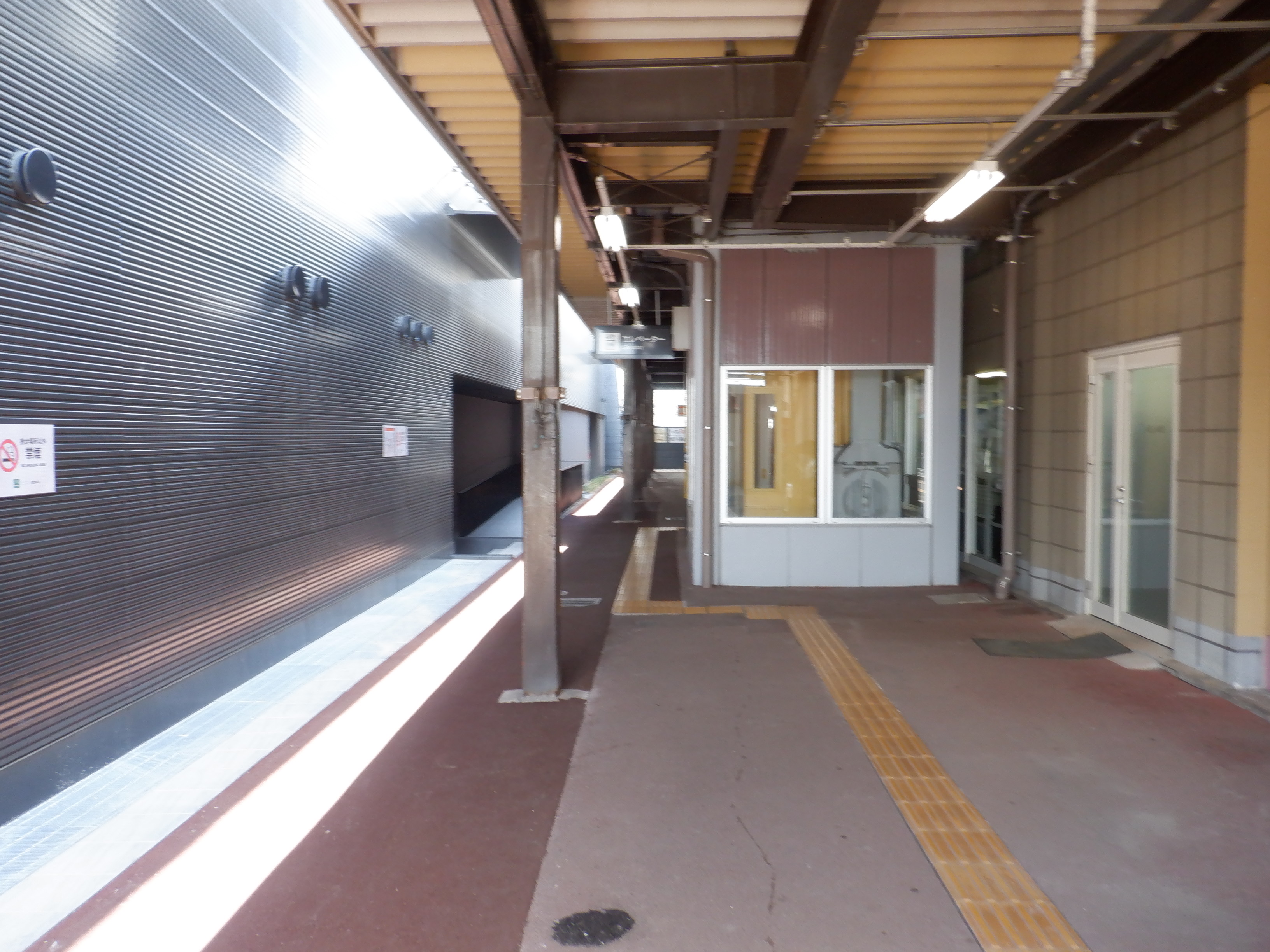 エレベーター前から見た駅舎の旧第一種駅名標など。