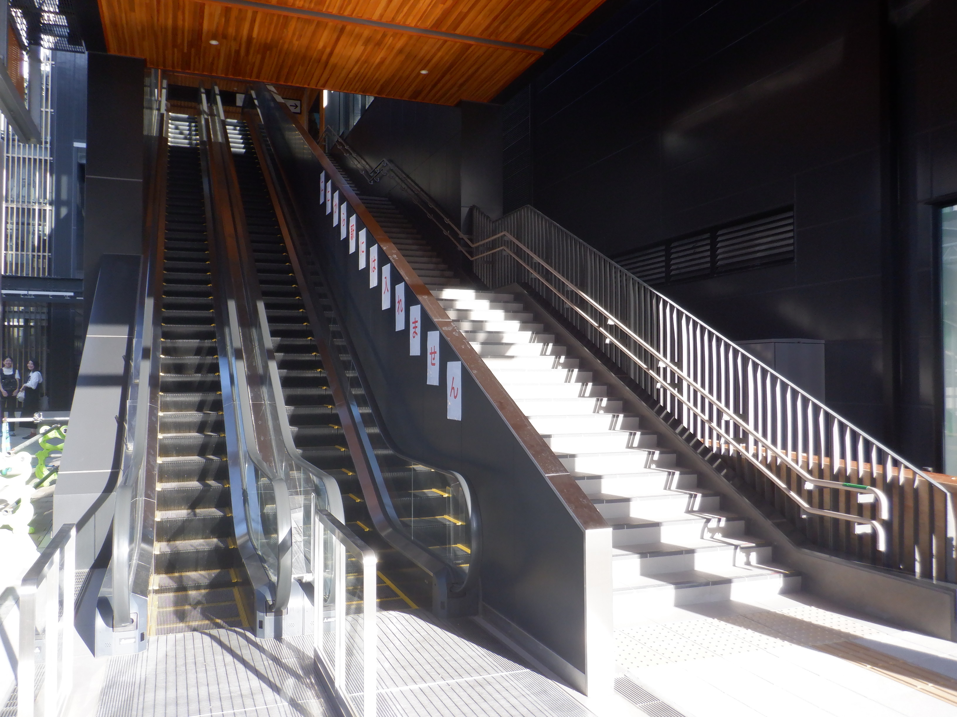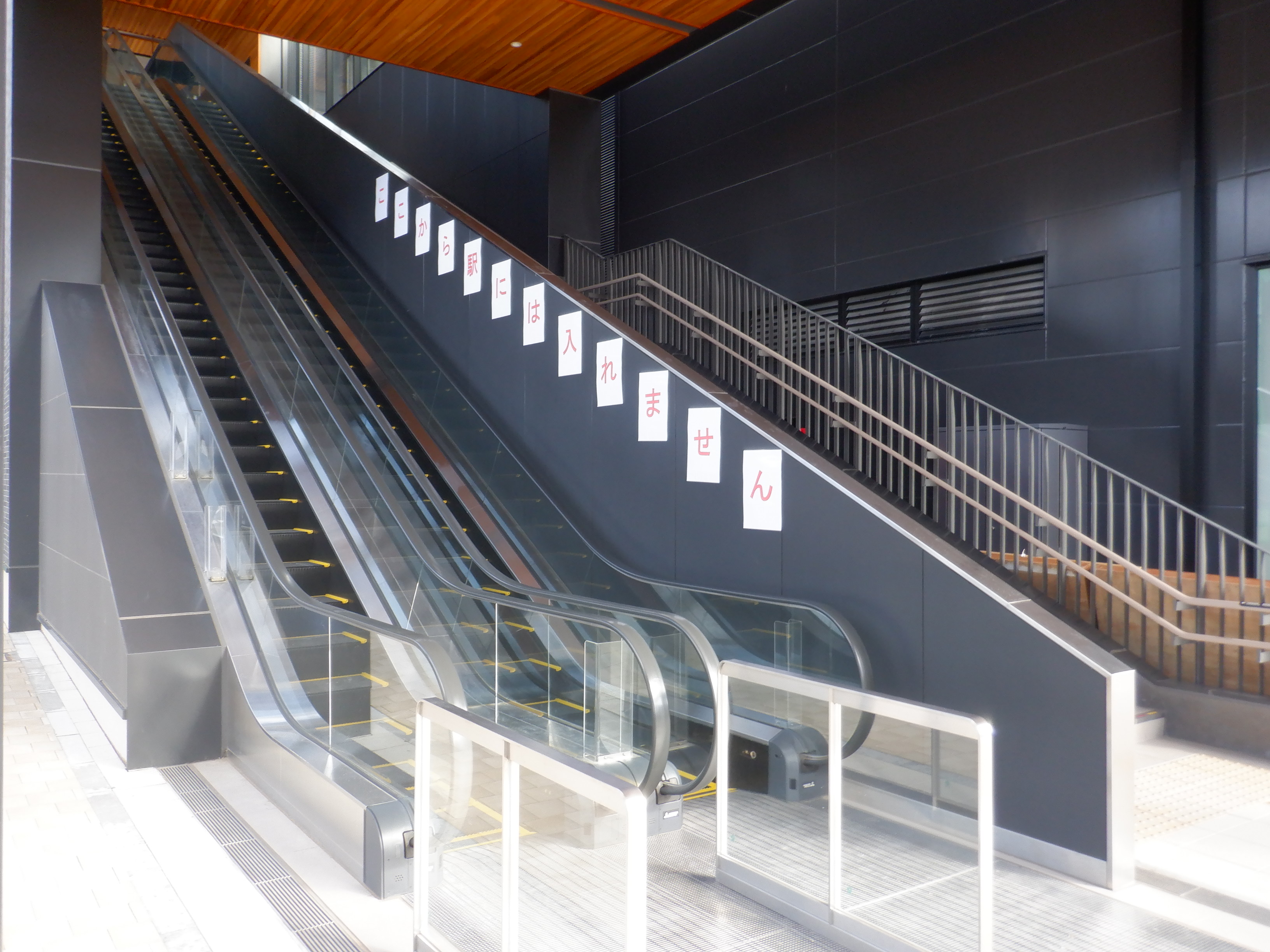 供用開始直前の自由通路出入口。駅に行けない旨の案内がエスカレーター横に貼られています。